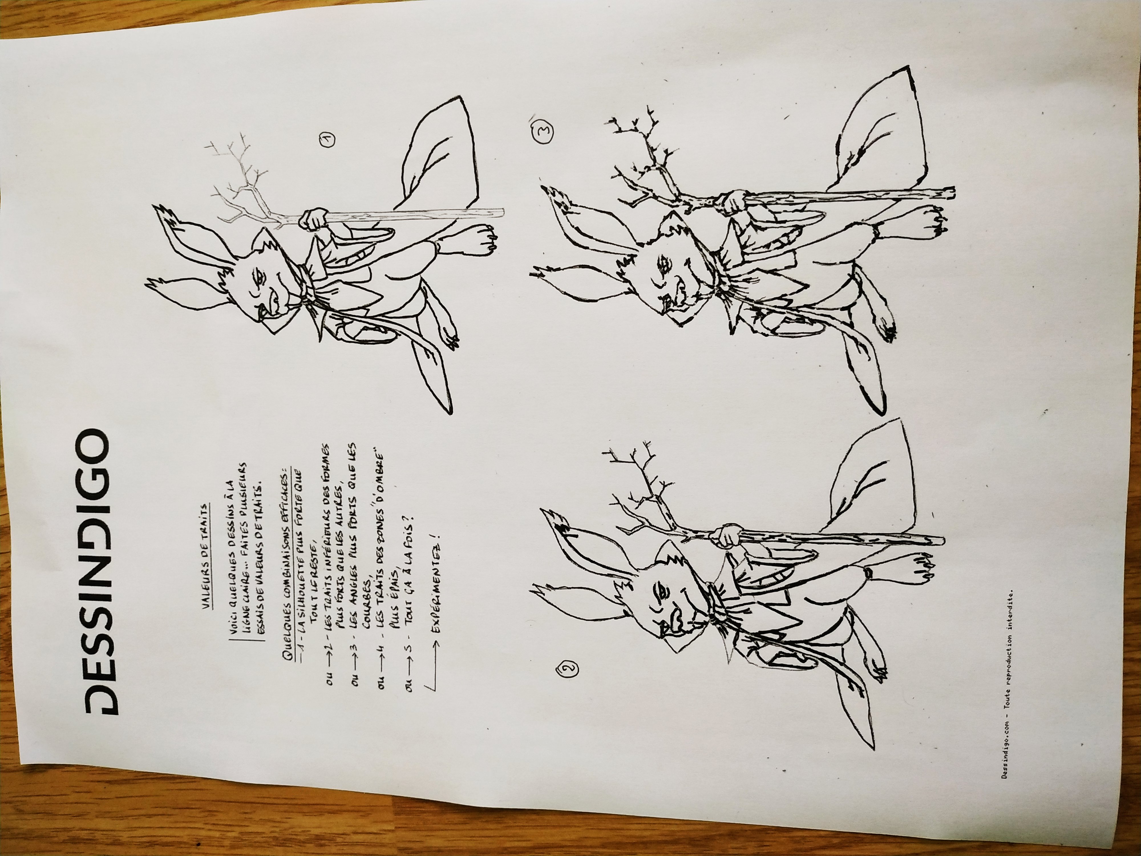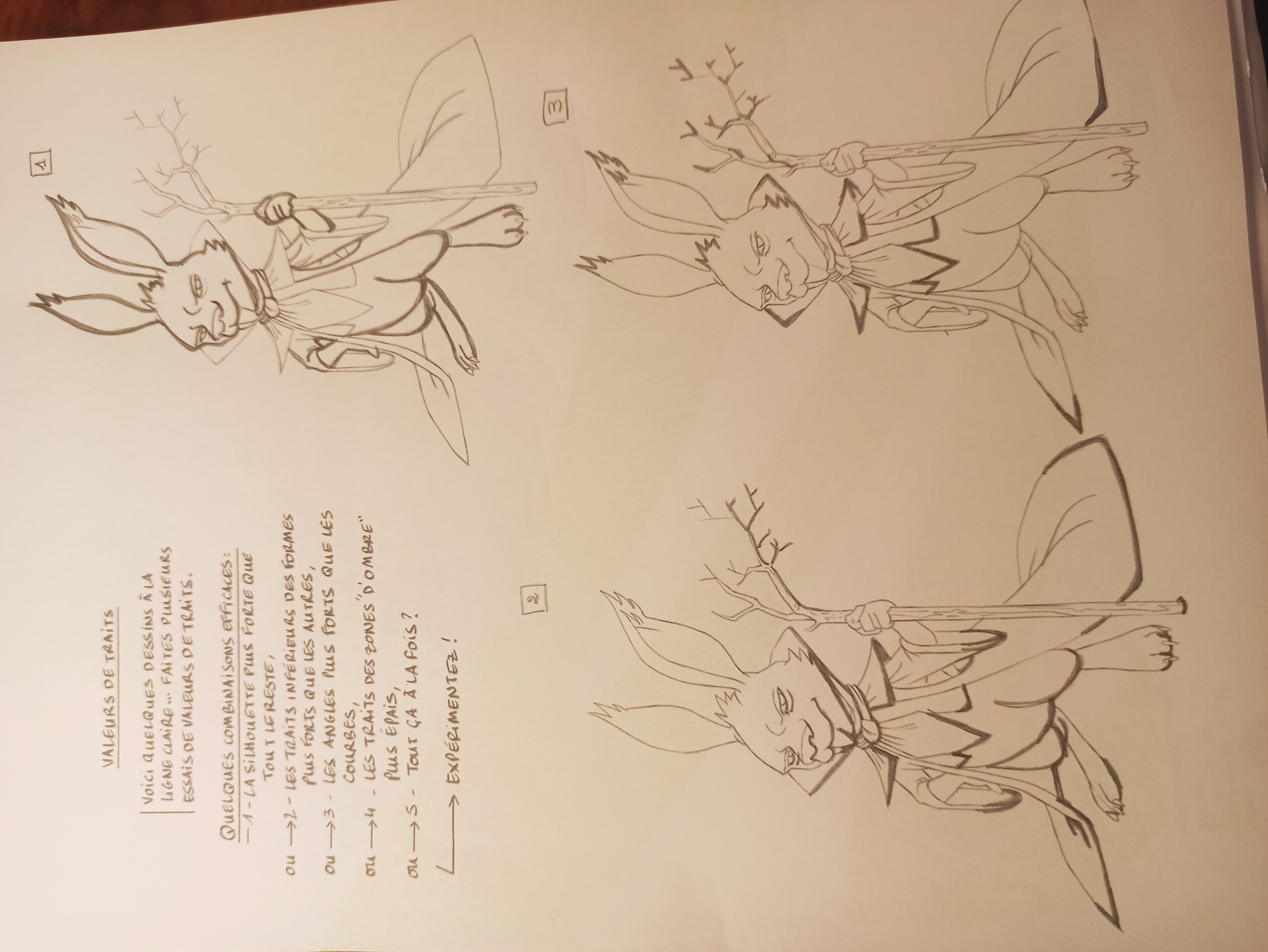 Hello Ciou, pour la silhouette, il s'agit du contour global du dessin. Les détails à l'intérieur ne doivent pas être pris en compte. Pour le second, les traits inférieurs il s'agit des lignes du bas sur une forme qui compose ton sujet. Par exemple, l'oreille est de forme ovale, tu dois en épaissir les traits qui si sur le bas. Et tu fais ça sur tous les éléments qui composent le dessin, les yeux, le nez, la cape, les branches, etc...