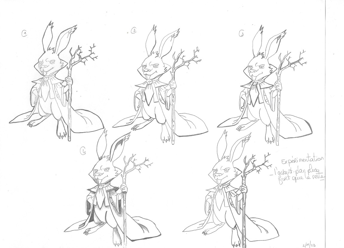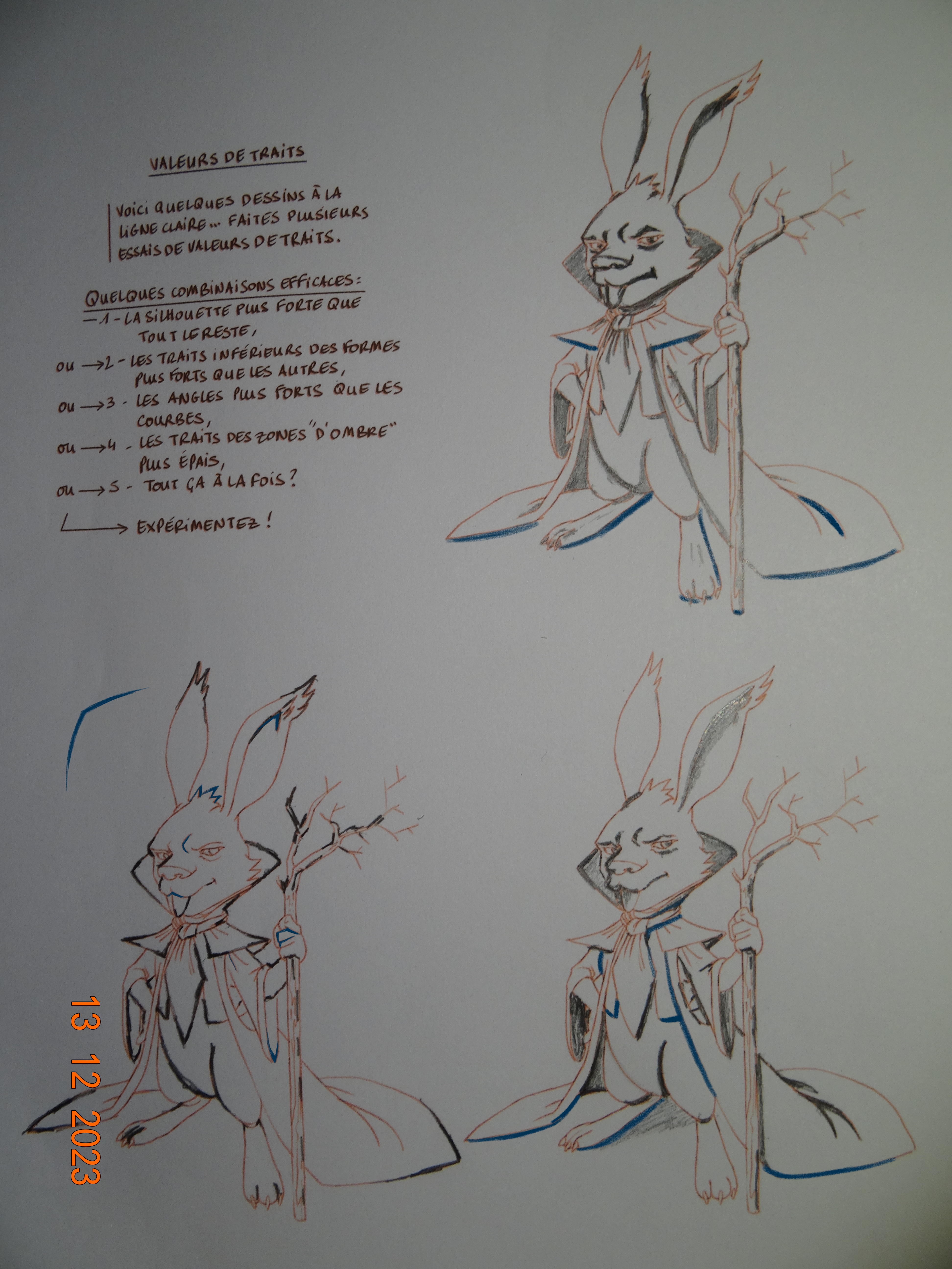 What is requested in the title is to thicken the line of your inking for the parts that are in the shadow area, without hatches or texture... just line work. To go back to my example above, you take the rabbit's ear, the line that is on the light side will be thin, and the opposite side will be thicker, that's all! 😉
