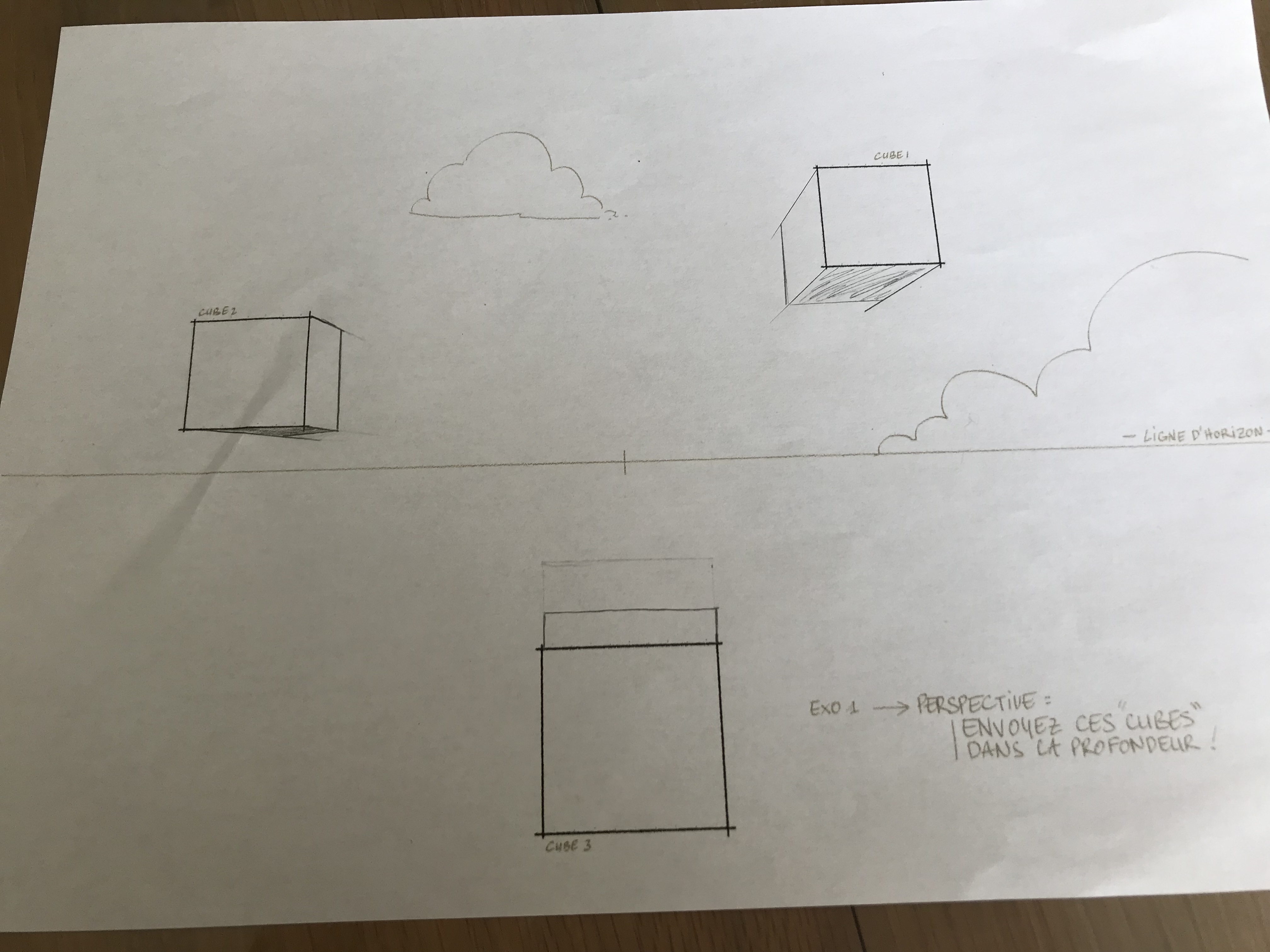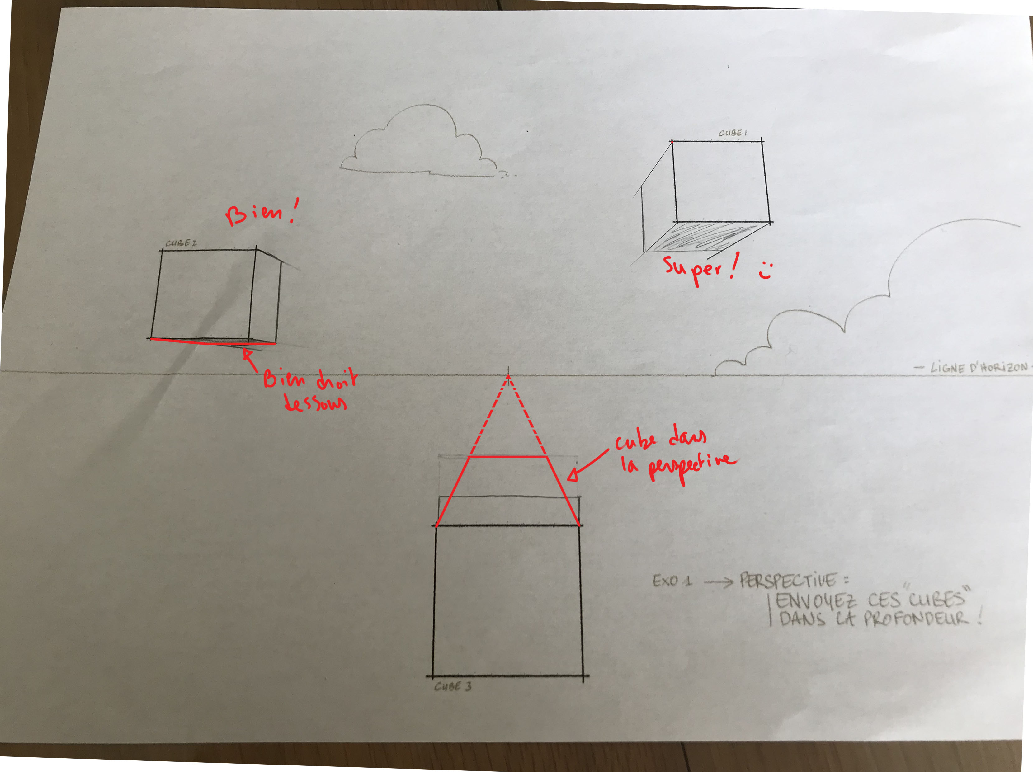 Bonjour CarolineSerre et désolé de cette longue attente! Attention, tes lignes de fuites ne suivent pas le point de fuite indiqué. Tu dois tiré tes lignes de fuites à partir des angles de ta forme pour rejoindre le même point de fuite, et ensuite placer les parallèles de ta forme. :)