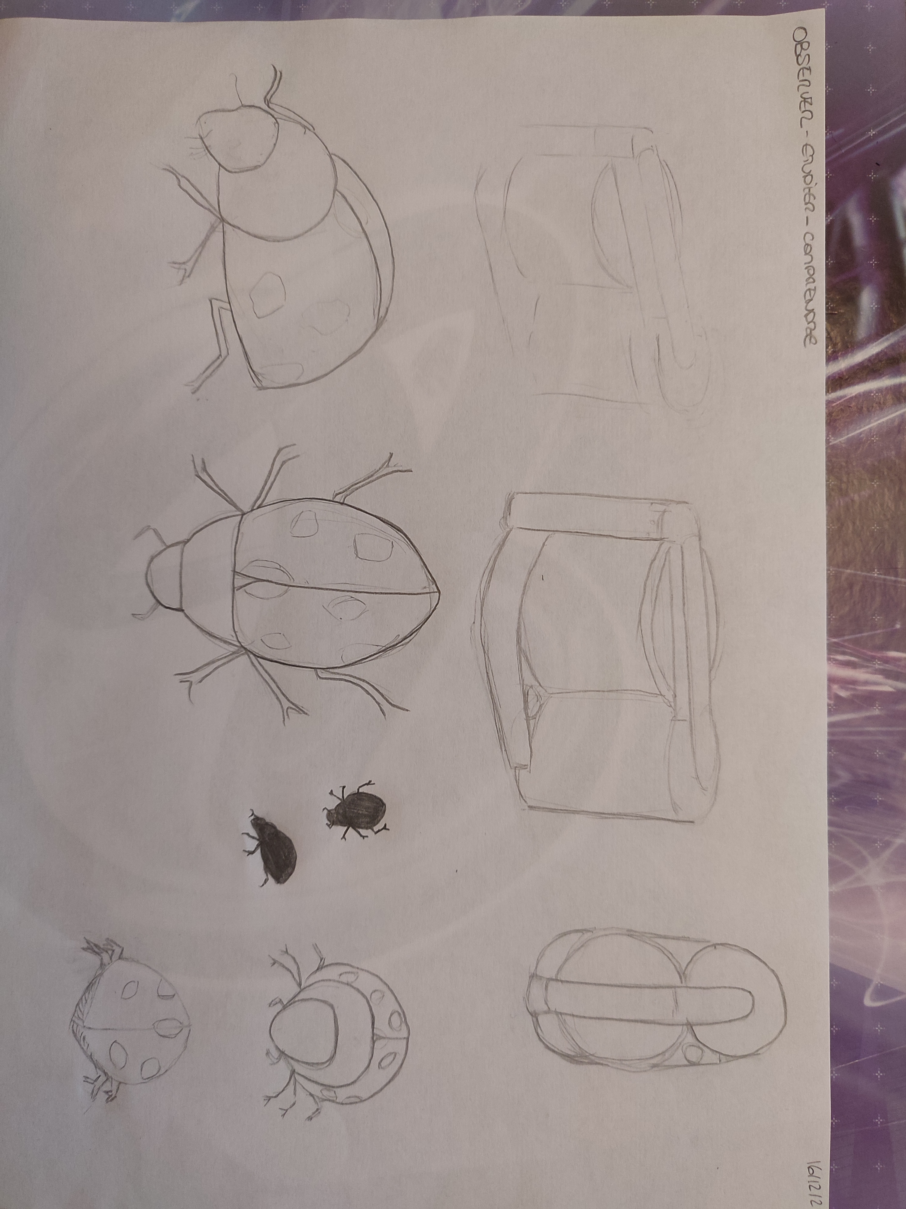 Bonjour Laurianegribouille ! Alors je vais corriger ici seulement l'exercice 1, la coccinelle sera à poster dans le sujet de l'exercice 2 :) Tu as plutôt bien compris l'objet, mais tu n'as fait que deux vues, tu pourrais essayer de le dessiner de profil ou de face par exemple ^^ Voici ma correction dessinée.