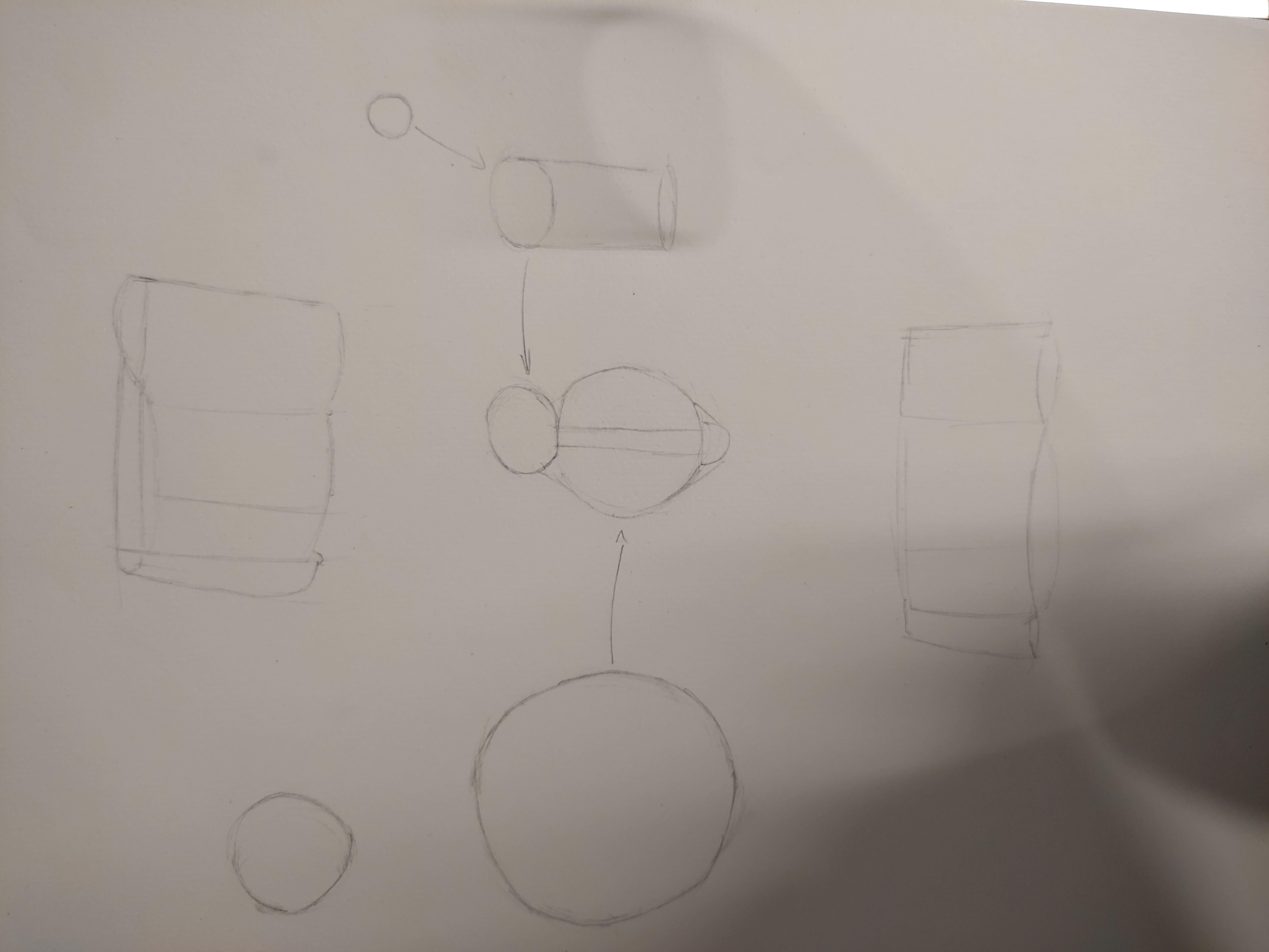 C'est plutôt bien pour la vue de dessus :) Attention pour les autres c'est un peu embrouillé car tu as tenté de faire des vues légèrement de dessus alors que le regard doit être bien en face, au milieu de l'objet. J'ai fait un croquis rapide pour montrer ce que ça devrait donner. Je joins aussi un petit tutoriel sur les vues d'objet plus oou moins de dessus, avec l'exemple d'un verre ^^