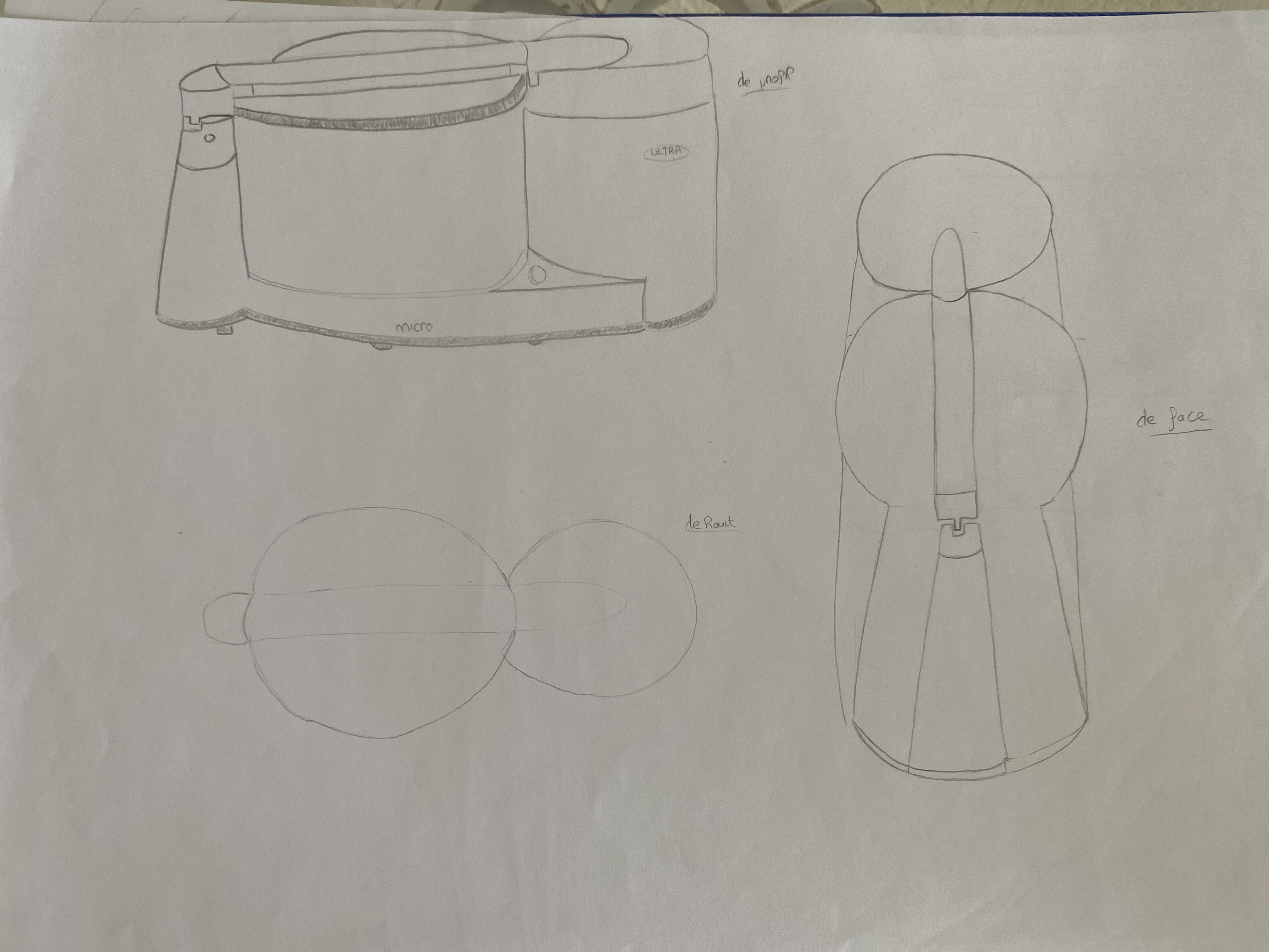 Cet exercice avec le robot cuiseur est déjà un bon début. Attention à la vue de face qui intégre des éléments de vue de dessus. Pour la vue de dessus, tu as oublié de représenter le socle de l'appareil. Essaie de simplifier tes vues et de les appréhender en 2D.
