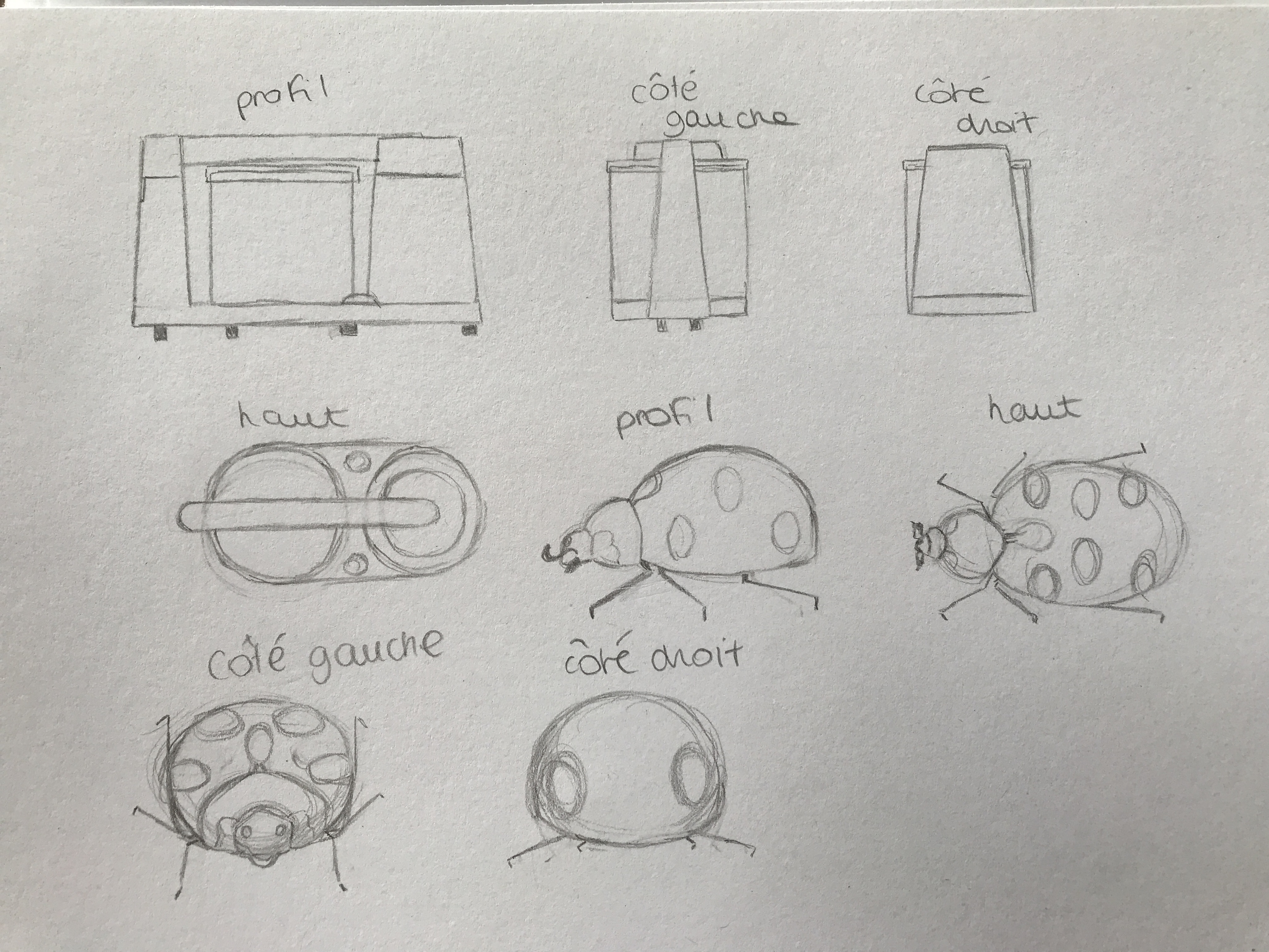 Good evening NatachaThepaut75011, that's very good for a start! Don't hesitate to make the ladybug's body more rounded. Be careful, on the fourth one, if it's a front view the top of the shell should be rounded and we shouldn't see the back with the wing angle... Ah darn, in the last one it's on its back! My correction isn't relevant for that view! 😅