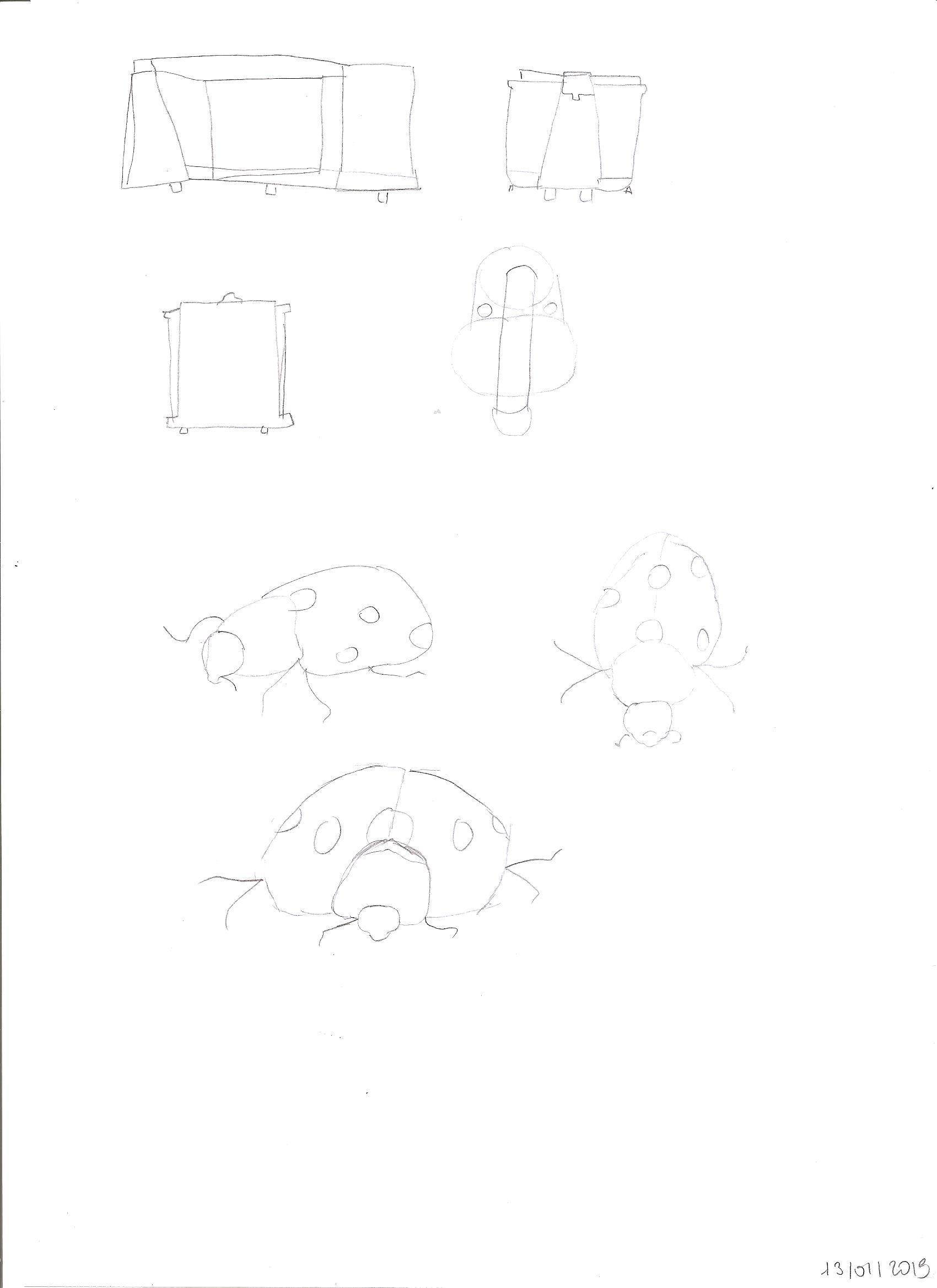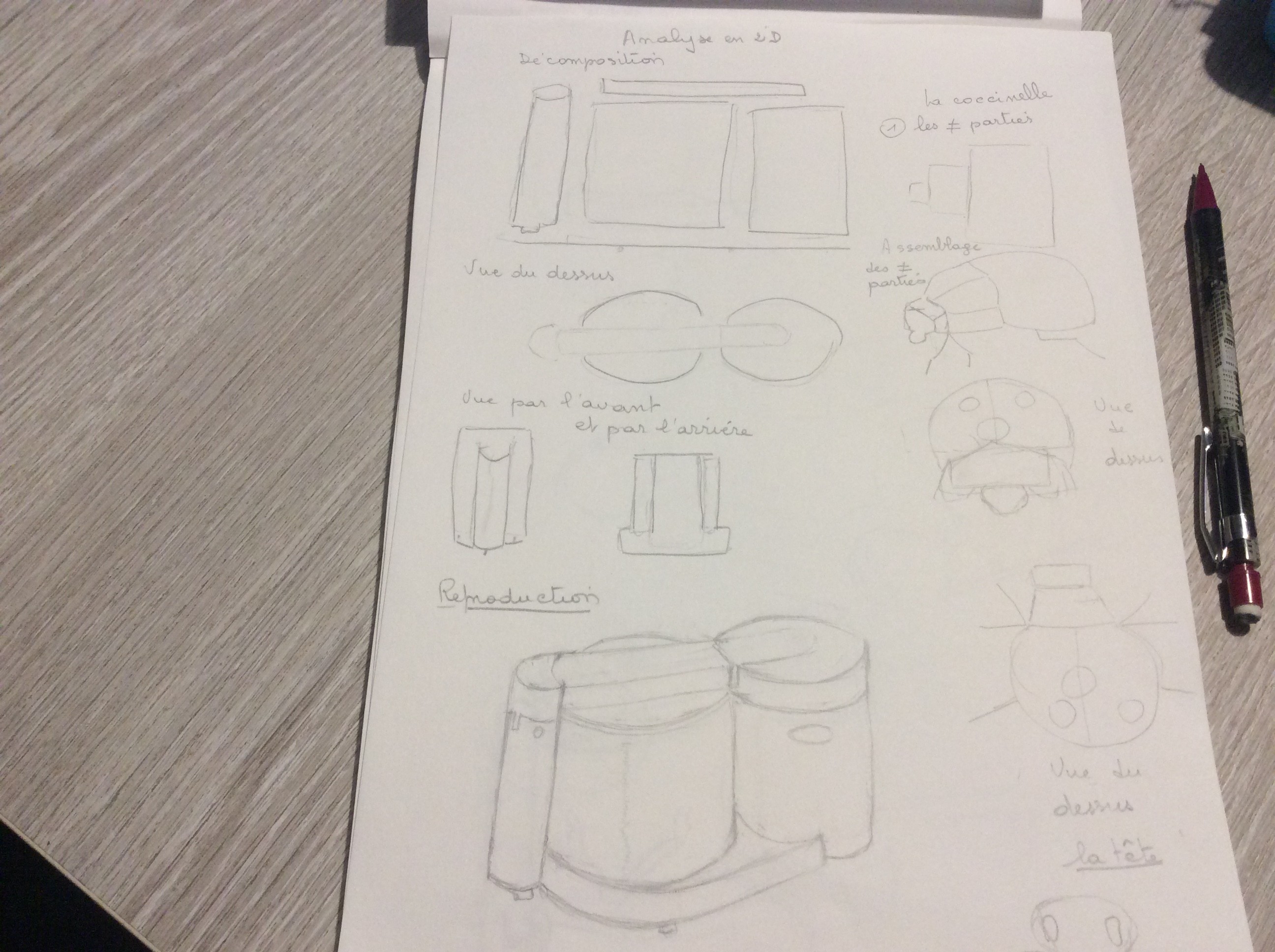 Well, here I go, I dare to send my sketches, I admit it was a struggle!!! And especially, I realize that I don't have a sense of proportions at all, and that it's not easy to visualize from the back, side, or other because I get stuck on the object, it's quite a job to detach oneself from the image ;)