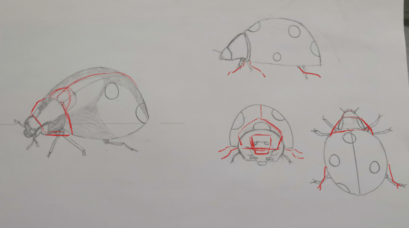 We don't care about reflections for this exercise, for now we're only paying attention to the construction ^^ It's pretty good! Just be careful with your top ladybug, it should be a bit wider to be rounder, and the black area behind the head should go over the body shape rather than the other way around. The legs are also a bit long, but otherwise it's good :) The one in perspective is also a bit too long and lacks a bit of roundness. Try doing other views, like one from the front and one from the side ^^