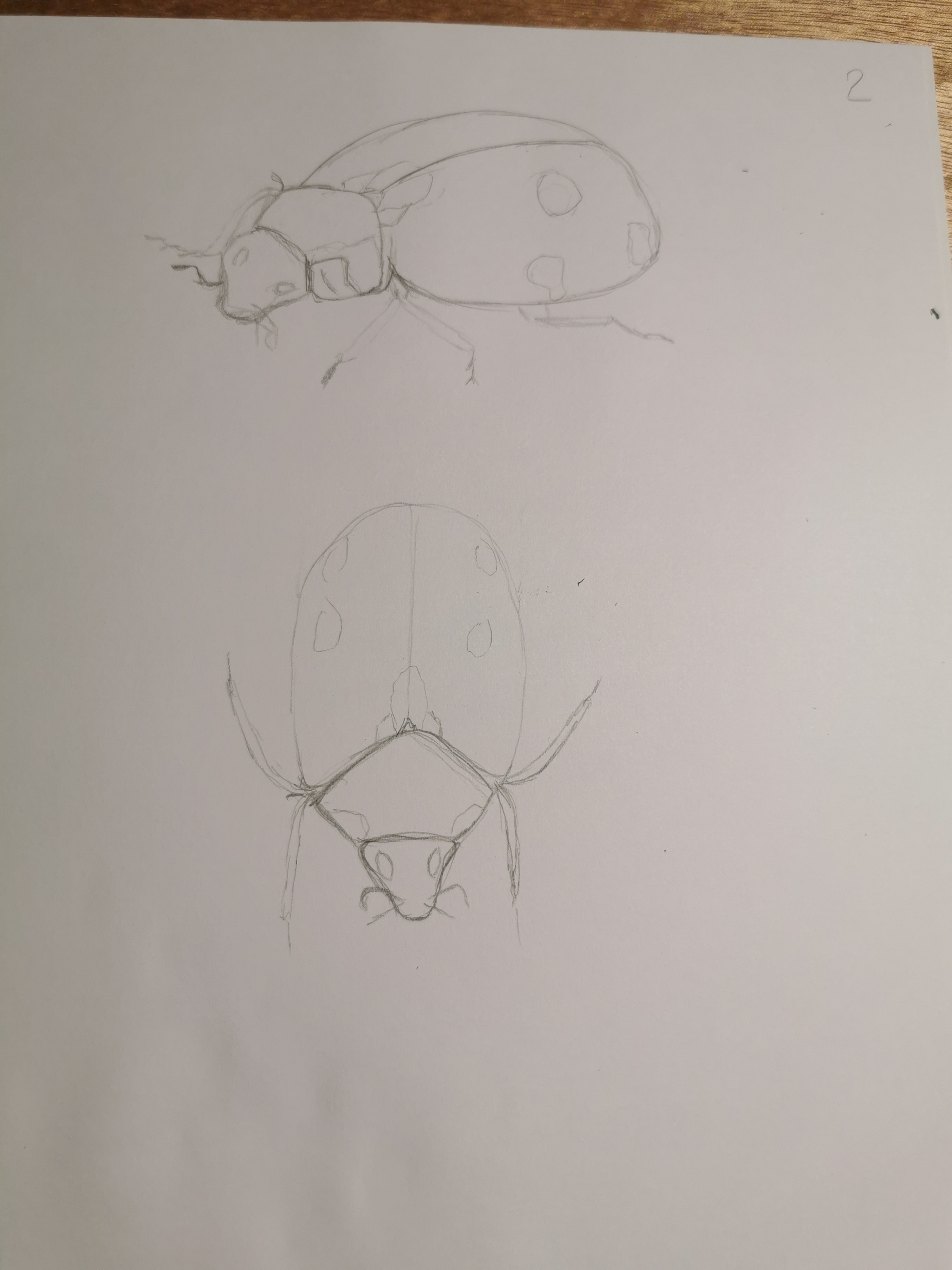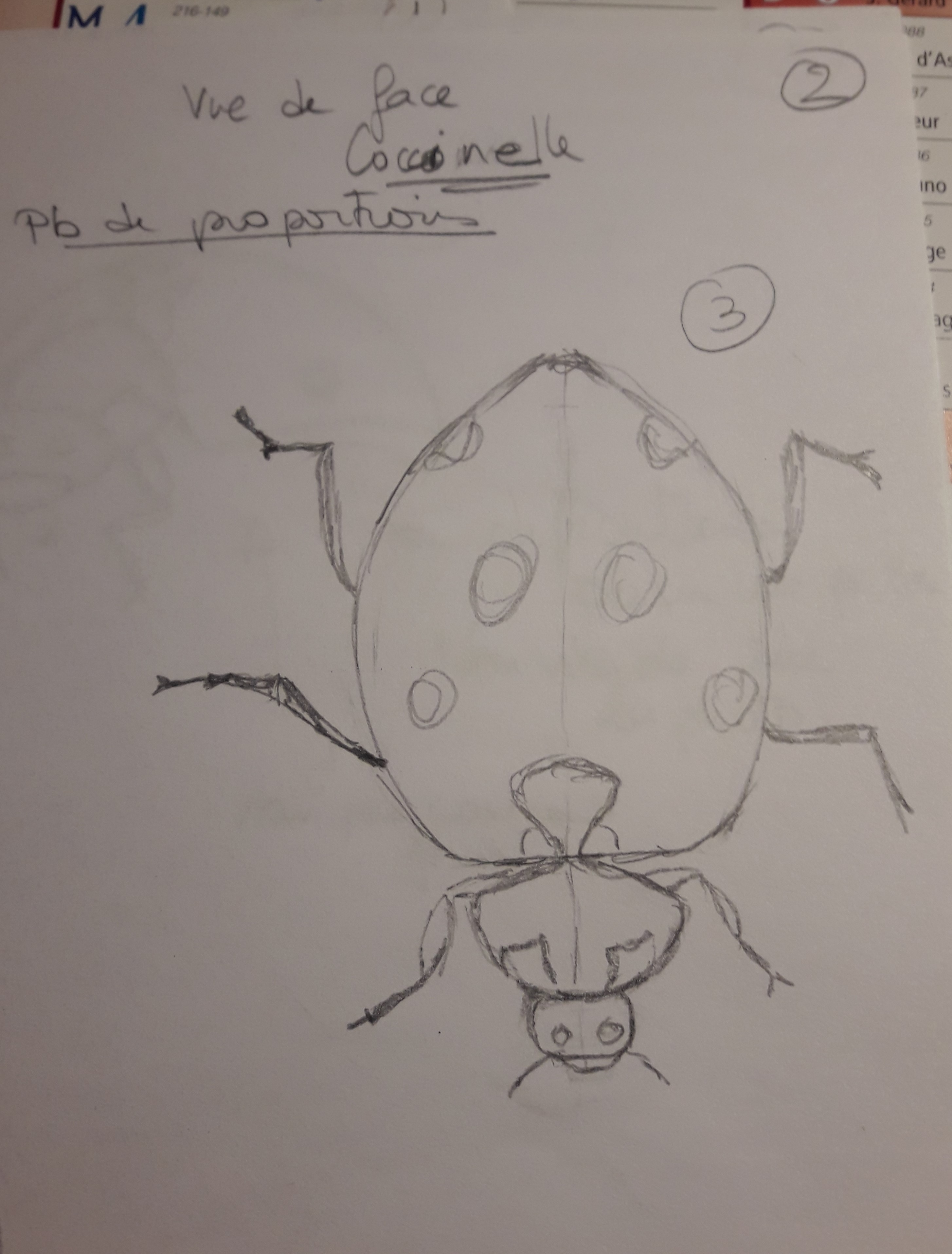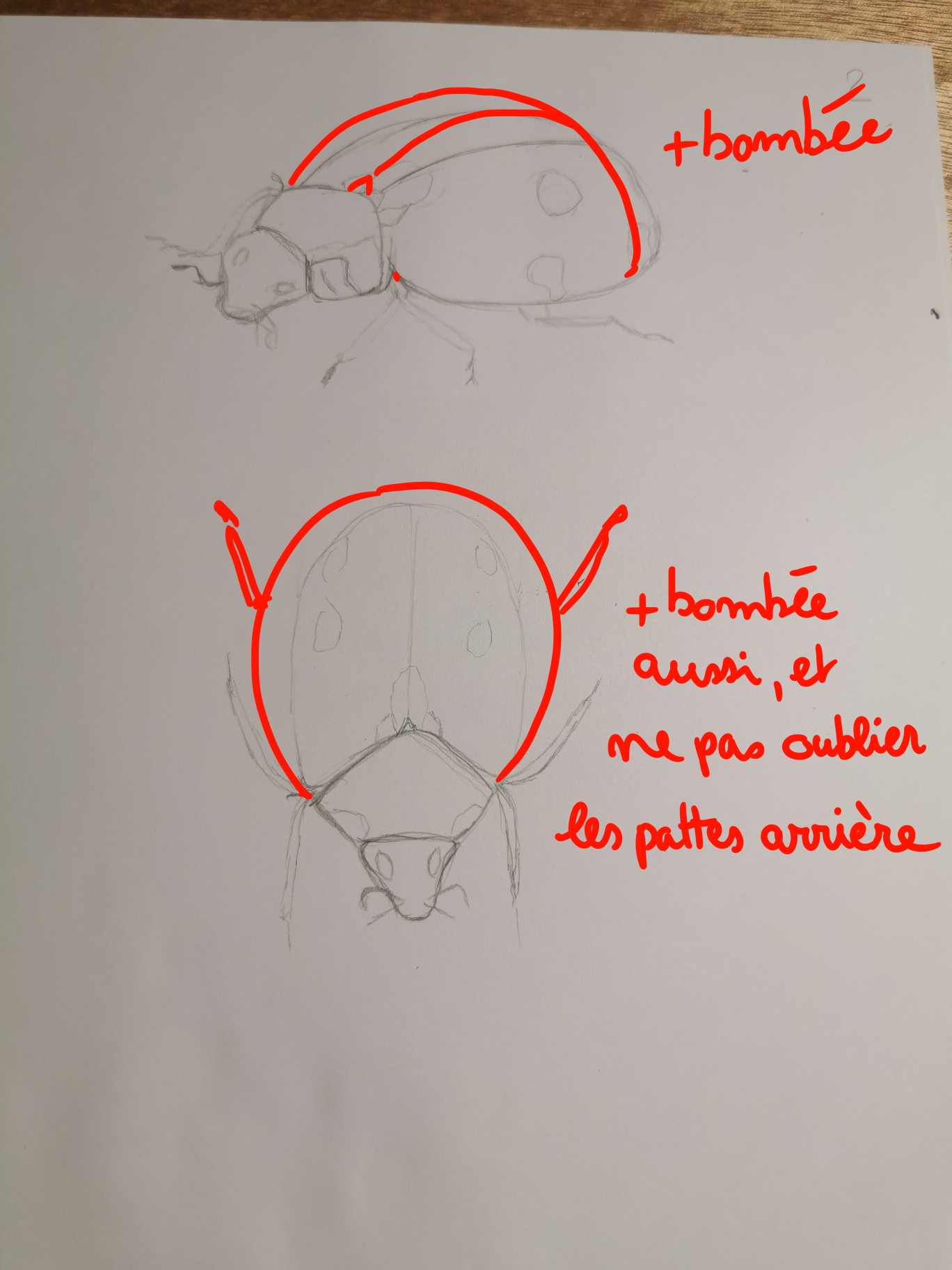 Ah bien, je vois que tu t'es corrigée pour le sujet, merci :) Alors cette coccinelle est bien, mais pour l'exercice il faut faire d'autres points de vue pour bien l'analyser (profil, face, dessus) ^^
