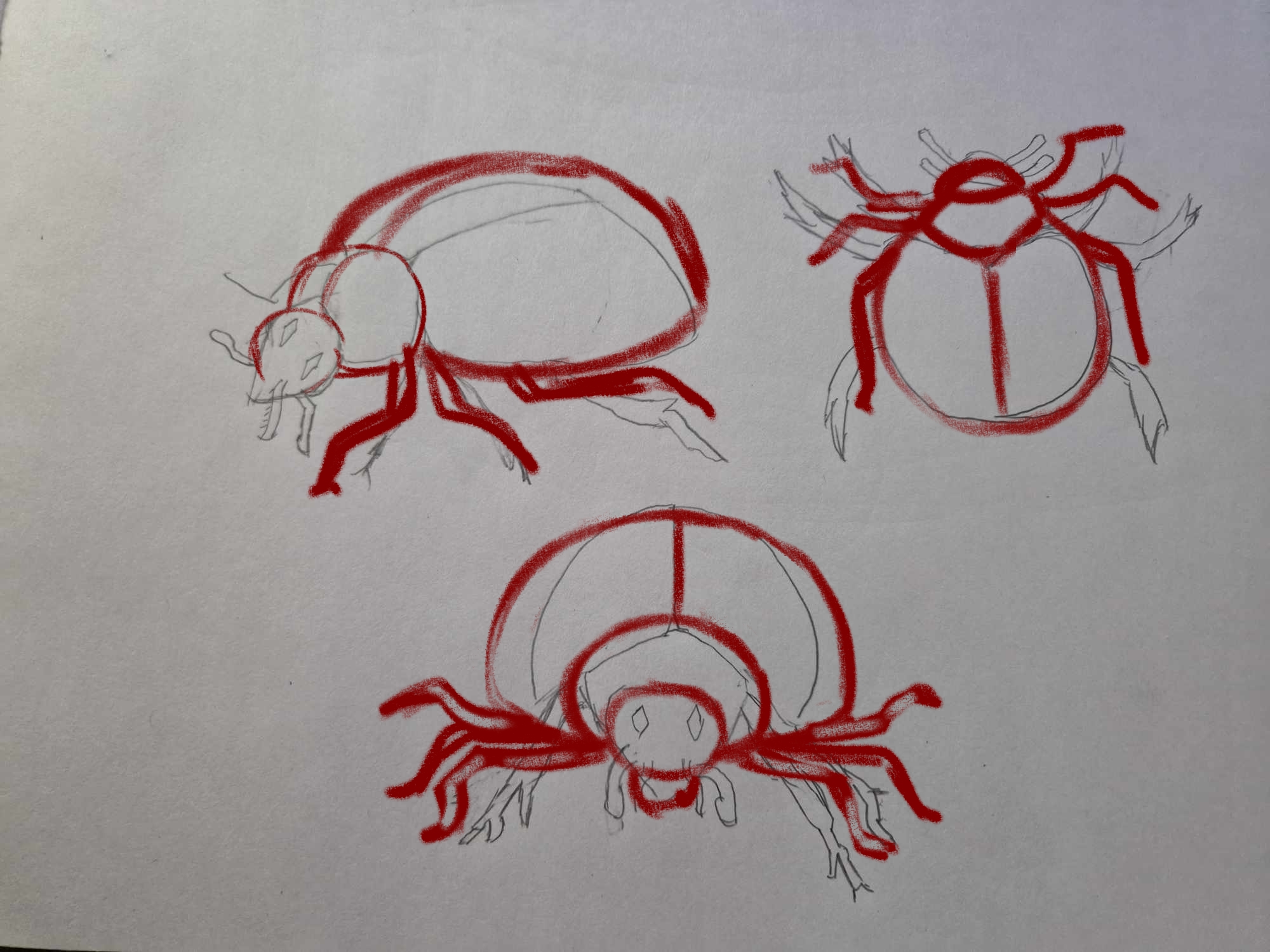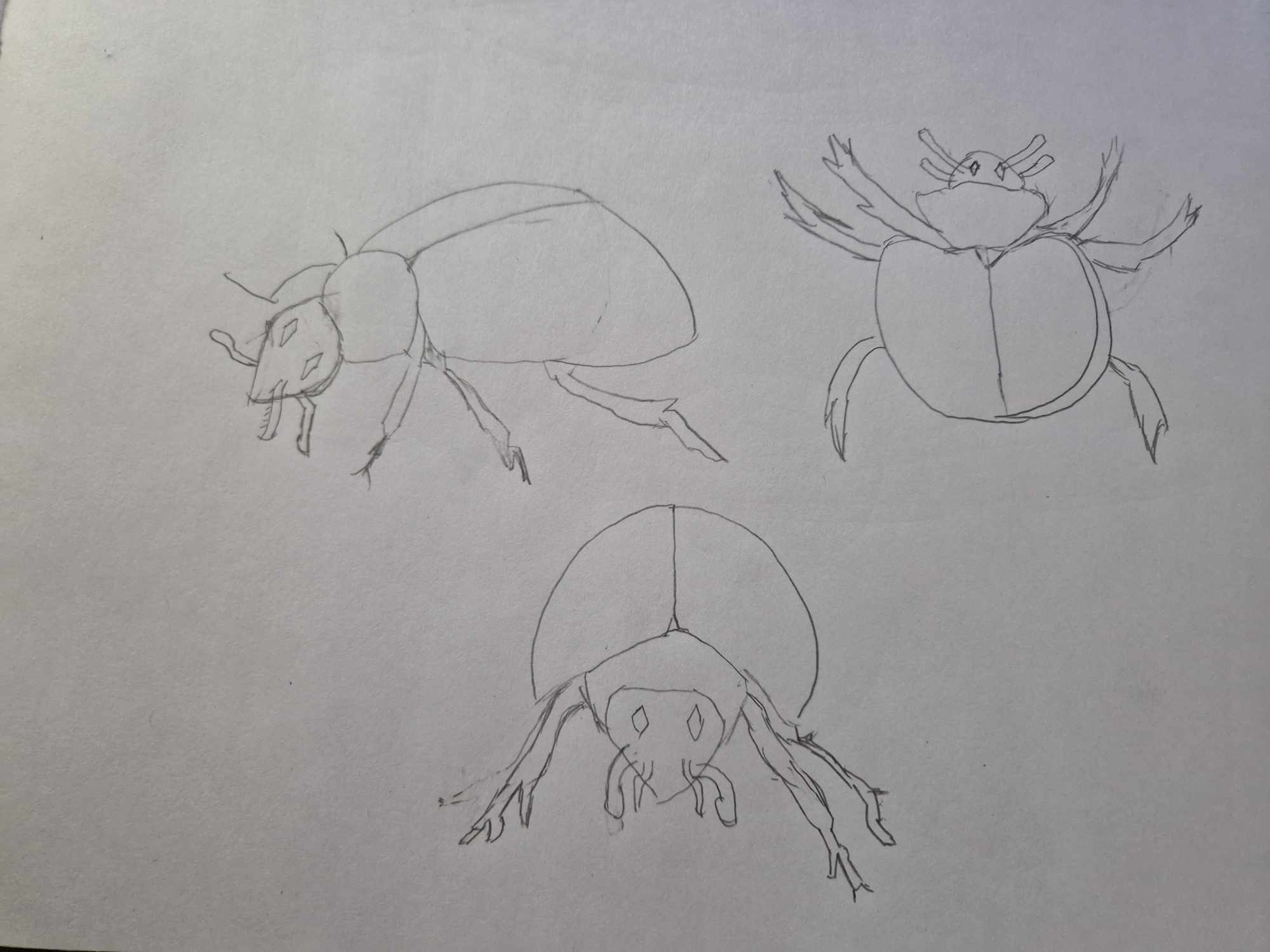 Hello Ebge1965, c'est pas mal, c'est un bon début! Attention aux proportions entre la tête (petite et tassée dans le "cou"") et le corps (plus gros et fort bombé). Il y a également un souci au niveau des pattes, la dernière paire notamment doit partir vers l'arrière. Et il faut penser à comment et seront positionnée selon l'angle de vue (est-ce qu'on les verra ou noon dans tel ou tel sens, et comment partiront t'elles?) Après ce n'est pas la partie la plus simple chez les insectes! 😉