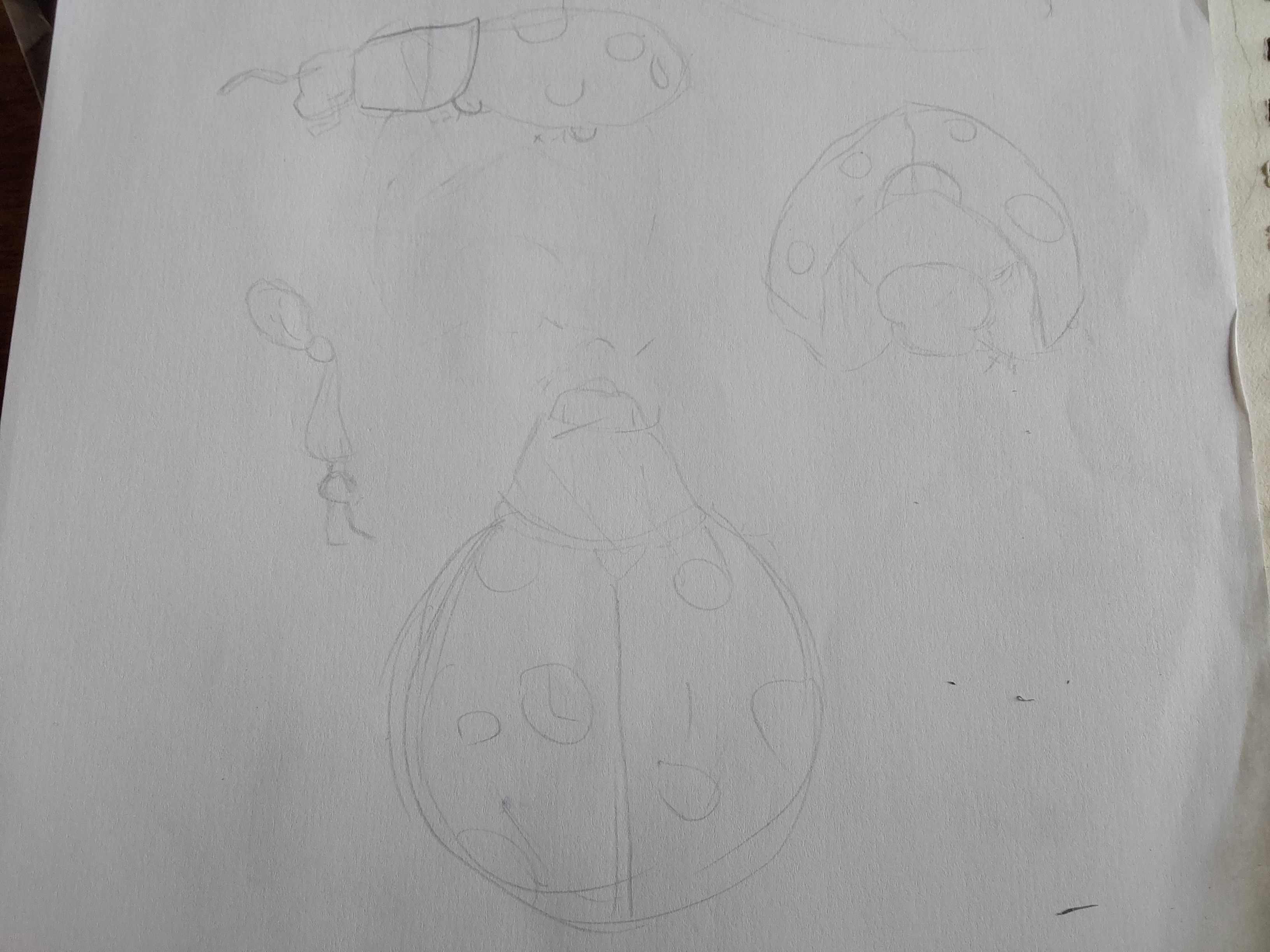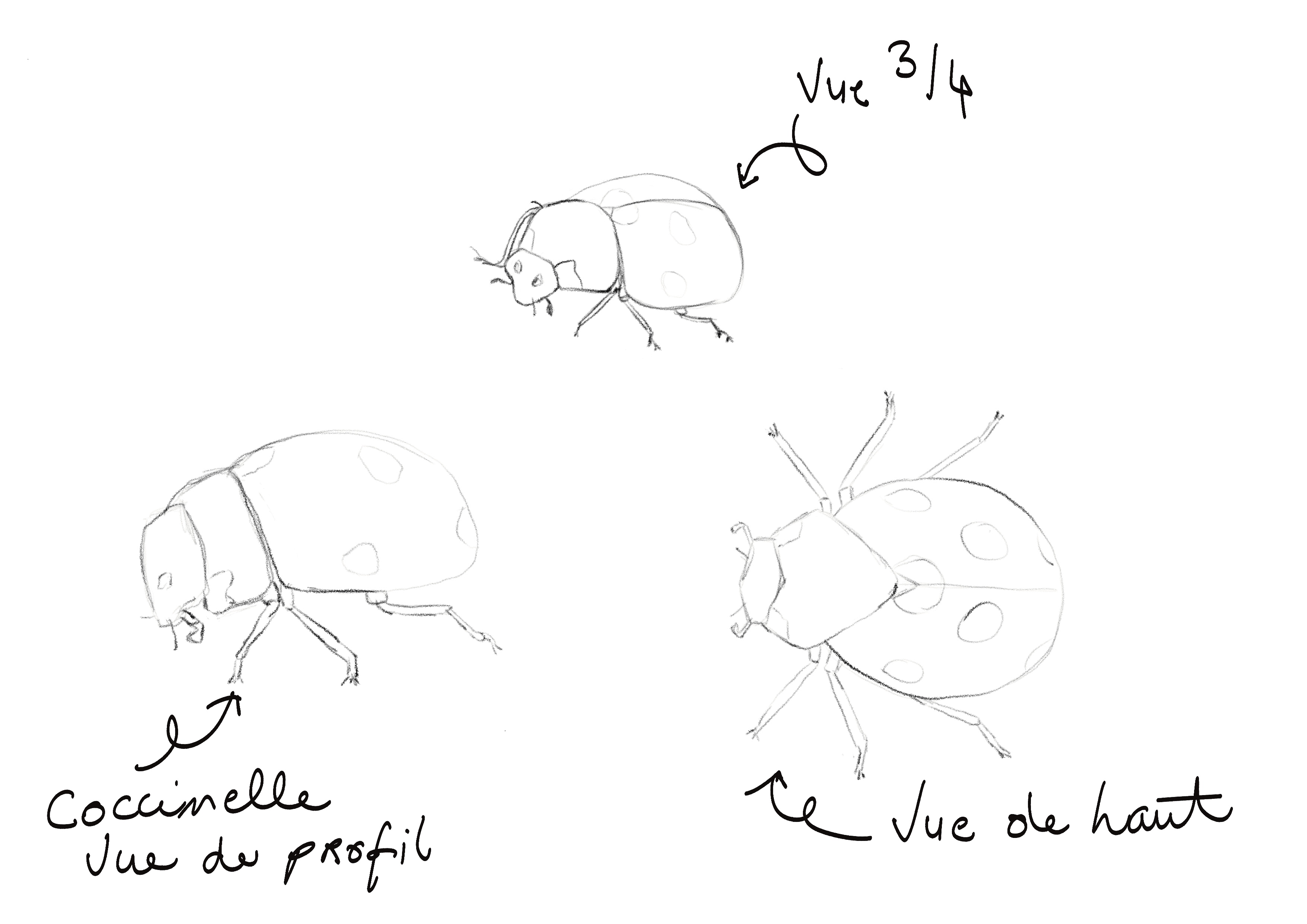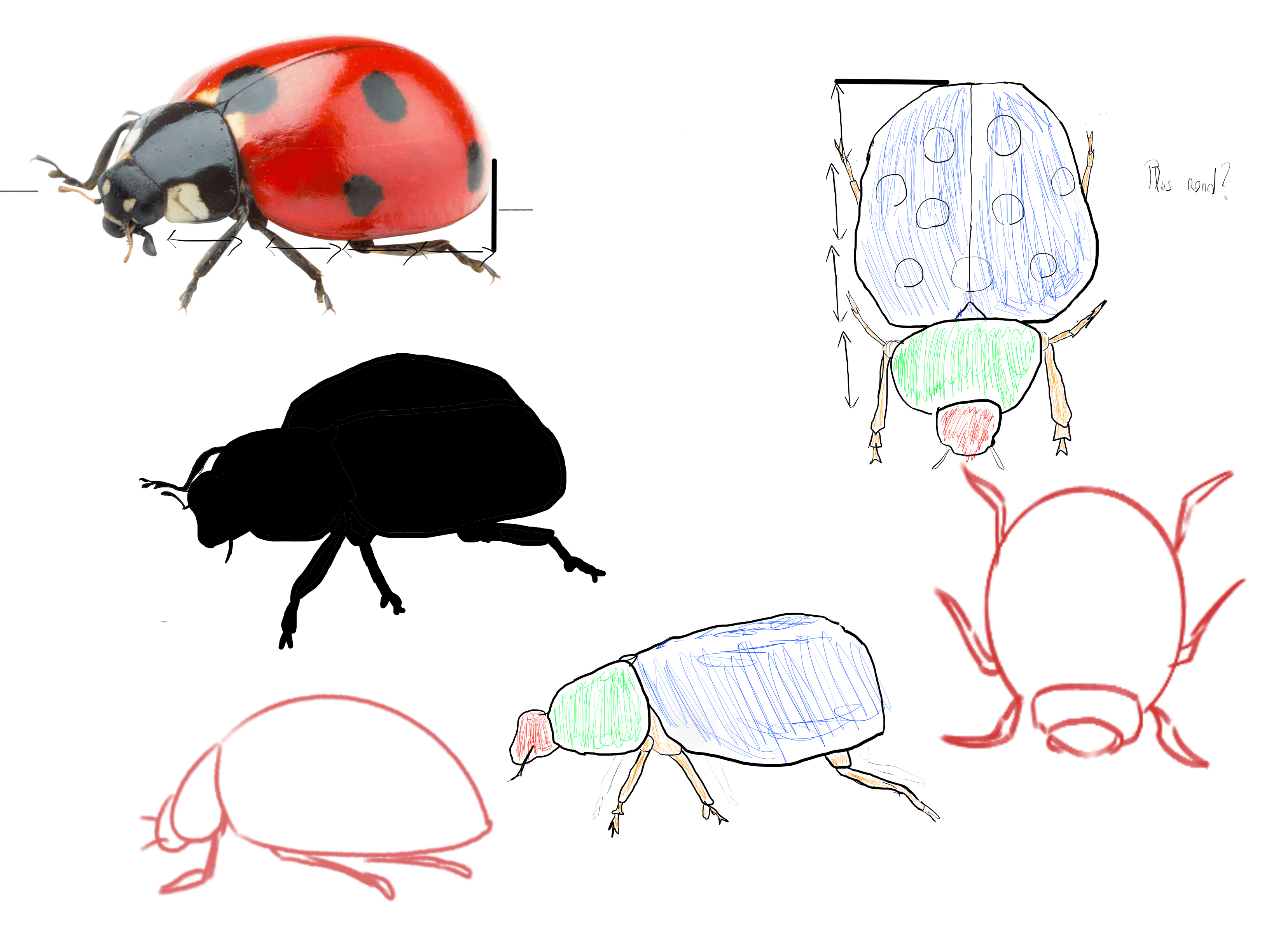C'est plutôt un bon départ, même si tes coccinelles manquent un peu de rondeurs surtout sur la vue de face qui est très anguleuse. Les pattes sont aussi un peu trop longues, notamment en vue de profil :) N'hesite pas à les synthétiser avec des formes de base (cercle...) pour te servir de guide quand tu les dessine :)