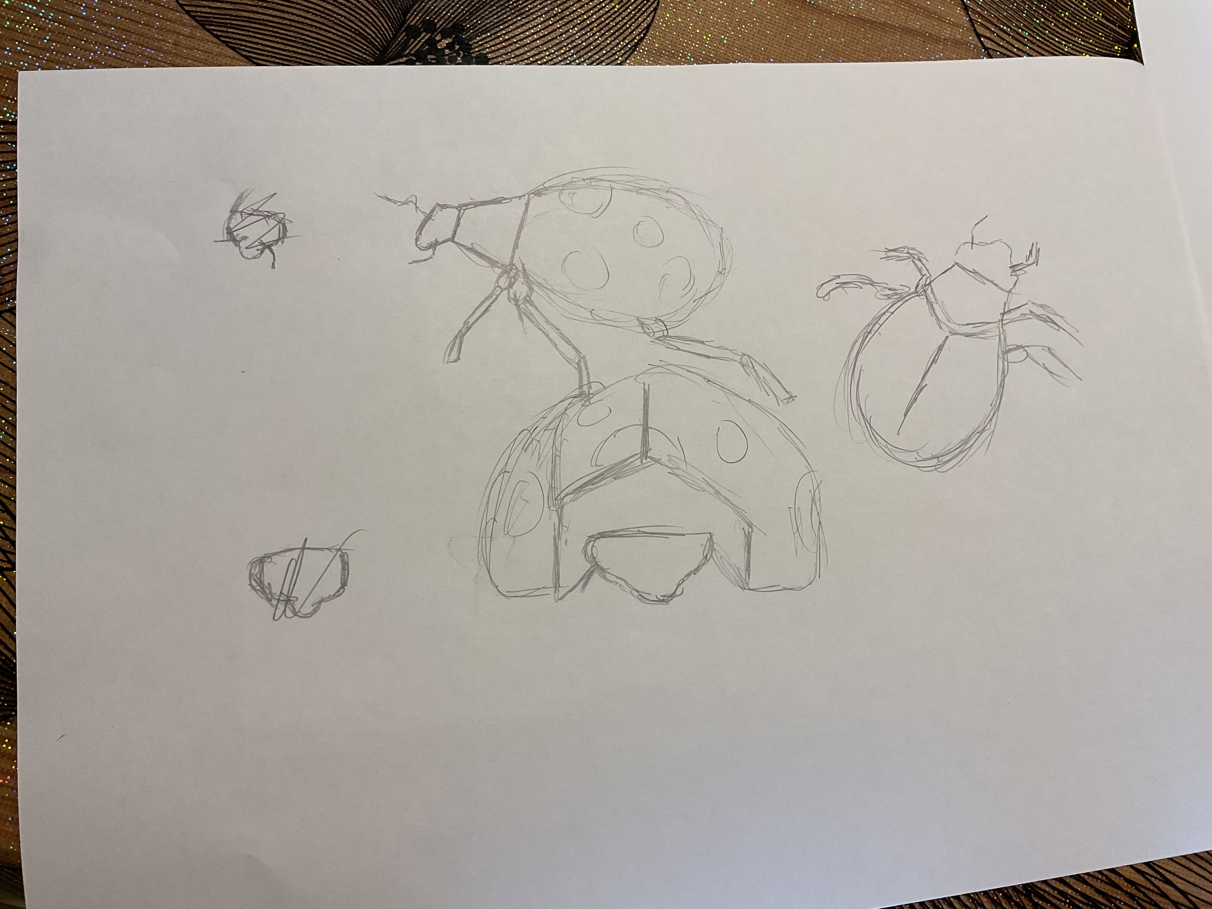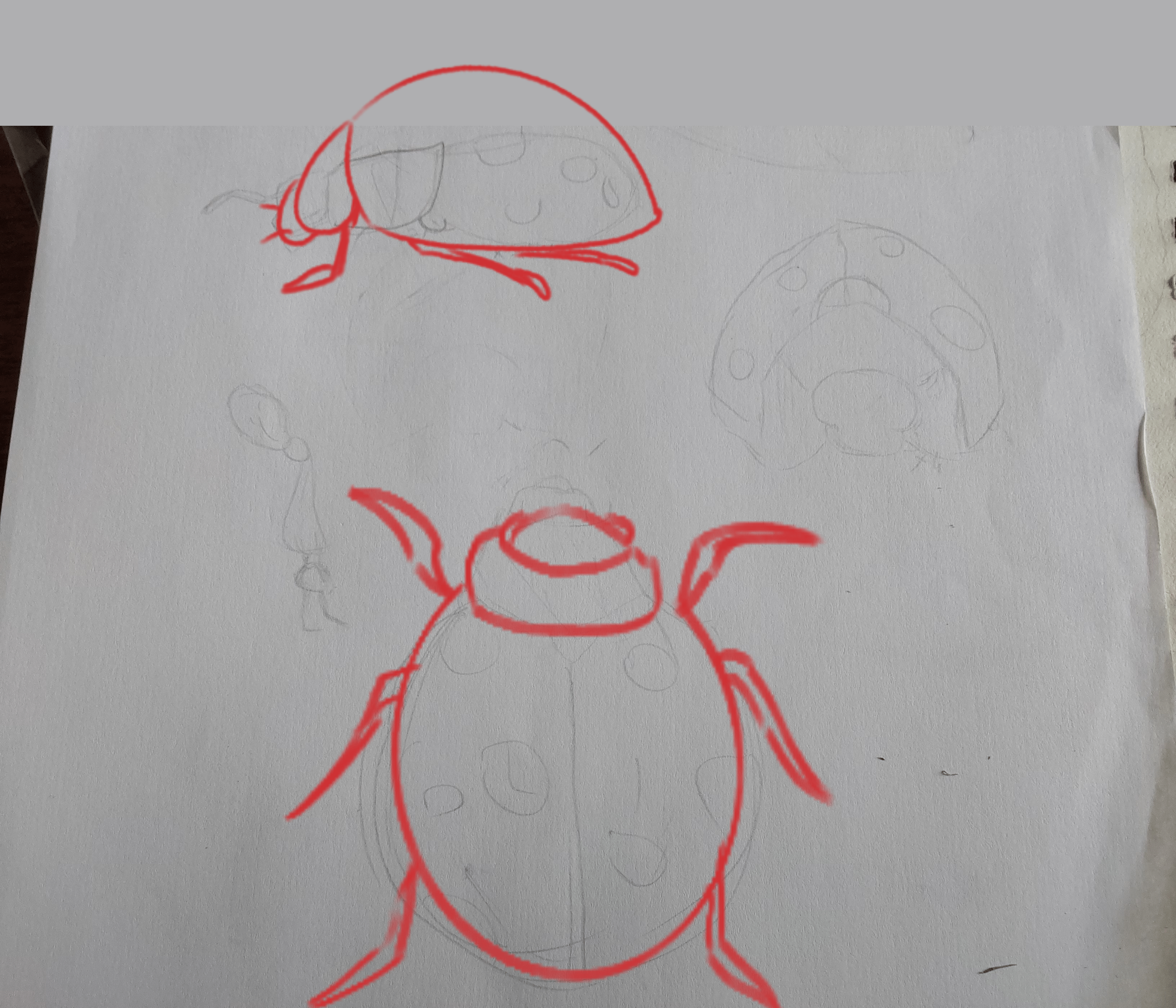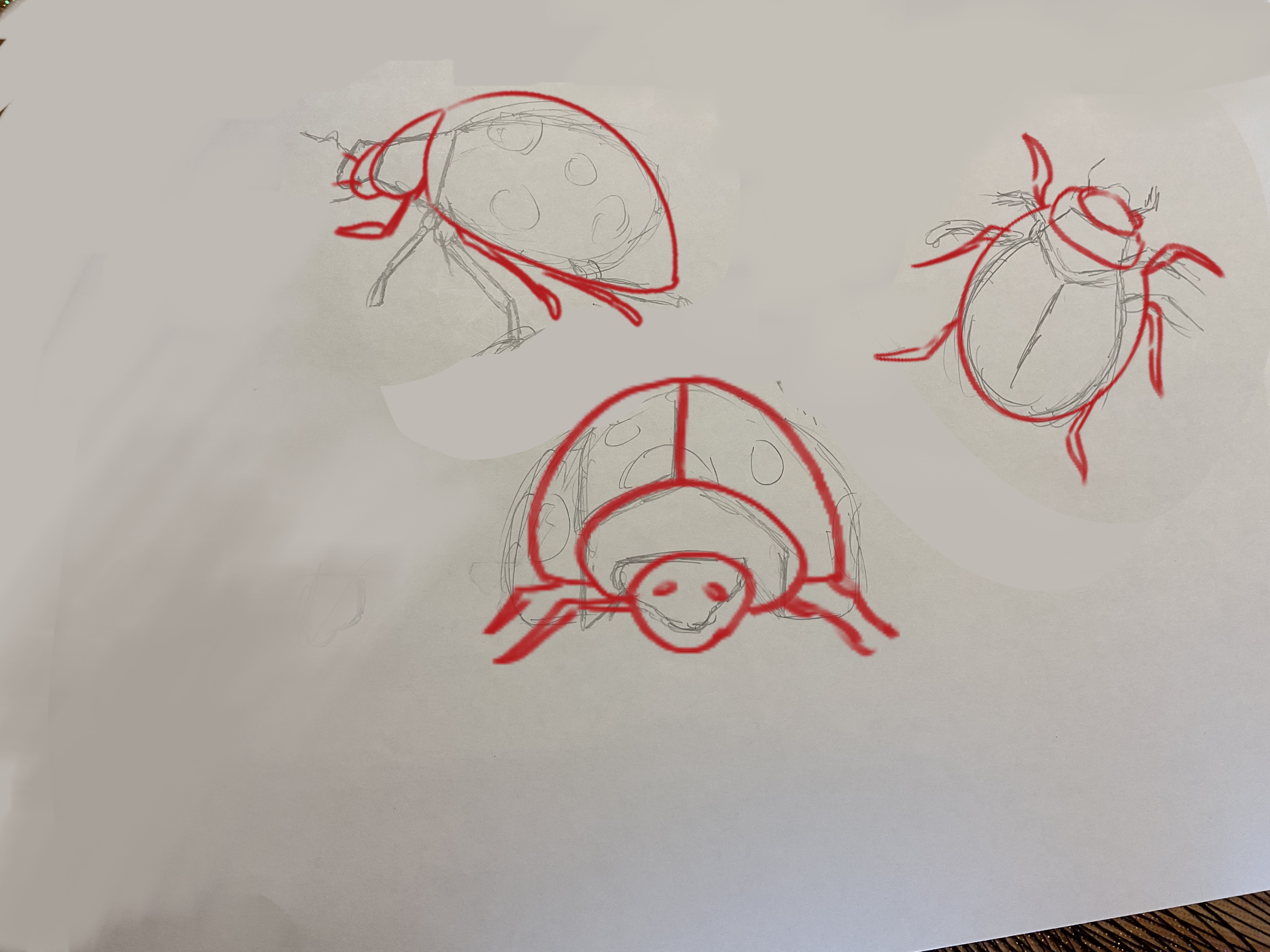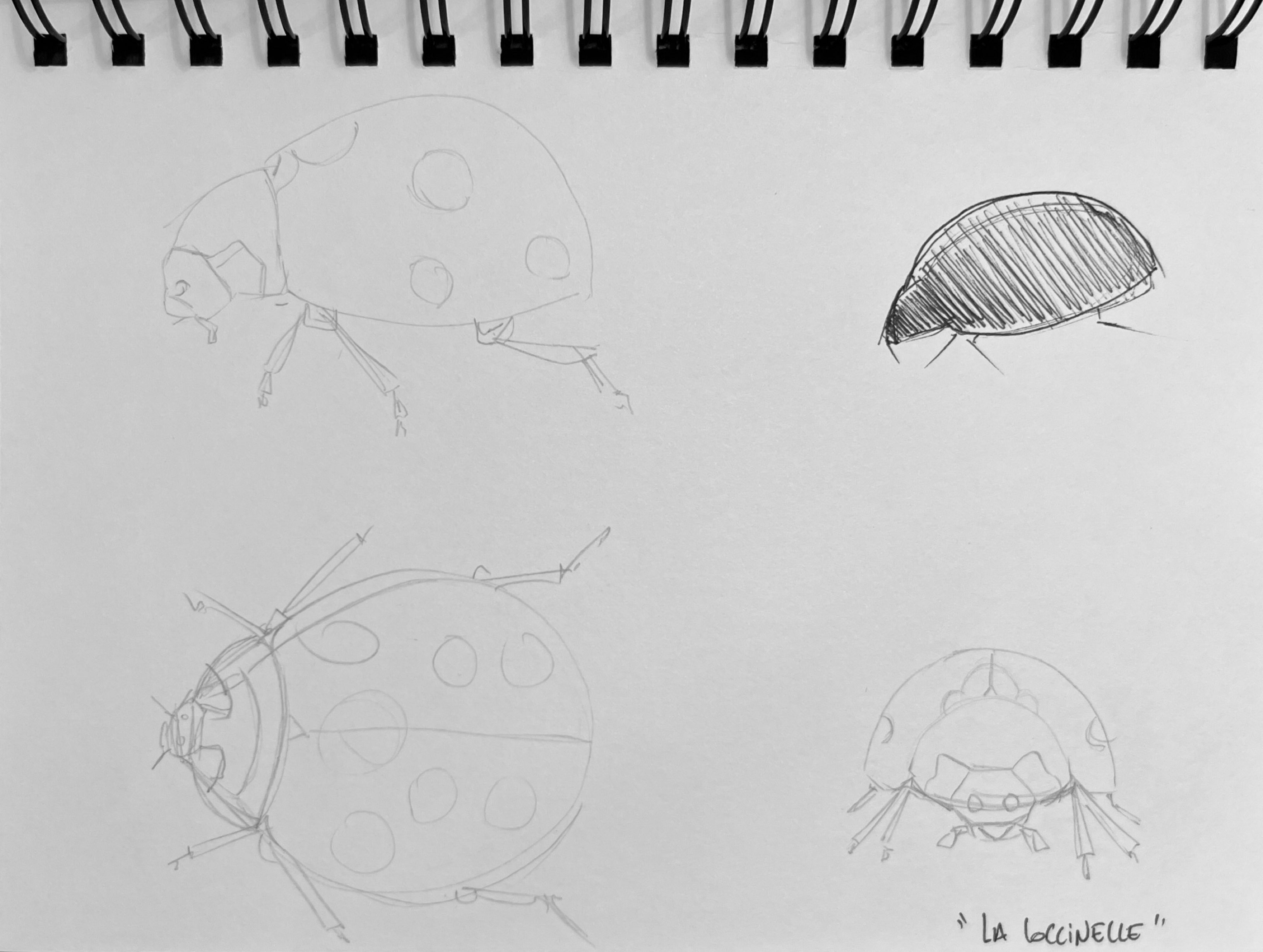 C'est plutôt un bon départ, même si tes coccinelles manquent un peu de rondeurs surtout sur la vue de face qui est très anguleuse. Les pattes sont aussi un peu trop longues, notamment en vue de profil :) N'hesite pas à les synthétiser avec des formes de base (cercle...) pour te servir de guide quand tu les dessine :)