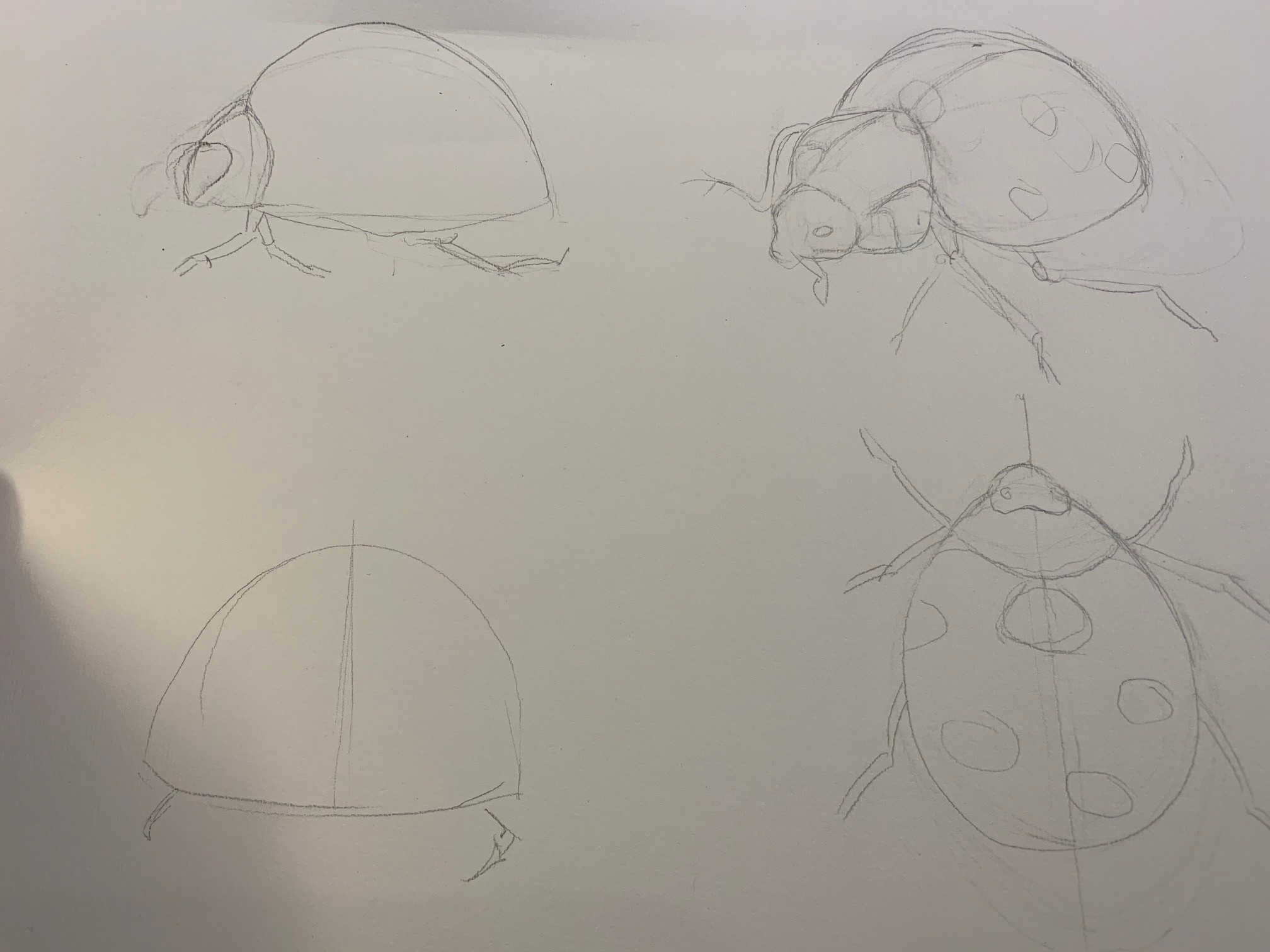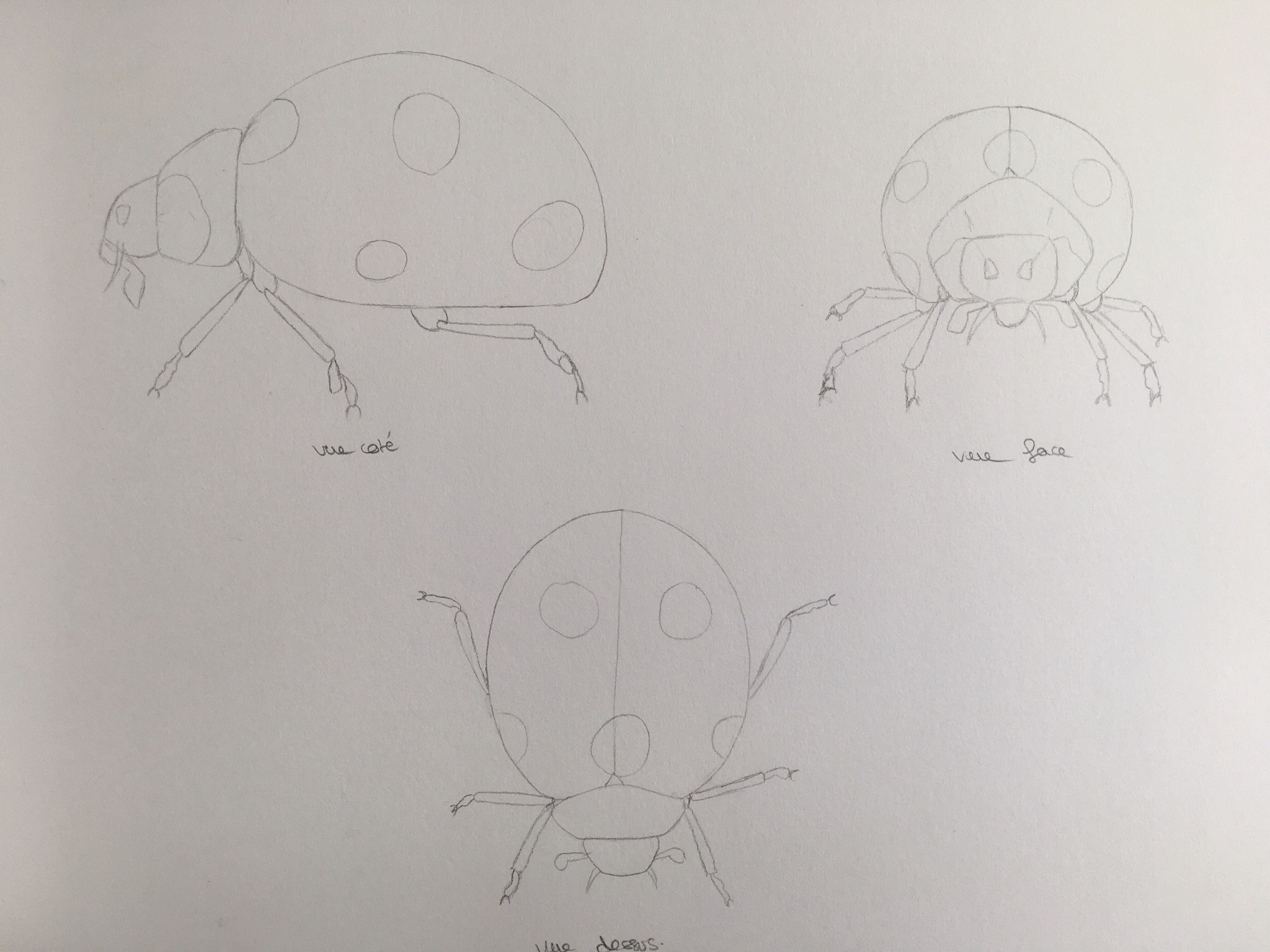 There are disproportions, it's hard to really recognize a ladybug: look at the size of the head compared to the body. Normally, the head fits into the body 3 to 4 times. In your case, it fits only 1.5 times. So there's a problem. Similarly, you haven't quite grasped the "neck". It's not a sphere or anything round in general. And finally, you haven't understood where the legs attach ^^
