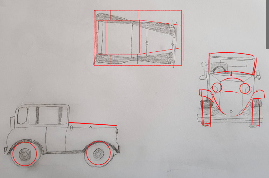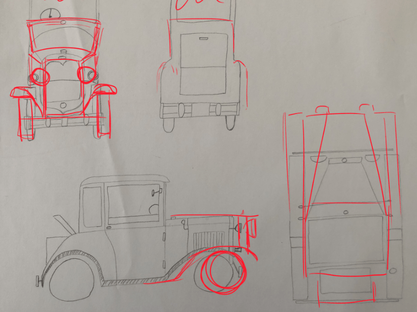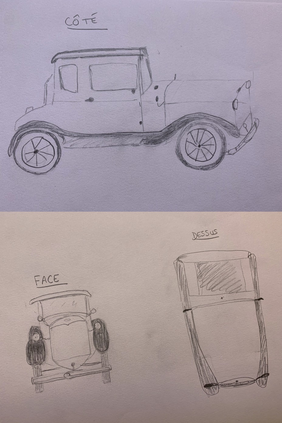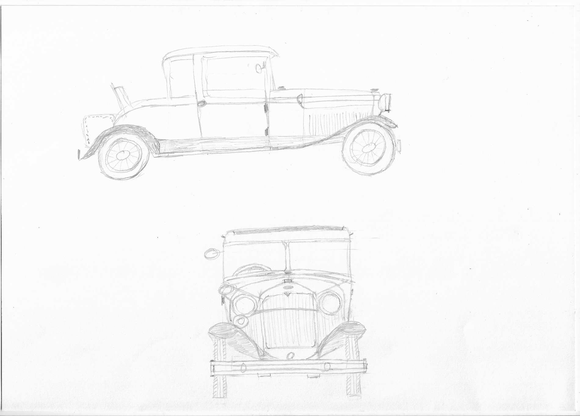 Great work, but I see a flaw in your profile and front views. They were done as if they were partly seen from above, you have to imagine your gaze in the middle of the object. For the profile view, we should not see the metallic front of the car, nor the top, and we should not see the top of the running board either. For the front view, we should not see the rear wheels. For the top view, it's good, but watch out: the fenders do not taper towards the front, they continue straight, and don't forget the bumper. For the construction, you've got it right :)