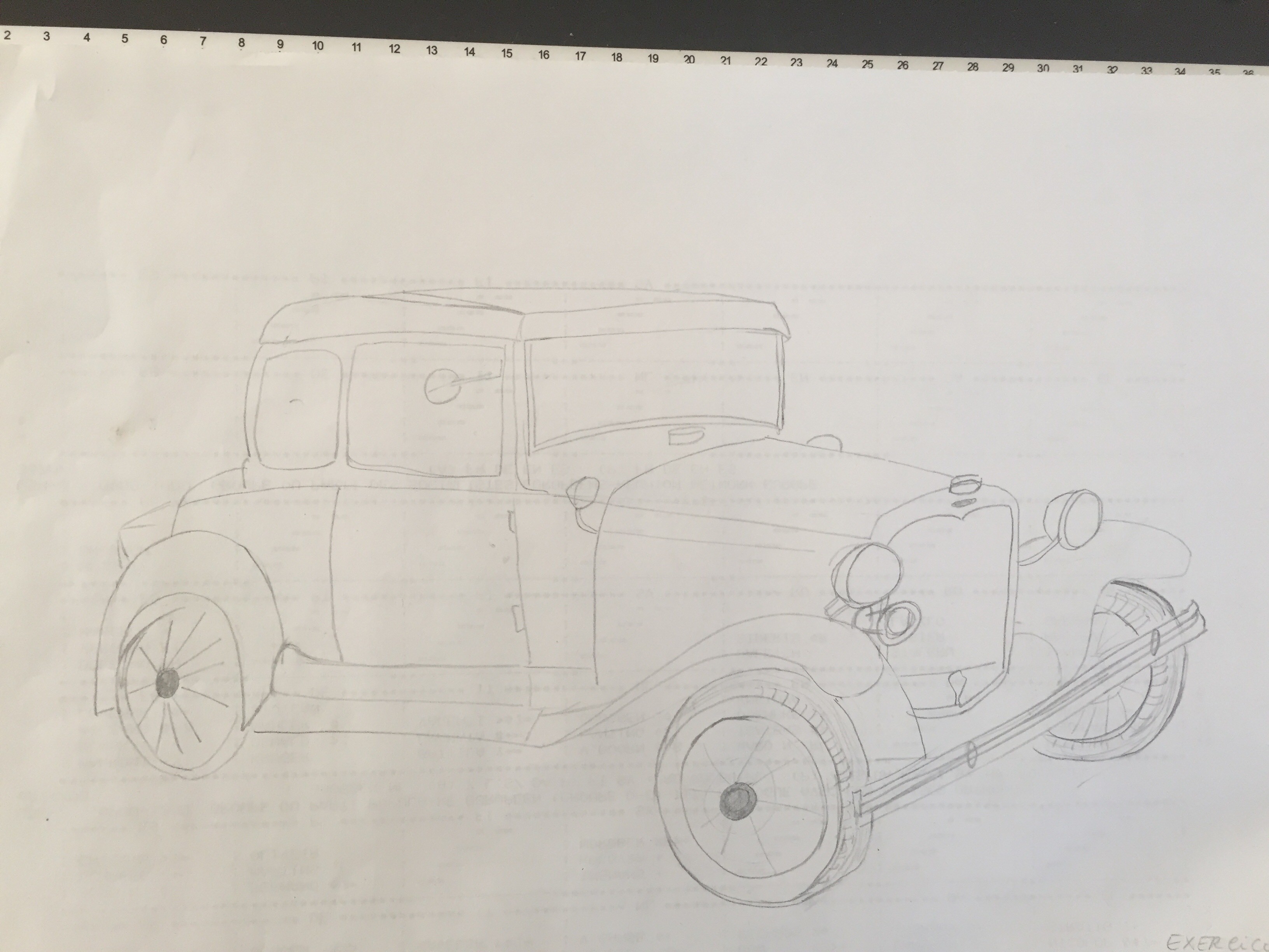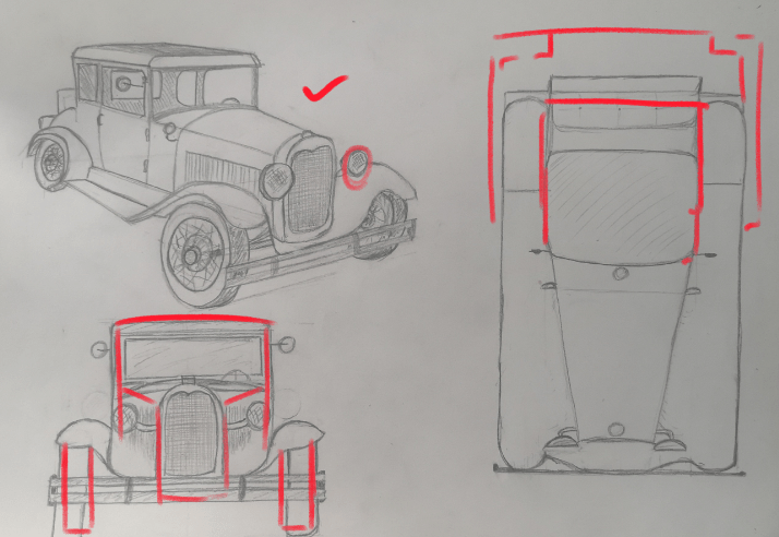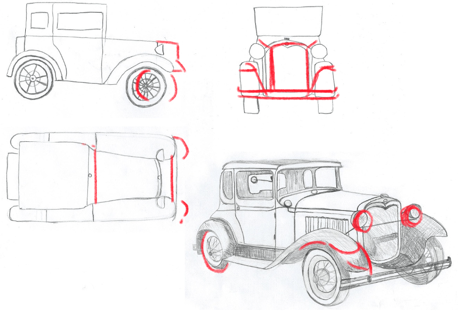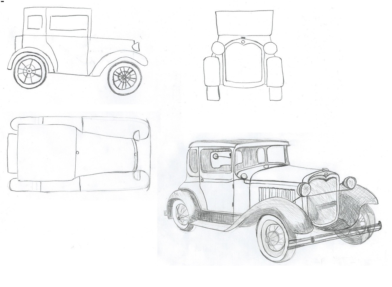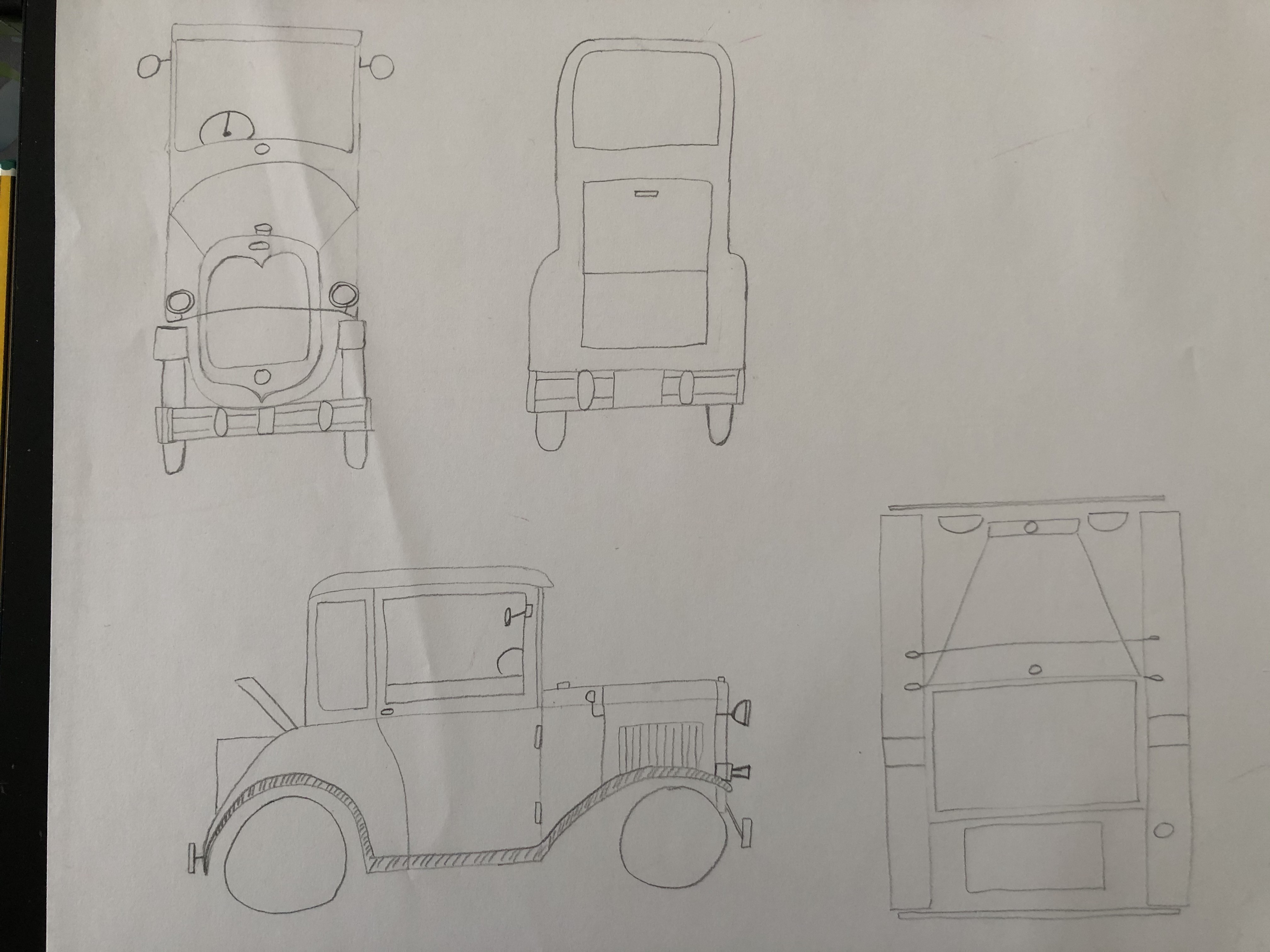 Great work, but I see a flaw in your profile and front views. They were done as if they were partly seen from above, you have to imagine your gaze in the middle of the object. For the profile view, we should not see the metallic front of the car, nor the top, and we should not see the top of the running board either. For the front view, we should not see the rear wheels. For the top view, it's good, but watch out: the fenders do not taper towards the front, they continue straight, and don't forget the bumper. For the construction, you've got it right :)