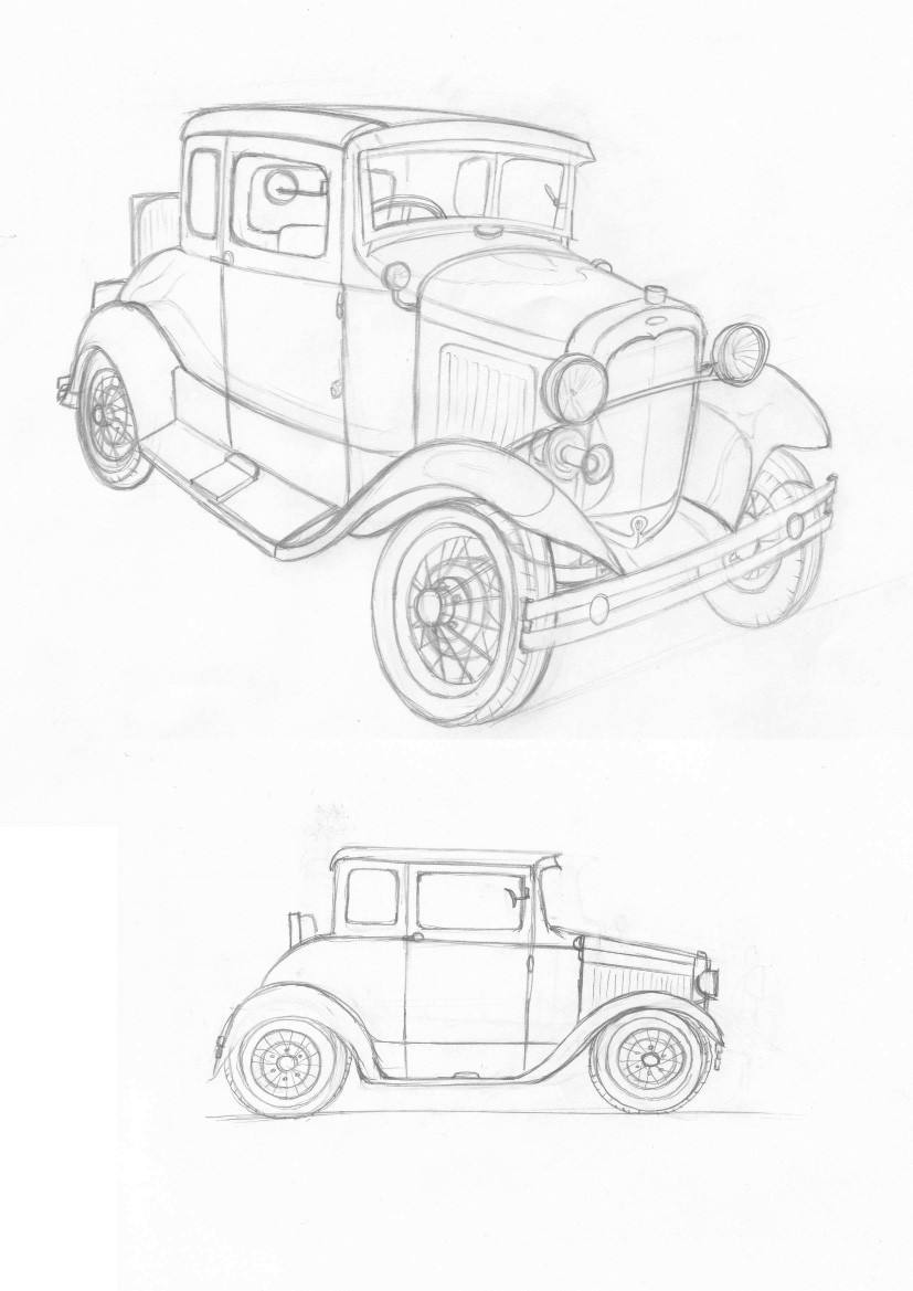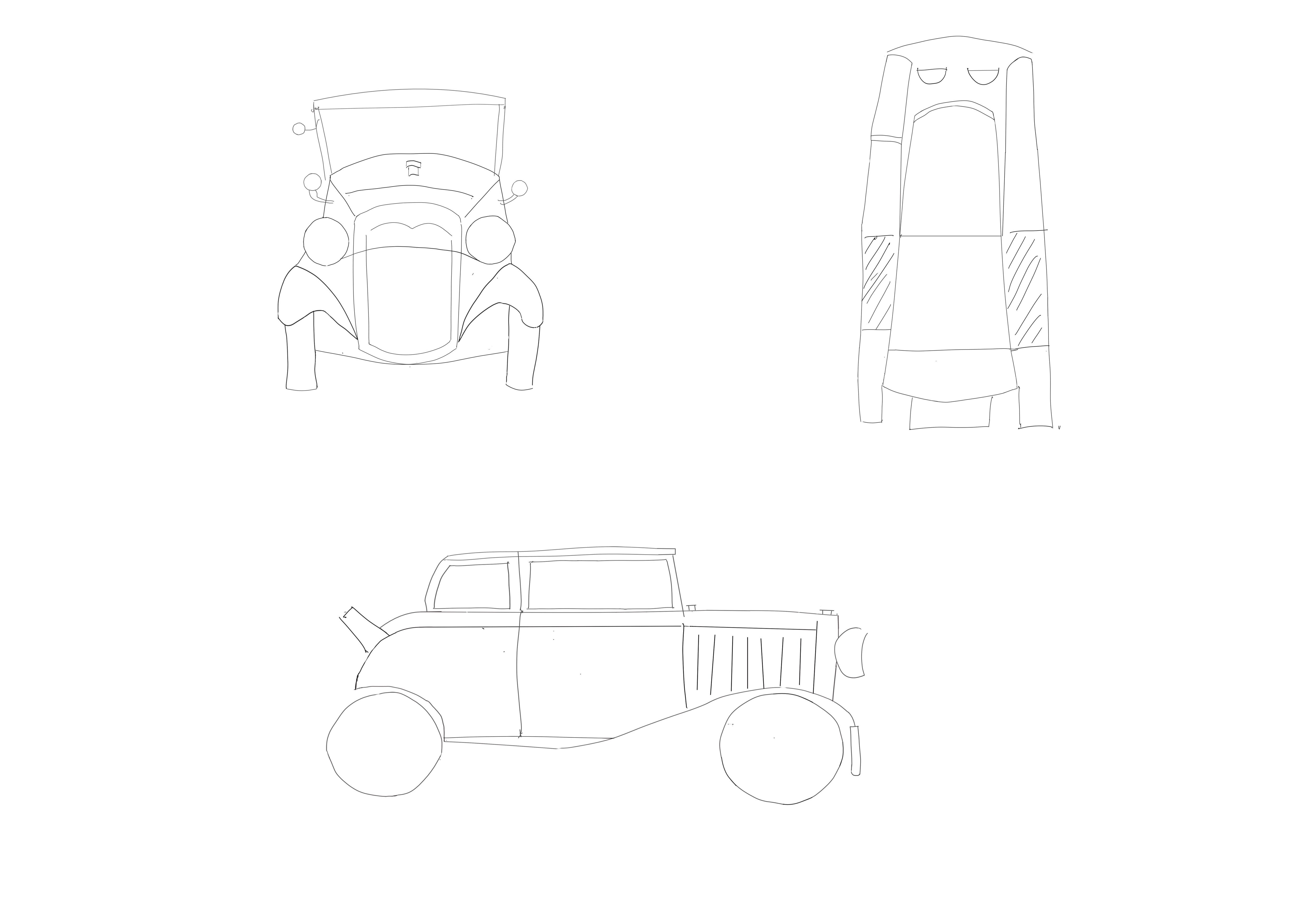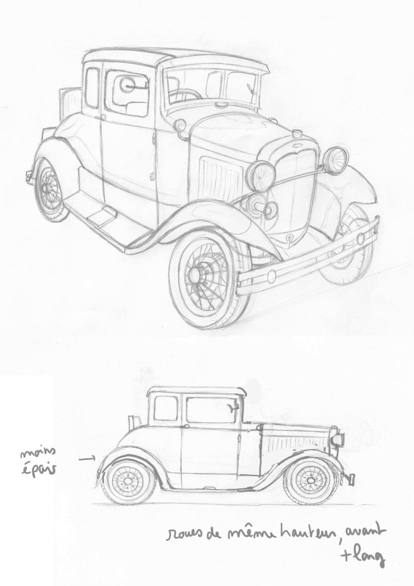 Bien joué, la voiture est bien comprise :) Attention juste au garde-boue à l'arrière sur la vue de profil qui descend un peu trop vers le sol, et sur la vue de dessus la voiture est trop allongée. En fait l'habitacle vu de dessus serait plutôt carré, donc en élargissant la voiture on se retrouverait avec des proportions plus justes. En tous cas c'est du très bon travail 🙂