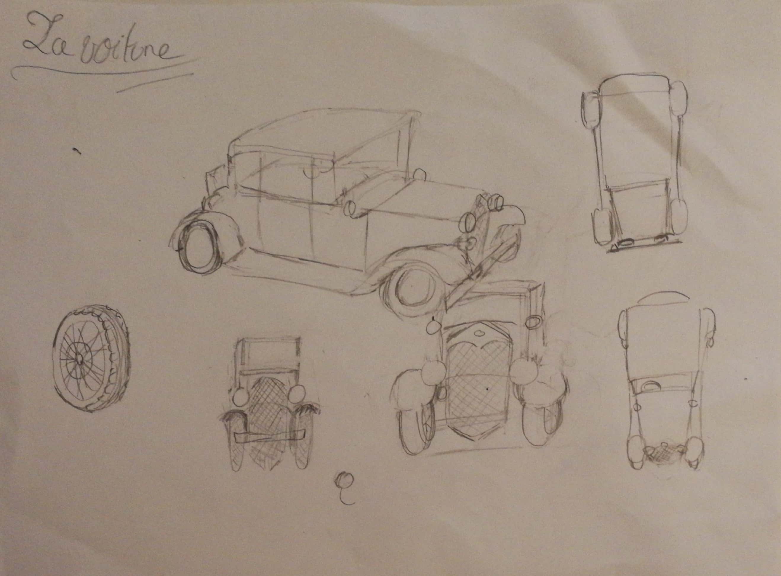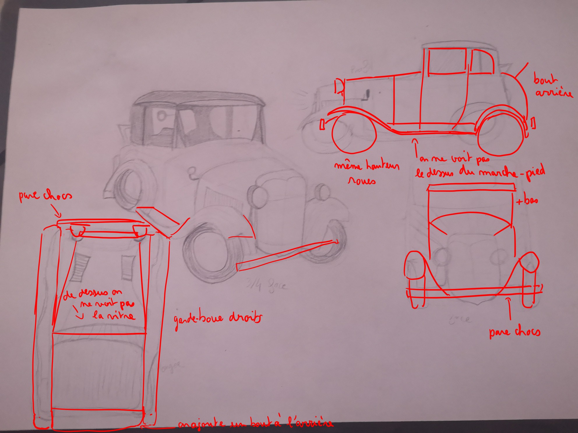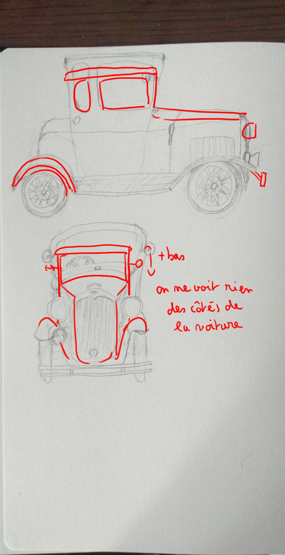 Mais non, j'en vois de tous les niveaux des dessins, et là c'est plutôt bien 🙂 La vue de base en perspective est bien, les roues sont un peut petites. La vue de face est plutôt comprise dans le principe, attention le pare-brise est moins haut et j'ai corrigé des petits soucis visuellement. Pour la vue de dessus les garde-boue sont droits et attention aux proportions entre l'habitacle et l'avant de la voiture. Je vois 2 autres vues en perspective mais ce n'est pas encore demandé pour cet exercice vu que la perspective n'est pas encore vue. Et une voiture n'est pas le plus facile pour débuter sur le sujet. ça sera mieux vu dans les prochains cours 🙂 Joli travail au global !
