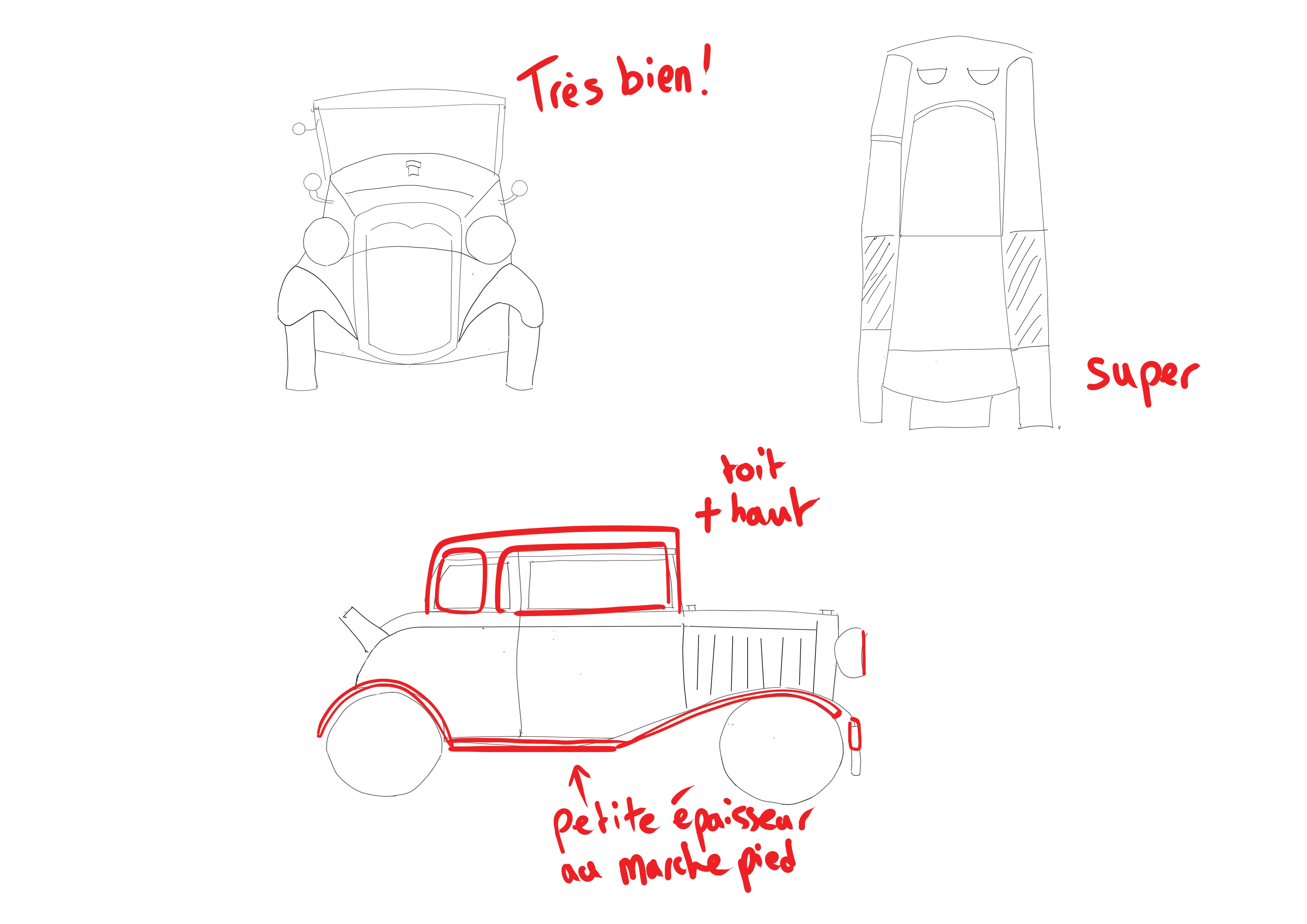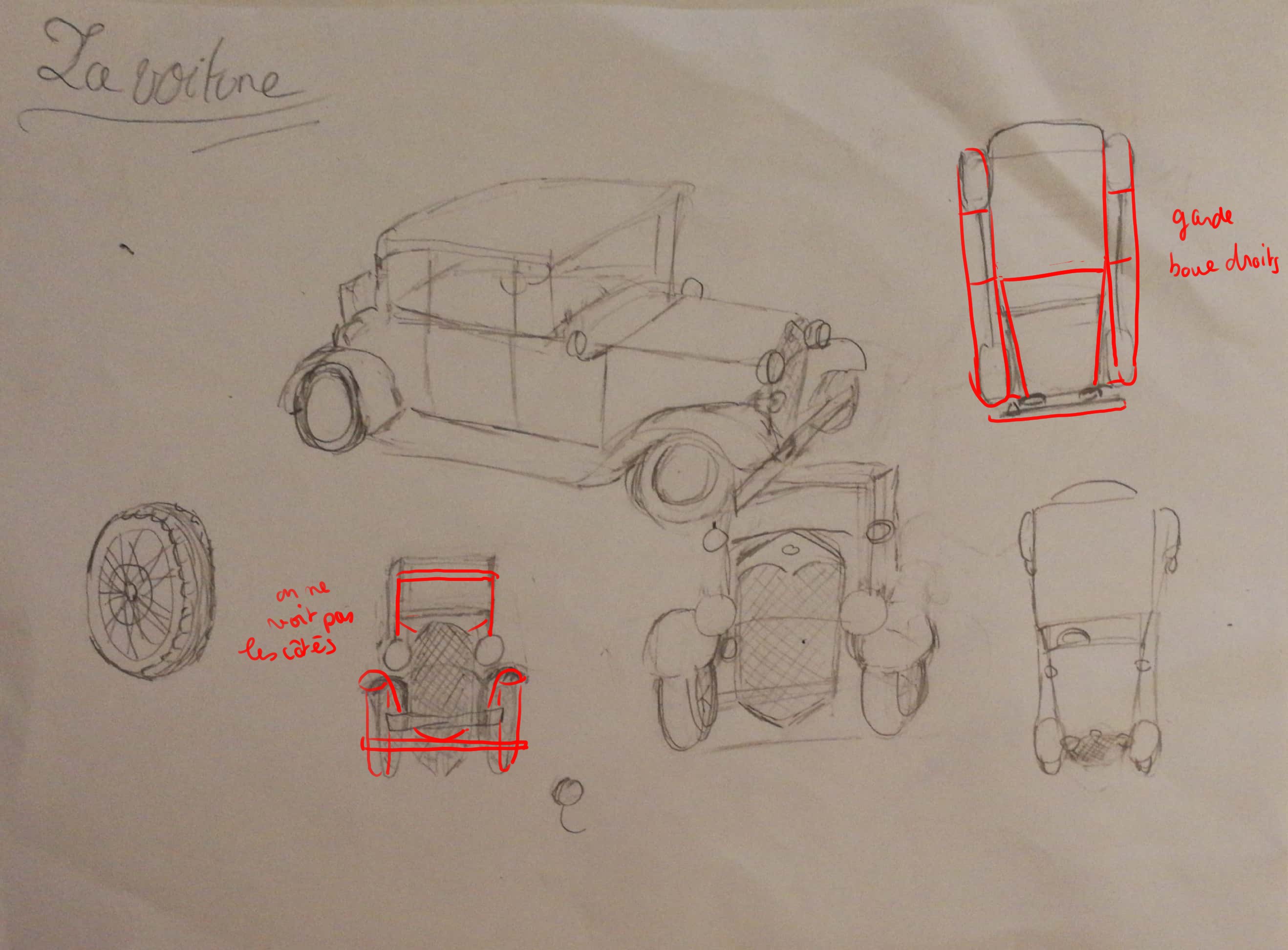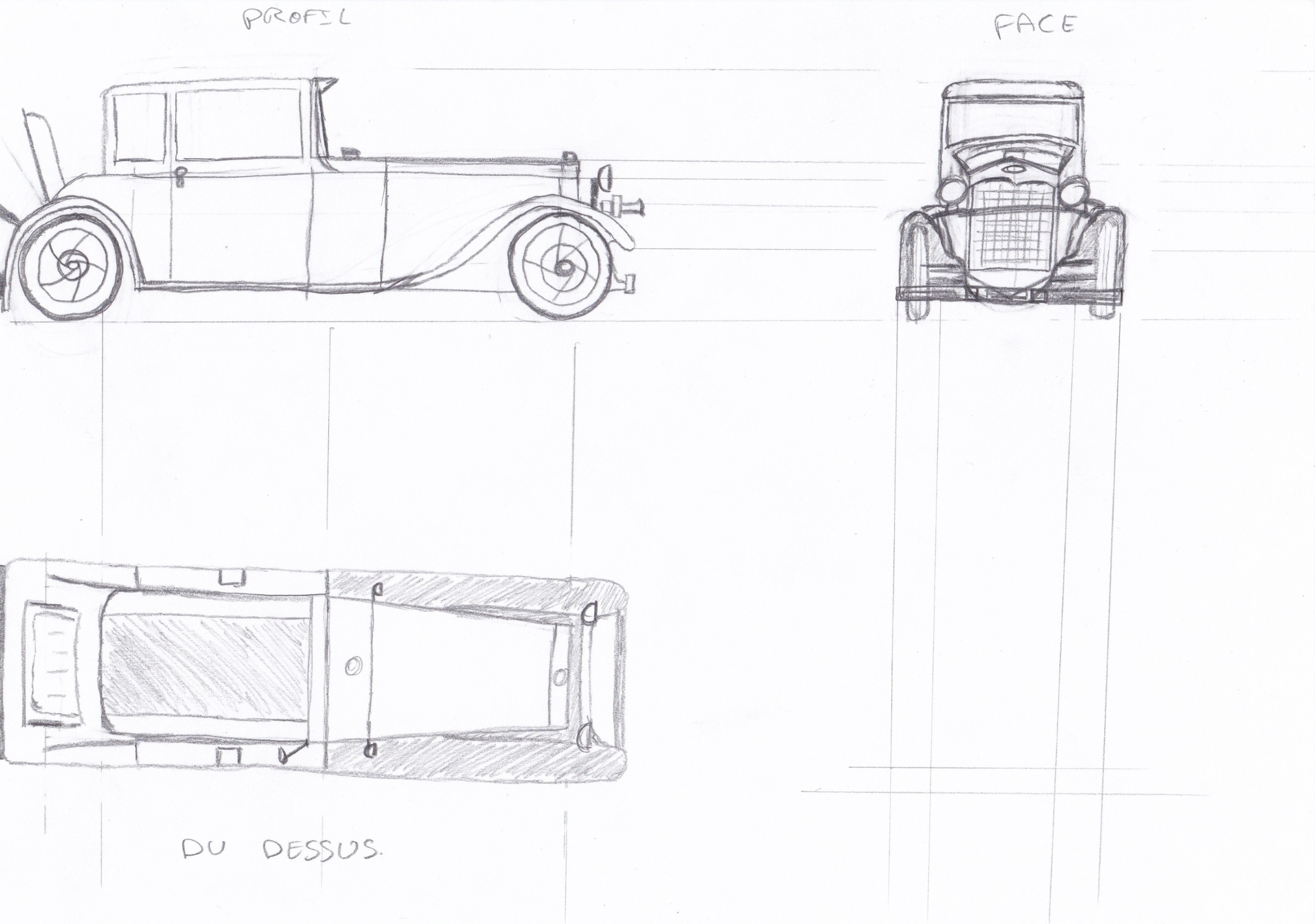 Mais non, j'en vois de tous les niveaux des dessins, et là c'est plutôt bien 🙂 La vue de base en perspective est bien, les roues sont un peut petites. La vue de face est plutôt comprise dans le principe, attention le pare-brise est moins haut et j'ai corrigé des petits soucis visuellement. Pour la vue de dessus les garde-boue sont droits et attention aux proportions entre l'habitacle et l'avant de la voiture. Je vois 2 autres vues en perspective mais ce n'est pas encore demandé pour cet exercice vu que la perspective n'est pas encore vue. Et une voiture n'est pas le plus facile pour débuter sur le sujet. ça sera mieux vu dans les prochains cours 🙂 Joli travail au global !