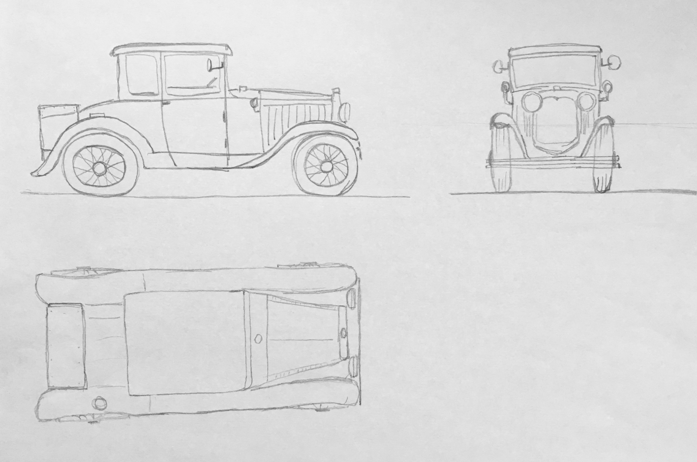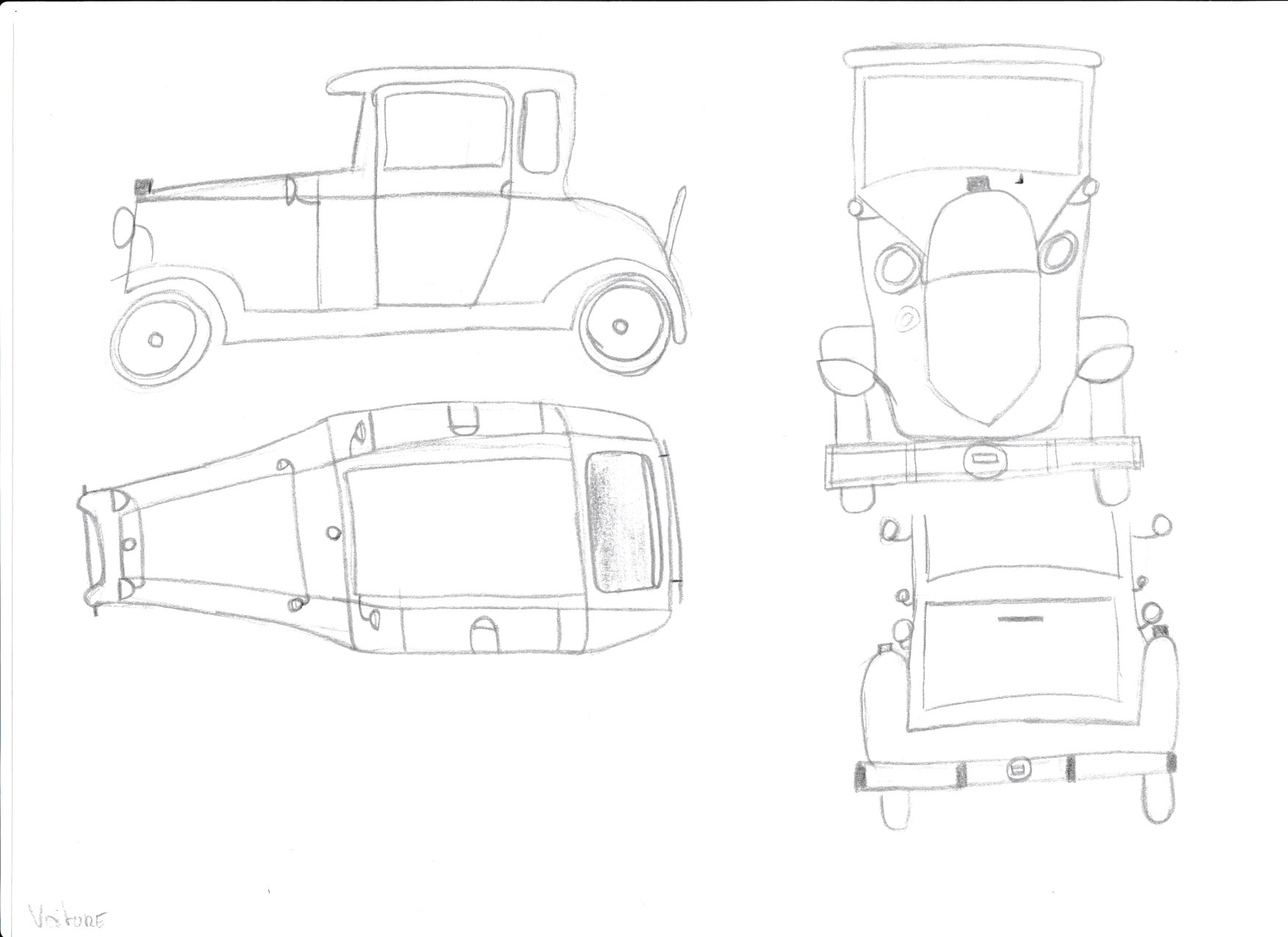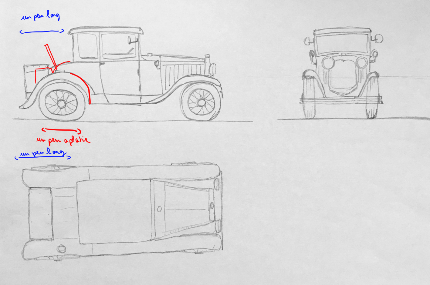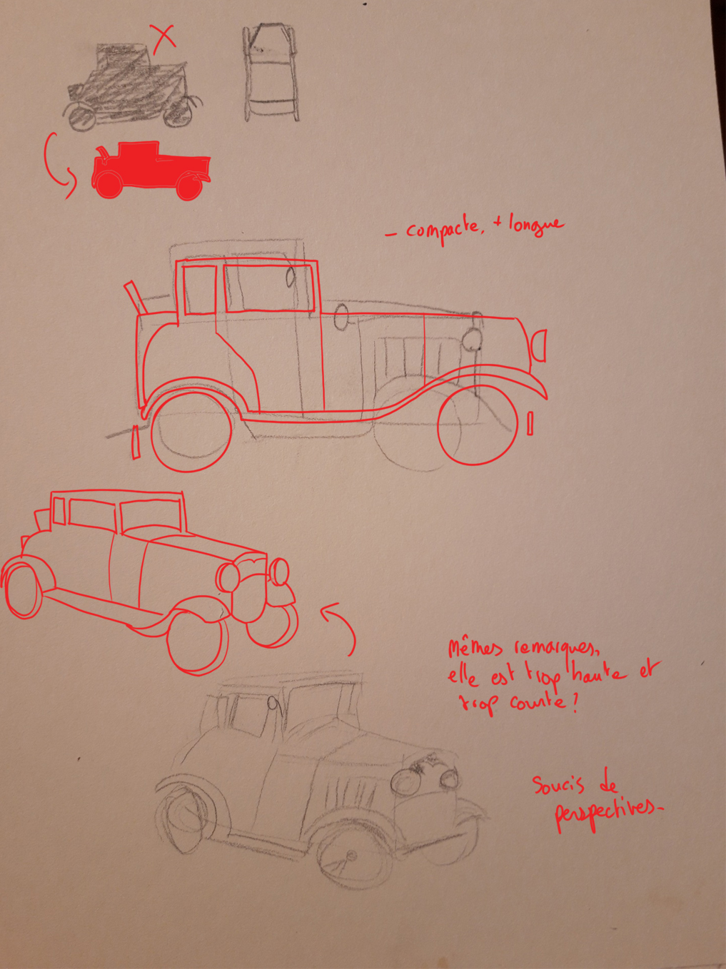 Hello Oxiane, Congratulations on your drafts, it's a complex subject! Here is my correction; generally speaking, you made your car too tall and short compared to the model.