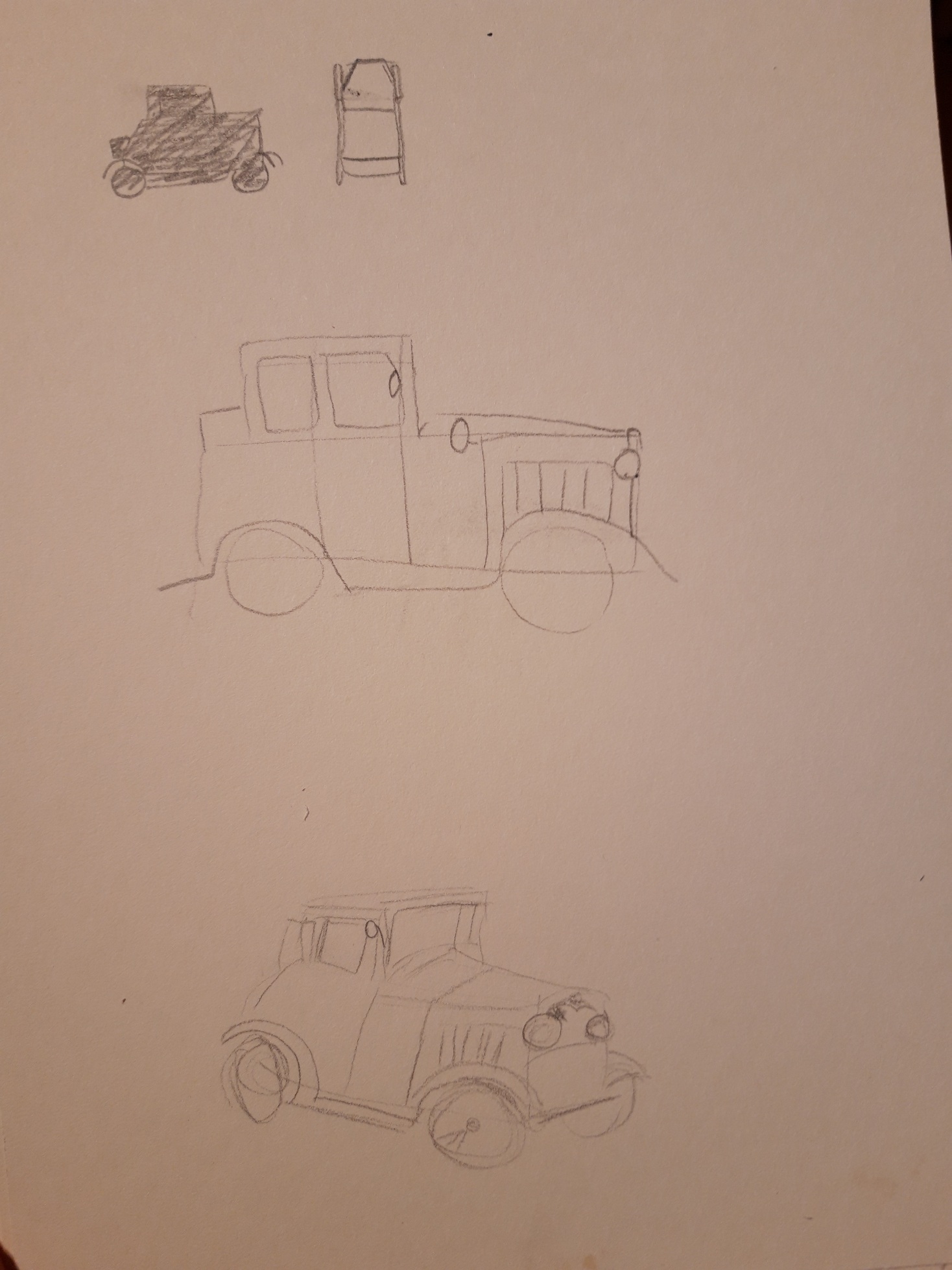 voici le travail préparatoire sur la voiture. En haut à gauche, c'était une simple ébauche pour voir les proportions (ratée, mais cela m'a permis de faire les deux autres).