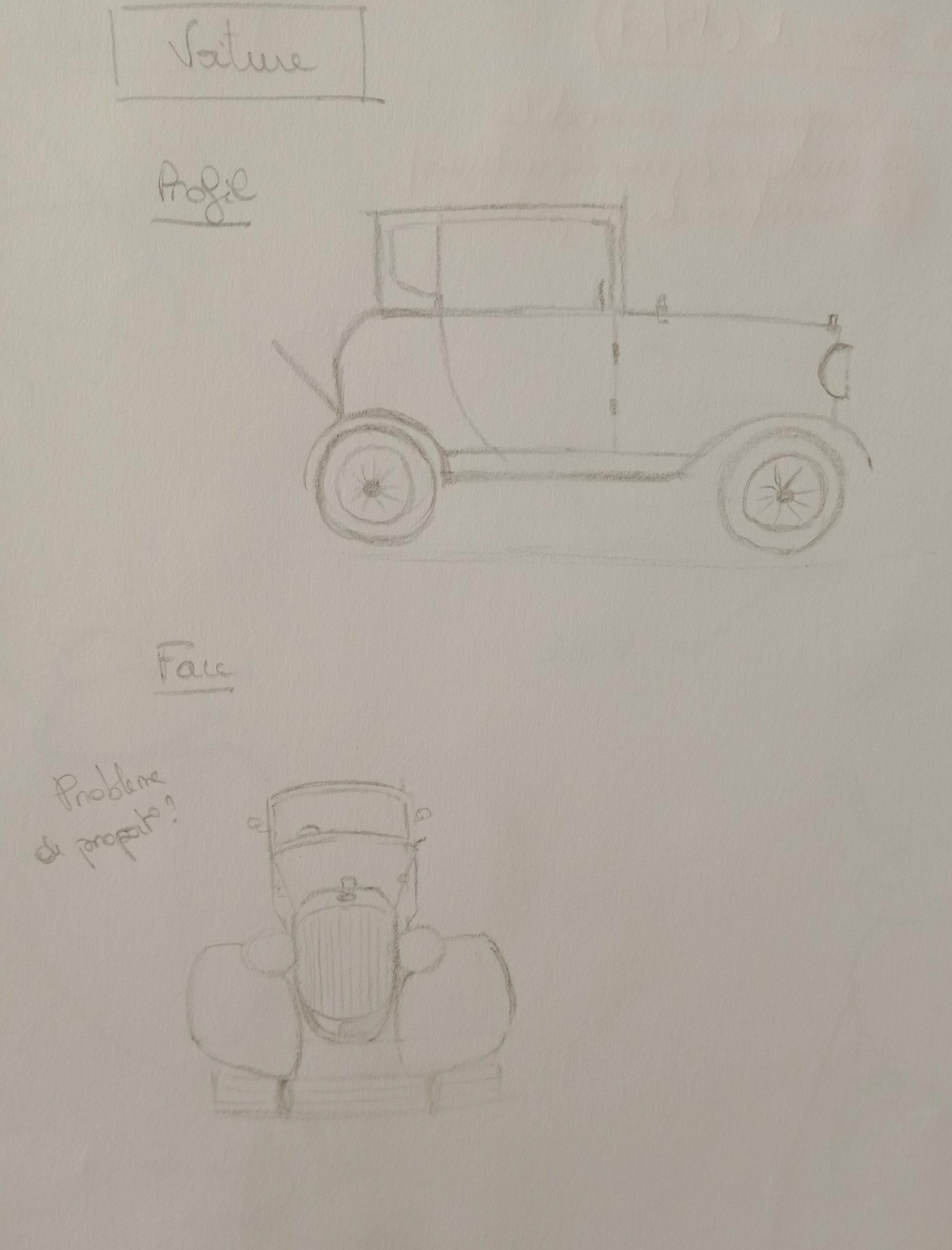 La vue de profil est plutôt bien comprise :) Pour la vue de face la construction est pas mal mais les garde-boue sont trop gros et l'avant de la voiture semble trop de dessus. Il faut bien s'imaginer avec le regard en face de la voiture. Pour les garde-boue on ne voit que le bout qui redescend vers l'avant. Et le pare-chocs est devant les roues, pas si gros. Pour l'instant on n'est pas sur de la perspective à point de fuite donc il n'y a pas à faire plus gros ce qui est proche, sinon ça biaise les dimensions réelles que l'on veut analyser. J'ai fait des croquis sur les dessins, j'espère que ça aidera 🙂