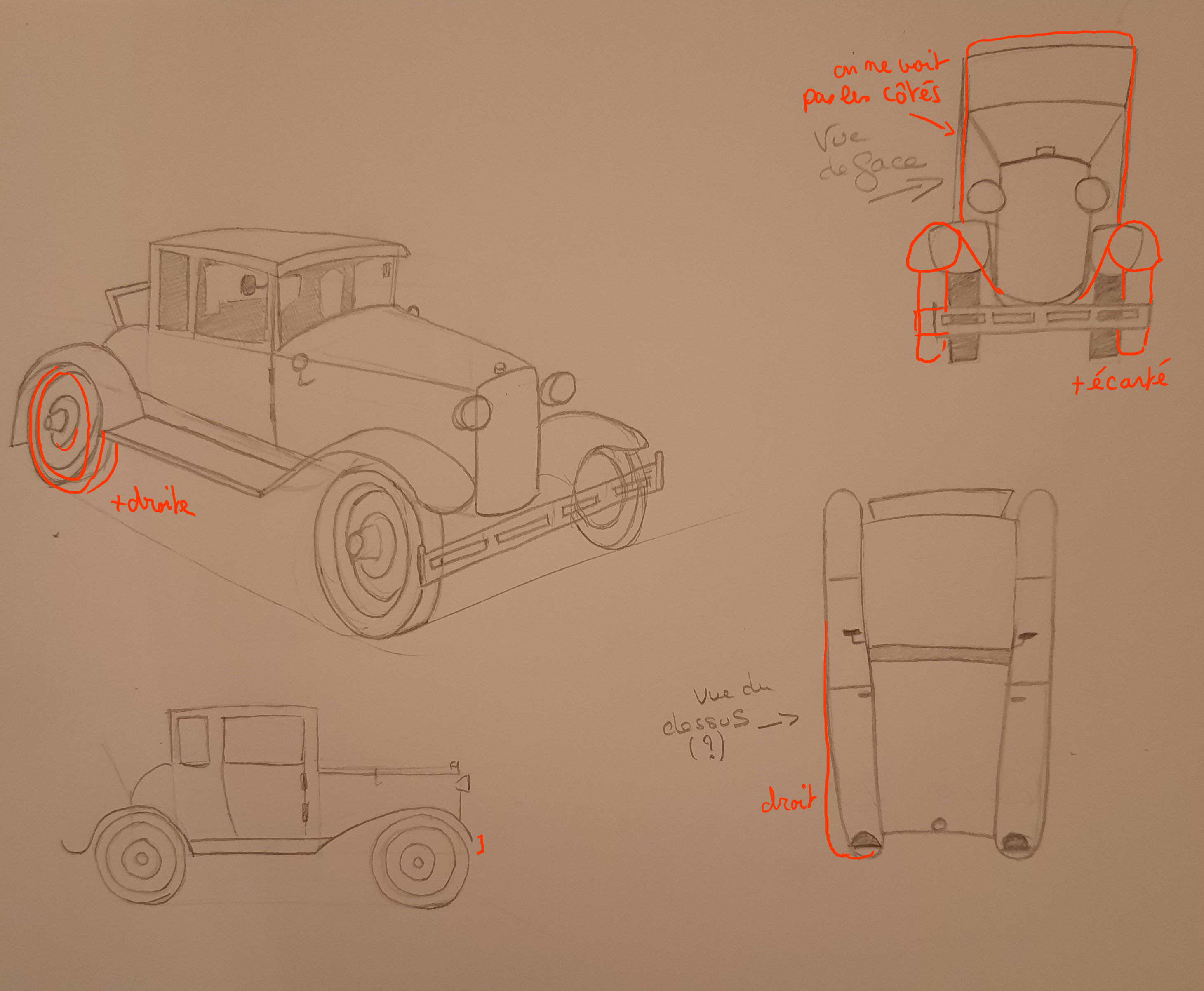 Voici ma correction sur ta voiture. Dans l'ensemble c'est bien, par contre attention, ta vue de dessus n'est pas bonne.