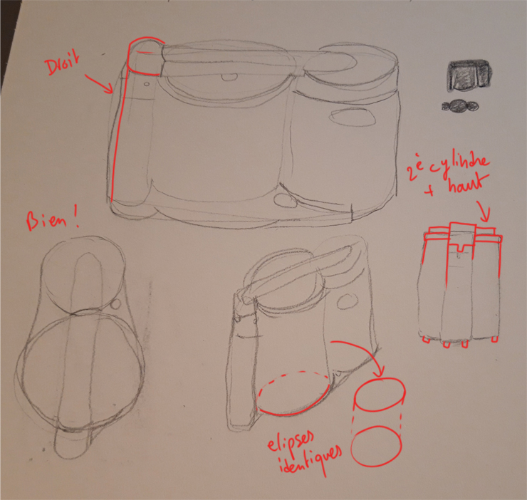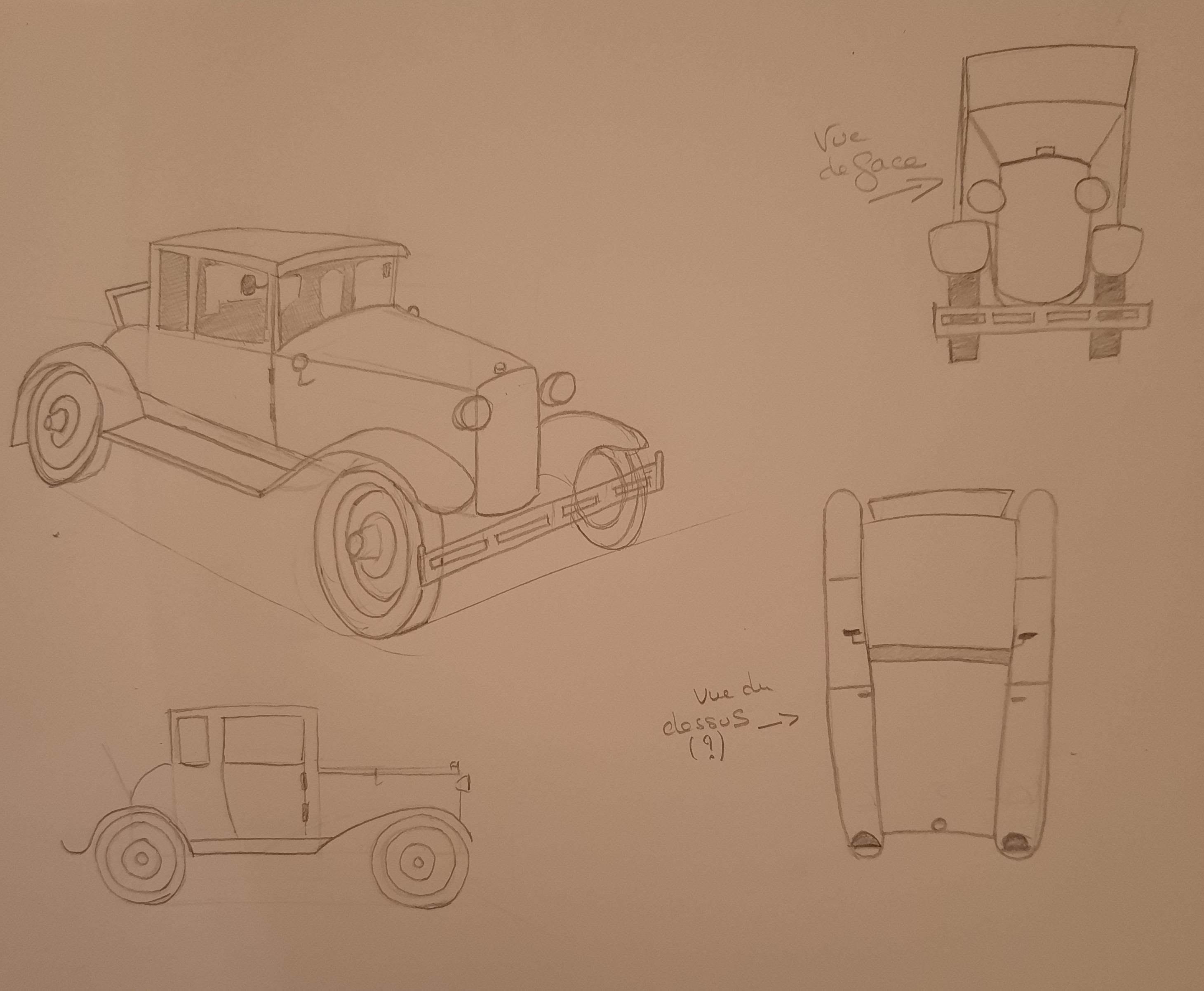 here is the preliminary work on the car. In the top left, it was a simple sketch to see the proportions (failed, but it helped me to do the other two).