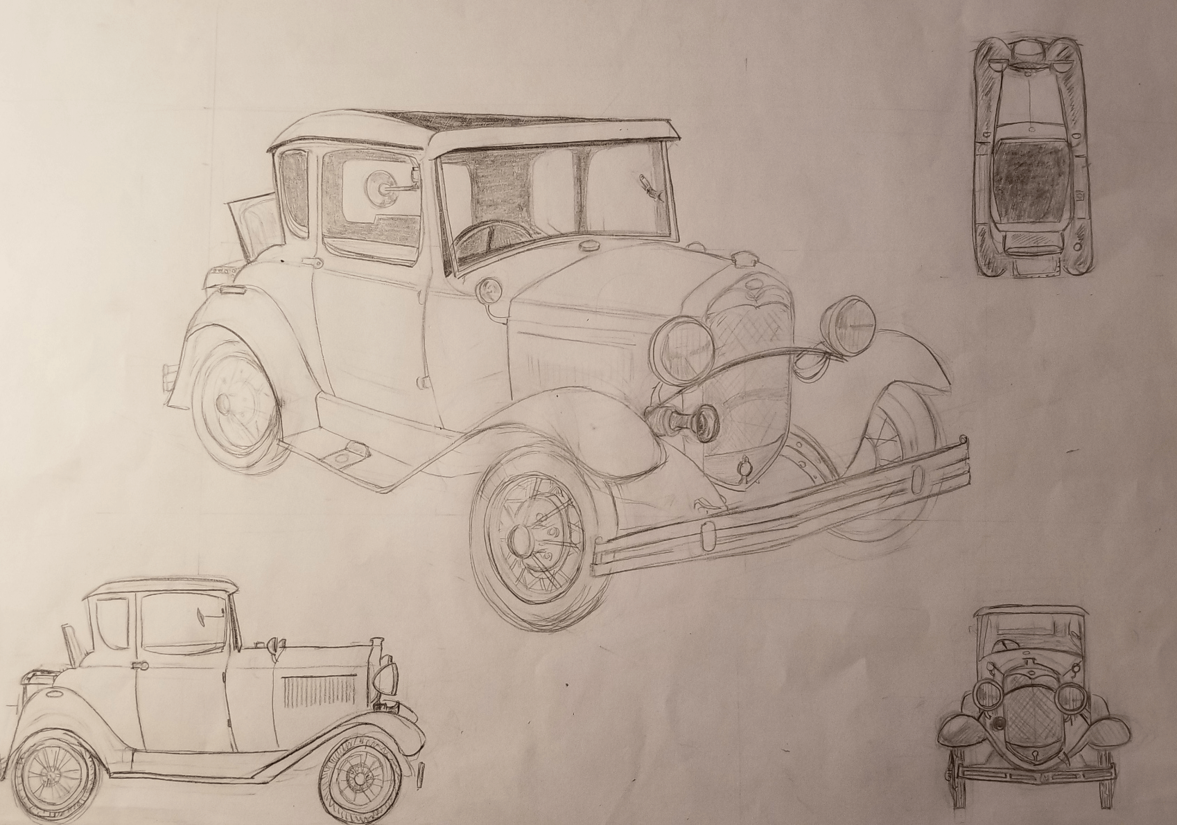 Joli travail sur cette voiture, bien comprise :) Attention avec la cohérence des points de vue sur certains éléments. Il faut s'imaginer bien le regard au milieu de l'objet. Par exemple sur une voiture de profil, on ne verra pas du tout le devant de la voiture, ou le phare de derrière est aché par celui de devant. Pour la vue de face pareil, il faudrait être un peu de dessus pour voir les roues arrière, là on ne doit pas les montrer. J'ai corrigé visuellement ^^