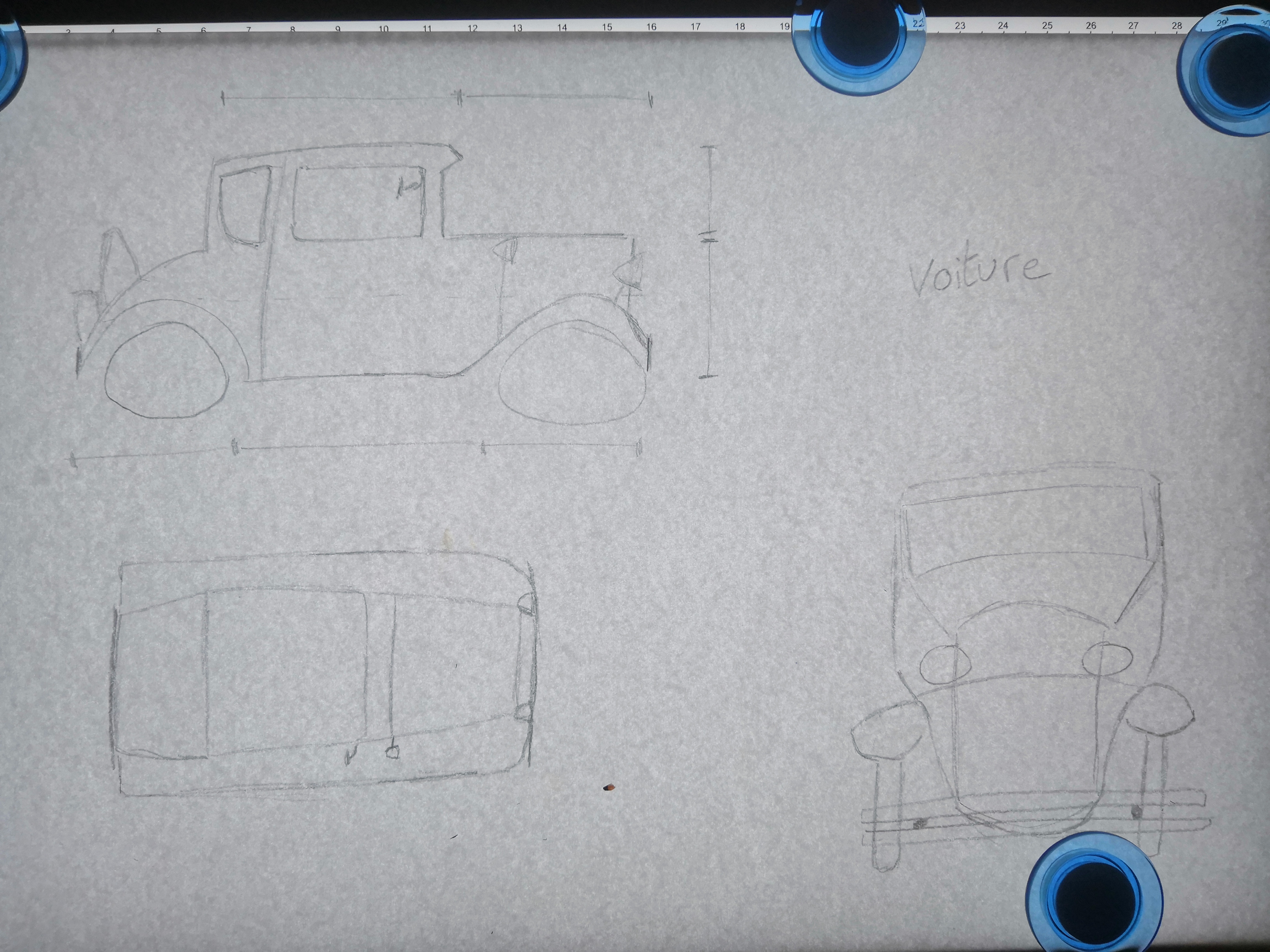 Pour la vue de dessus, on doit voir la voiture comme une espèce de gros rectangle. Je te montre un exemple ici pour t'aider.