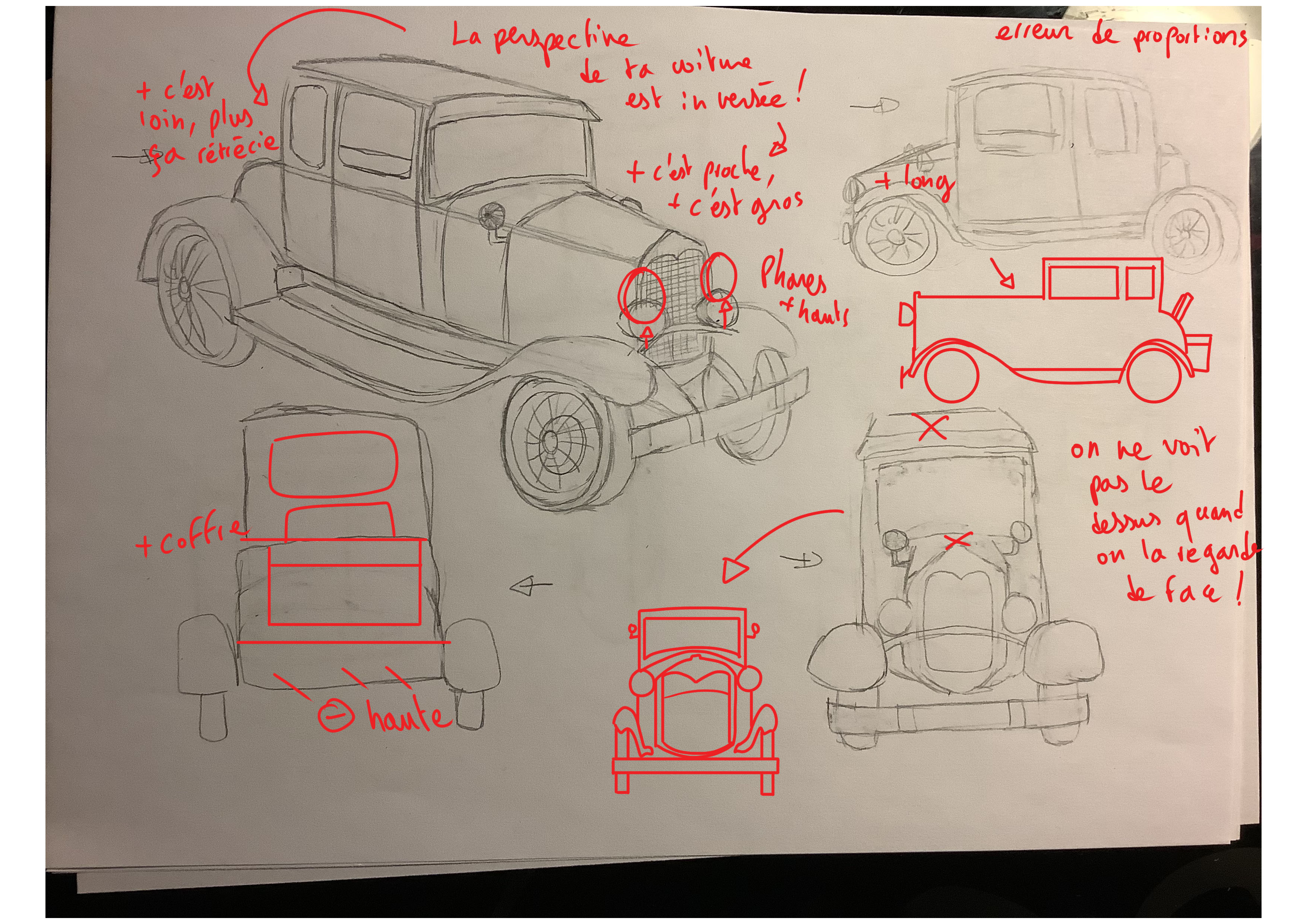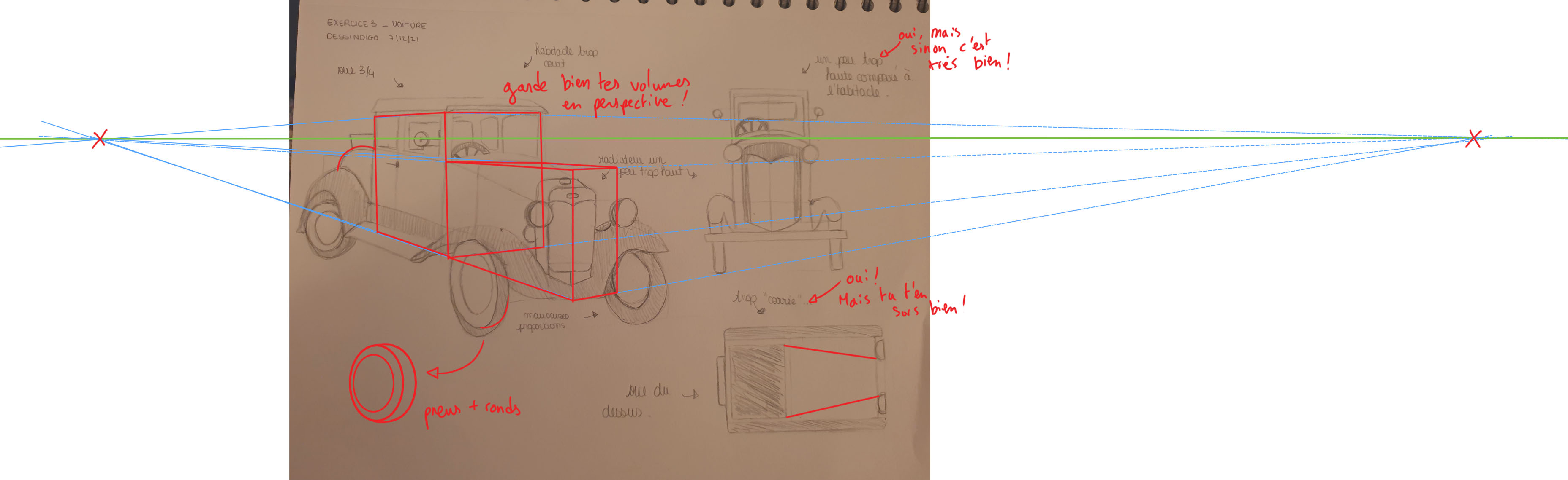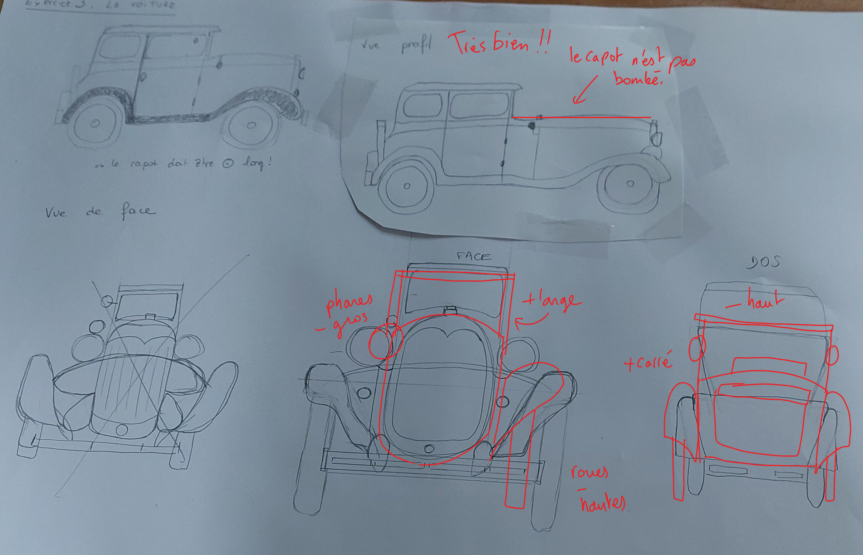 Bonjour Prysm, Tes observations sont plutôt justes bravo! Attention cependant à la perspective de ta voiture de 3/4, elle est déformée car tes volumes ne correspondent pas à la même perspective. Sinon ta vue de face et de dessus sont plutôt bonnes, tes observations aussi, trop carrée vue du dessus et trop haute vue de face effectivement. Voici ma correction dessinée pour plus de détails.