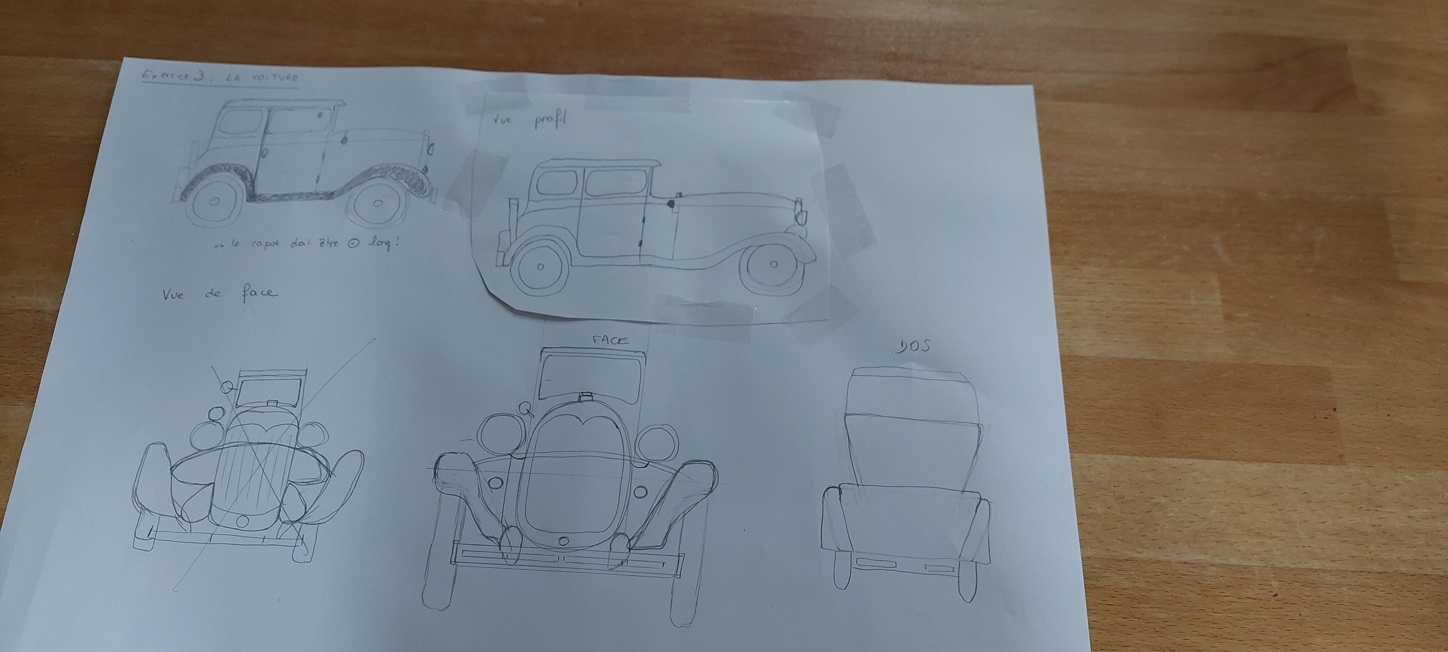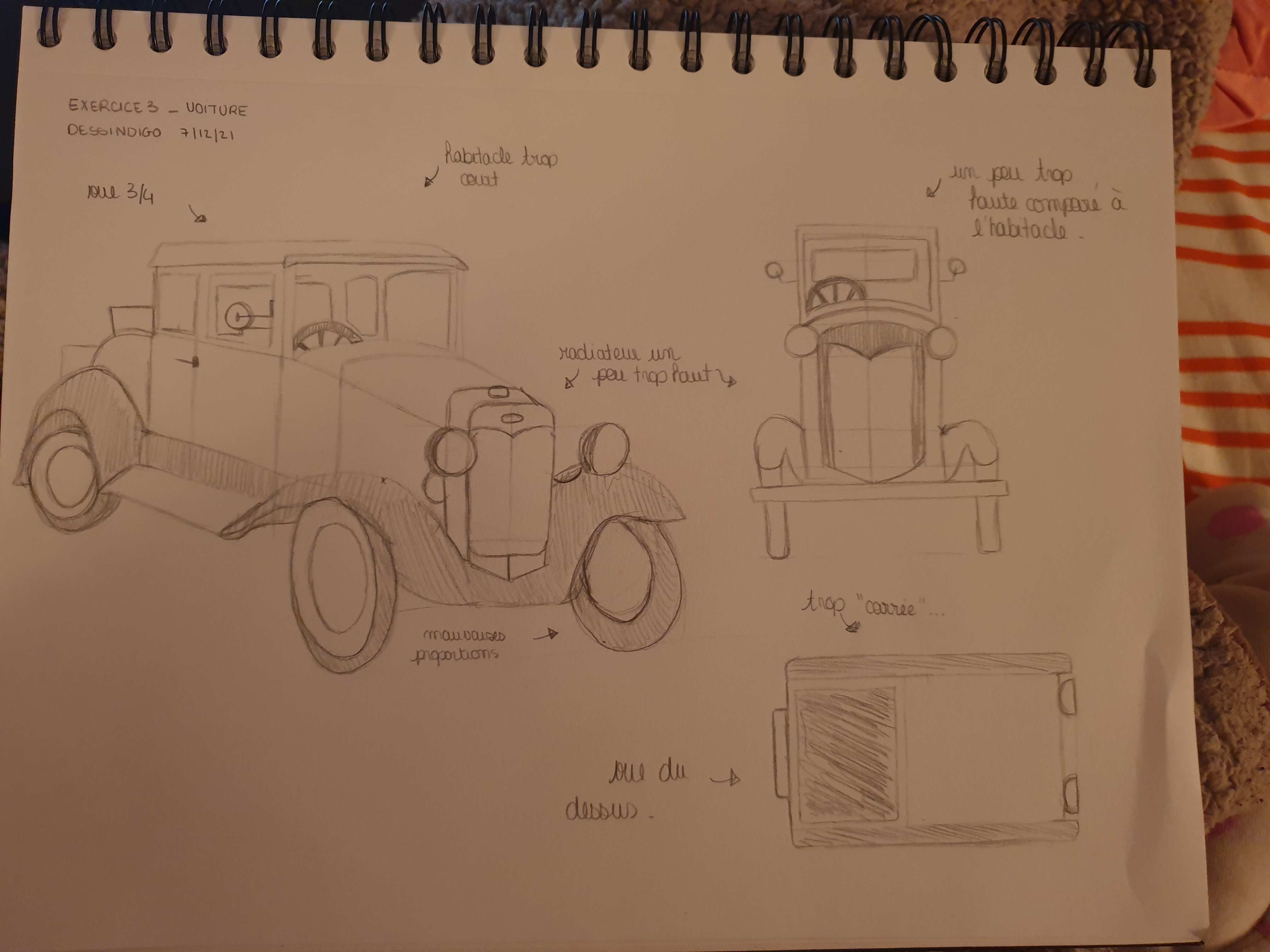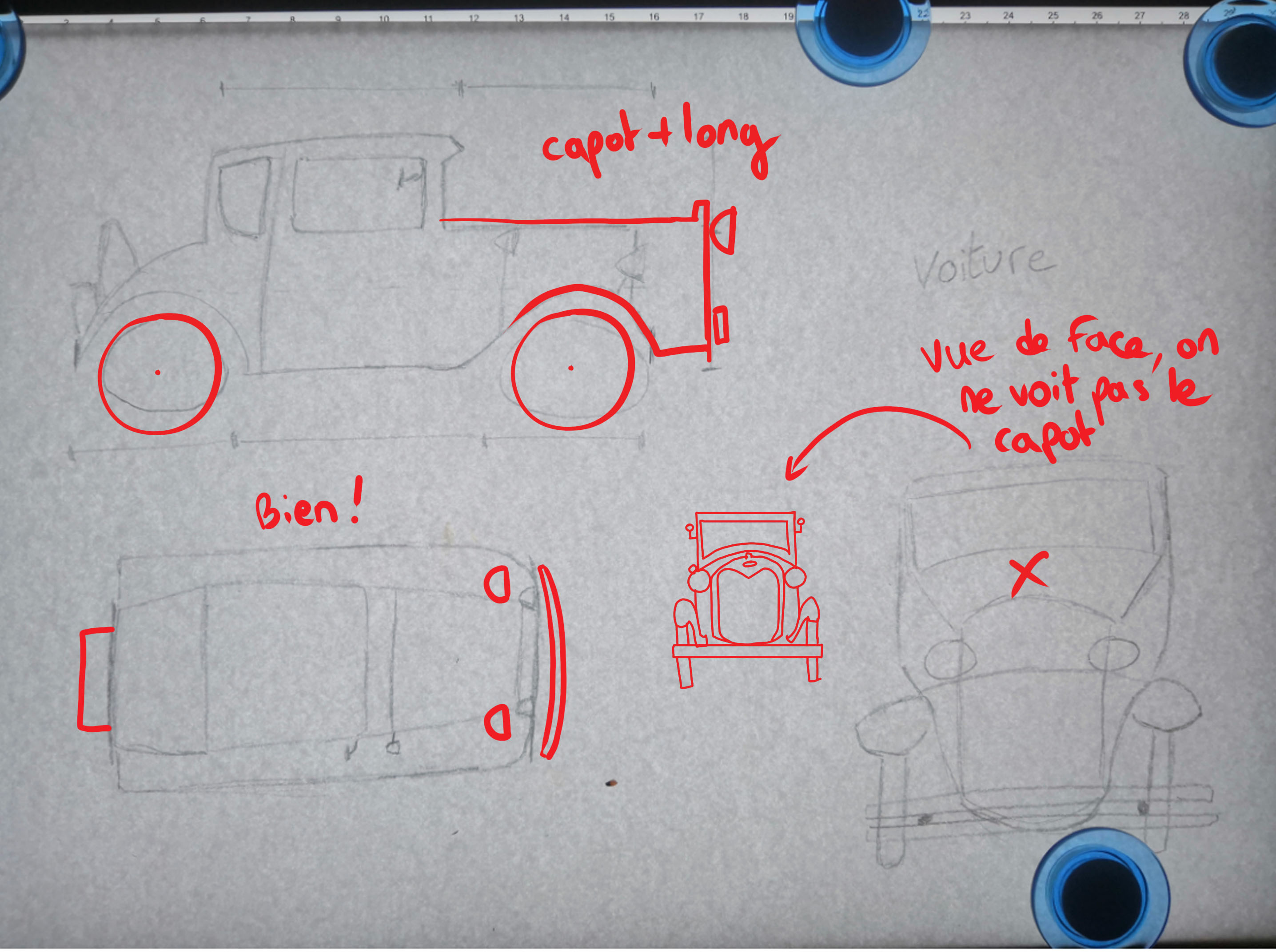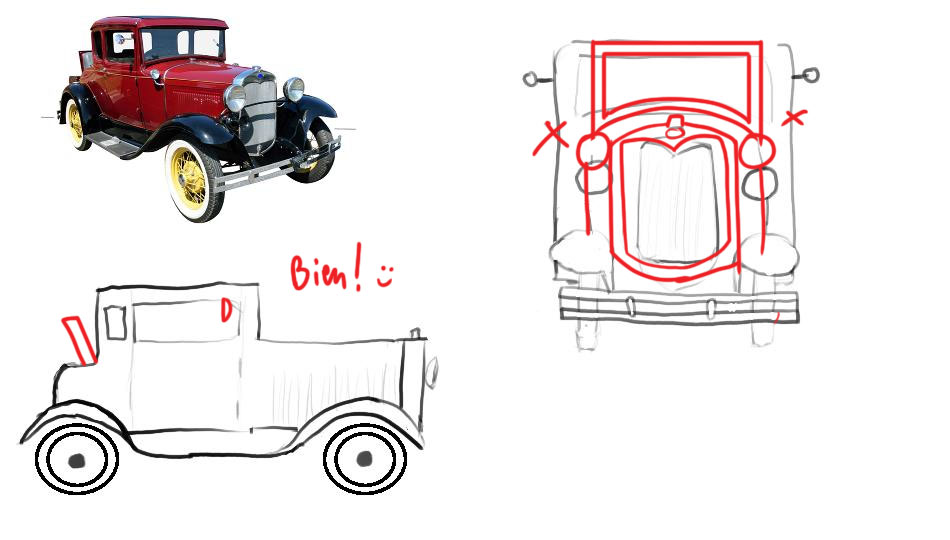 Bonjour Prysm, Tes observations sont plutôt justes bravo! Attention cependant à la perspective de ta voiture de 3/4, elle est déformée car tes volumes ne correspondent pas à la même perspective. Sinon ta vue de face et de dessus sont plutôt bonnes, tes observations aussi, trop carrée vue du dessus et trop haute vue de face effectivement. Voici ma correction dessinée pour plus de détails.