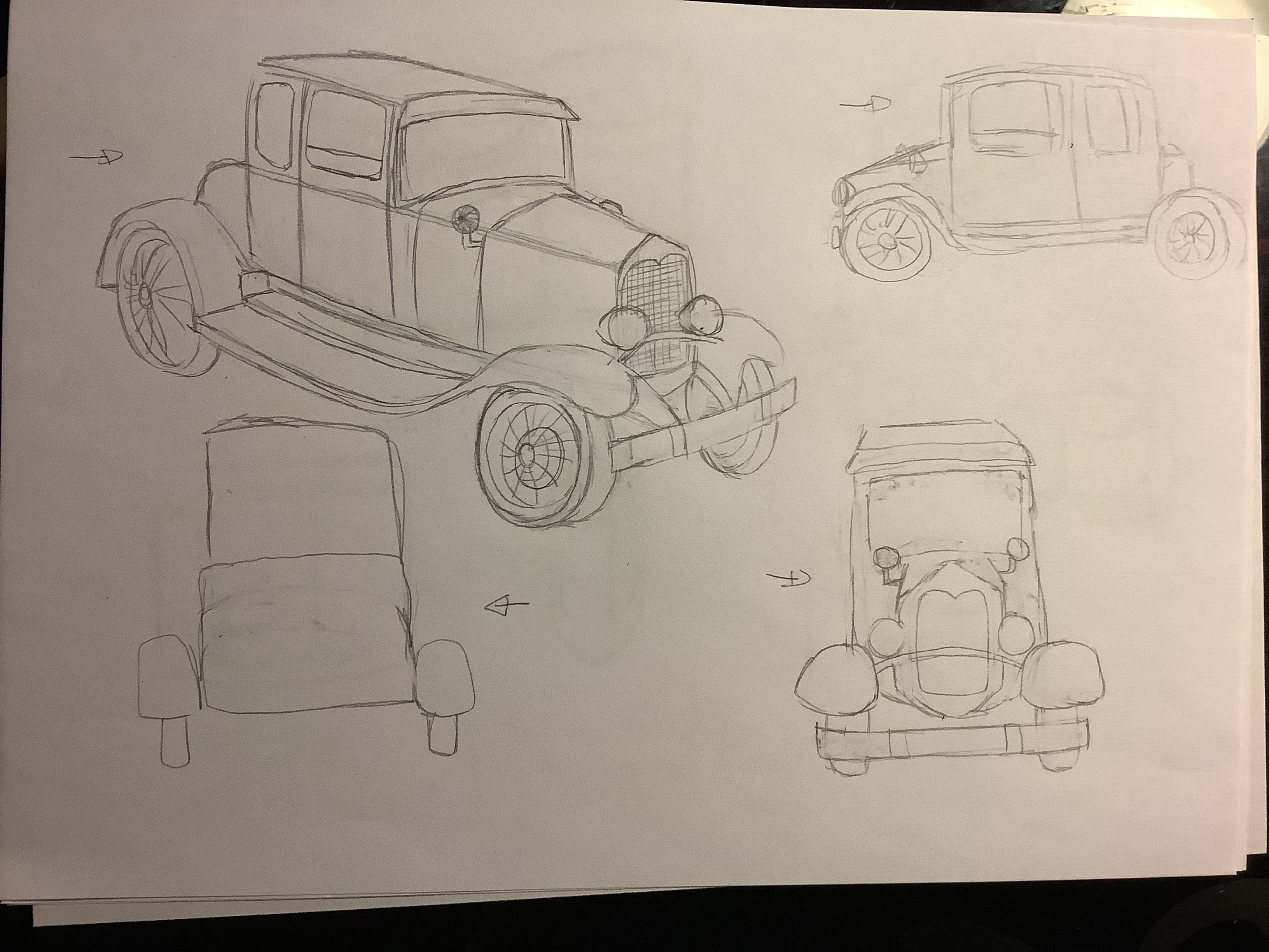 Hello Mathildew06, Your car looks pretty good from a 3/4 angle, but it contradicts a good perspective. Basically, you've shrunk it towards the front instead of shrinking it towards the back. This is what gives it a somewhat weird view. For your side view, the hood is far too short. From the front, it's pretty well done, except that we should not be able to see the top of the hood or the roof. The rear view is also generally correct. Here is my drawn correction: