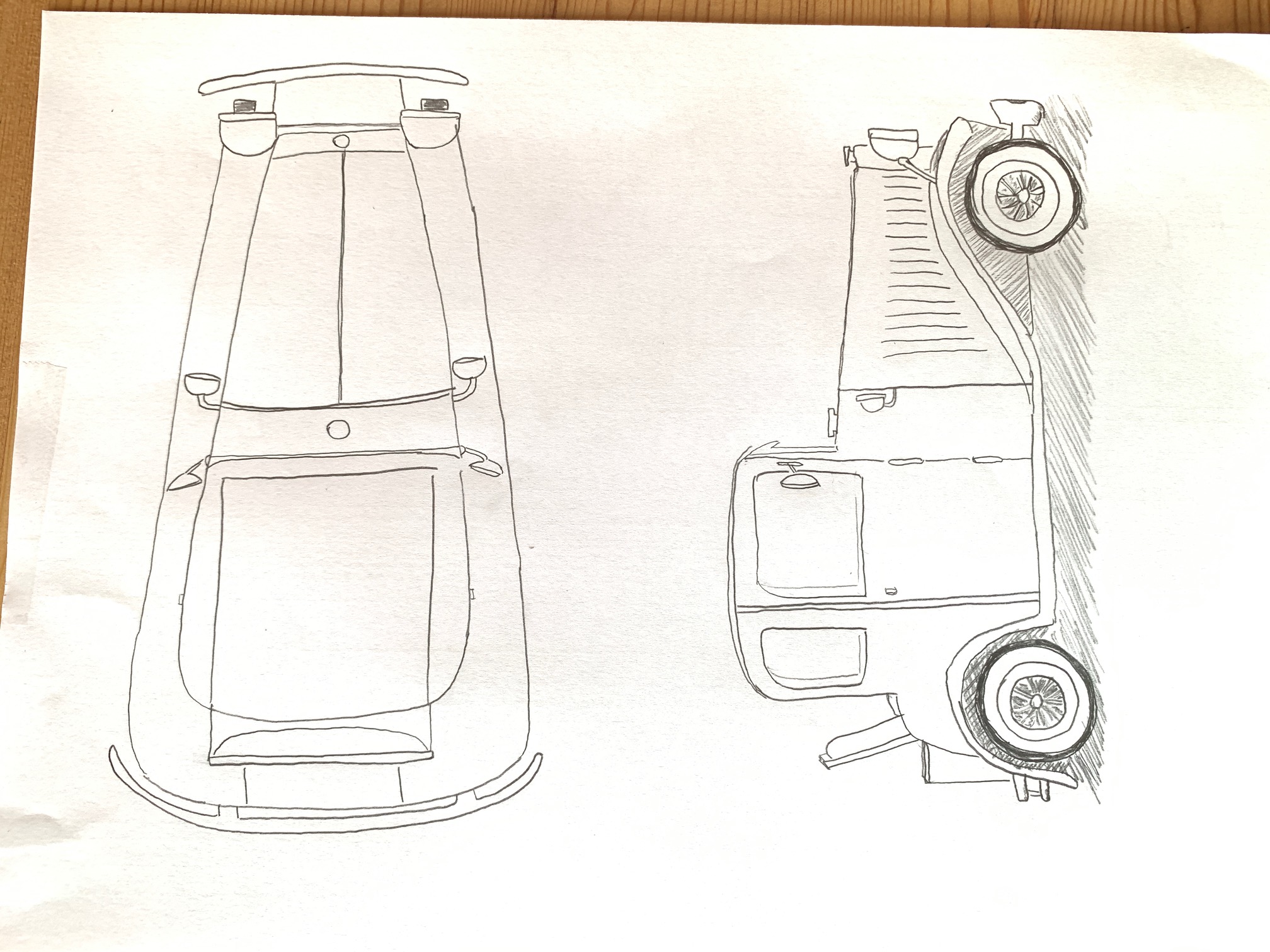 Hello FloB, Your three-quarter view doesn't seem so bad, but indeed, your top view is not understandable. I advise you to refine your drawings a bit more, to propose several views before posting, as it is very difficult for me to correct a sketch. Think of your car as several simple volumes that fit together. Put them in perspective... For the top view, the car should appear like a sort of large rectangle. I show you an example here to help you.