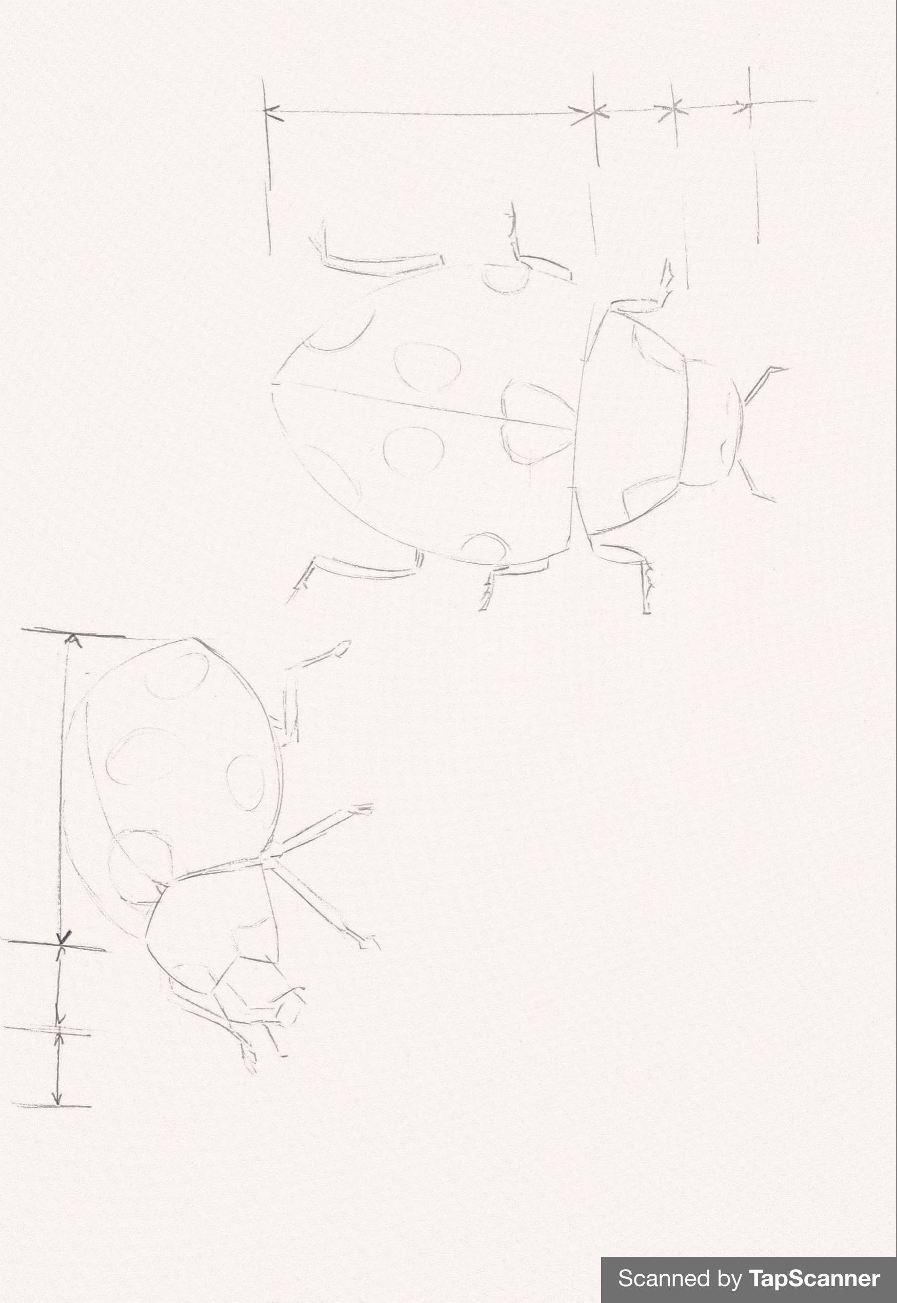 I just wanted to do some quick sketches to estimate the relative sizes of different parts of each object as shown in the video, but I'm really bad at estimating sizes, volumes, etc., and I feel like it doesn't look right, and my ladybug looks like an alien. But I must admit that I've never looked at a ladybug so closely and in detail before...