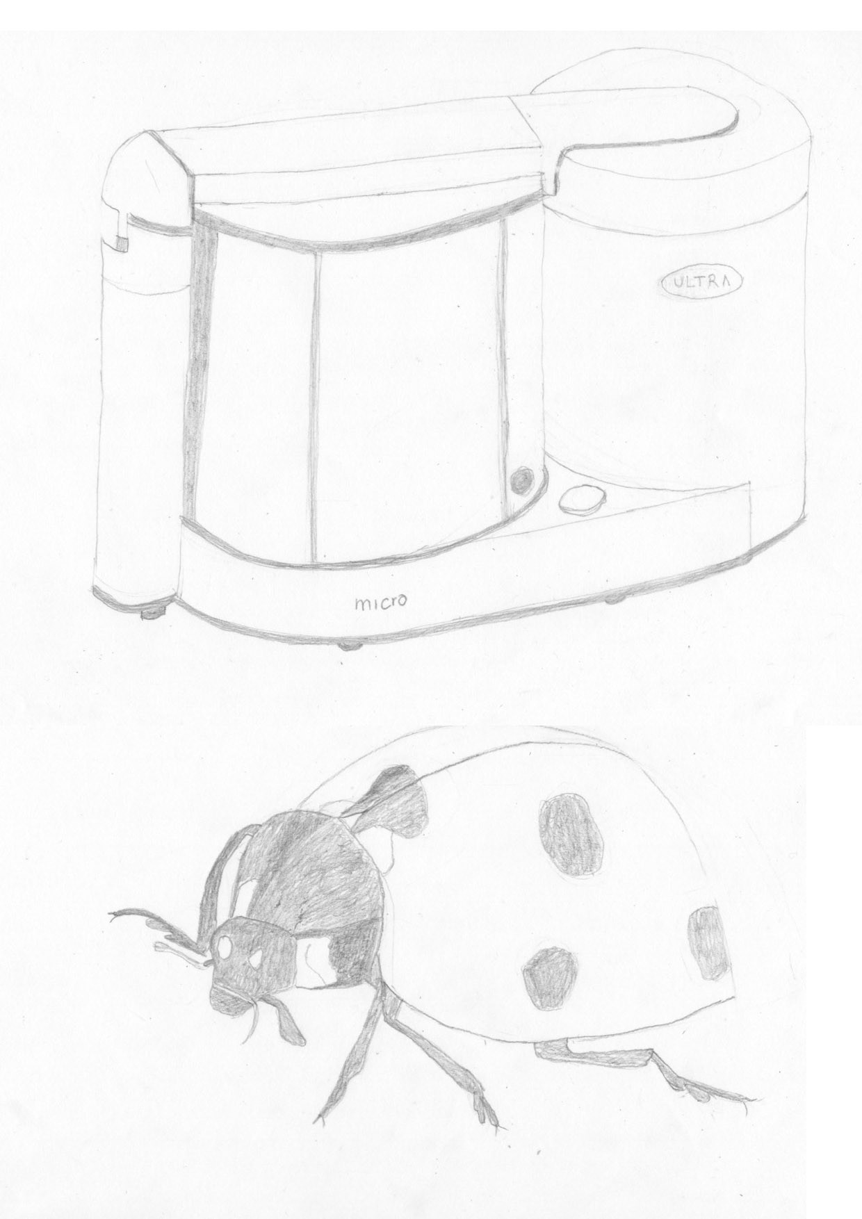 On voit bien que tu cherches à représenter les objets sous tous les angles, à les faire tourner et à bien "expliquer" avec les traits.