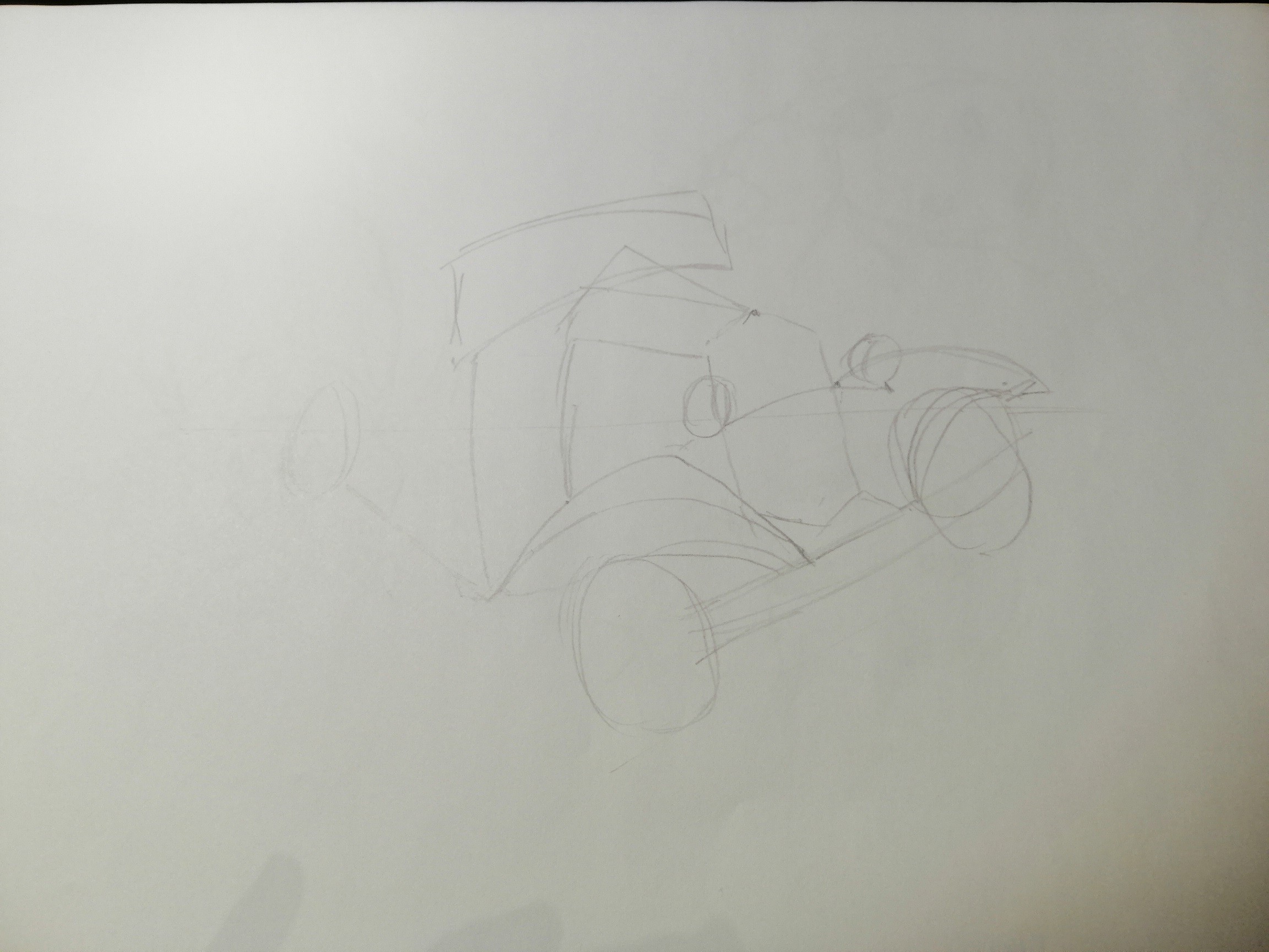 J'ai commencé par positionner les roues. Puis j'ai essayé de placer les grandes formes par rapport aux roues et au trait horizontal.