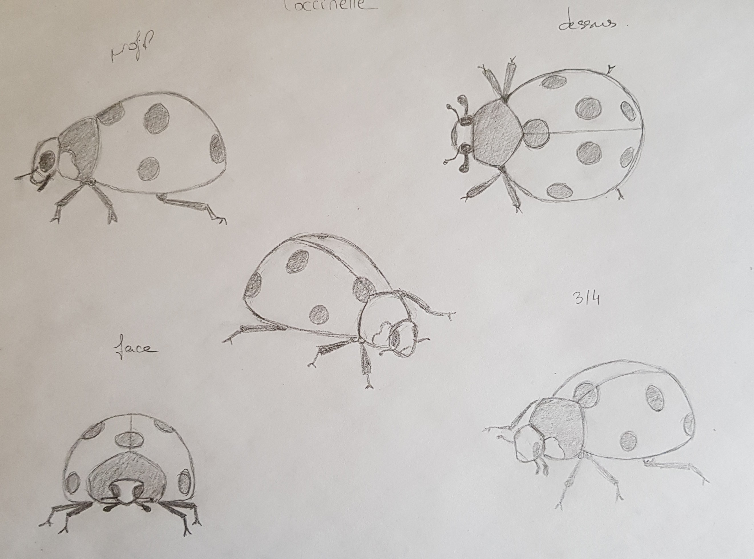 Je me suis retrouvée face à un probleme pour la coccinelle vue de dessus. Les pattes... Je ne sais pas comment faire pour la profondeur. Les pattes paraissent toutes petites... ça m'embête. Y a t il une solution ou bien doit on privilégier une autre vue pour le dessin?