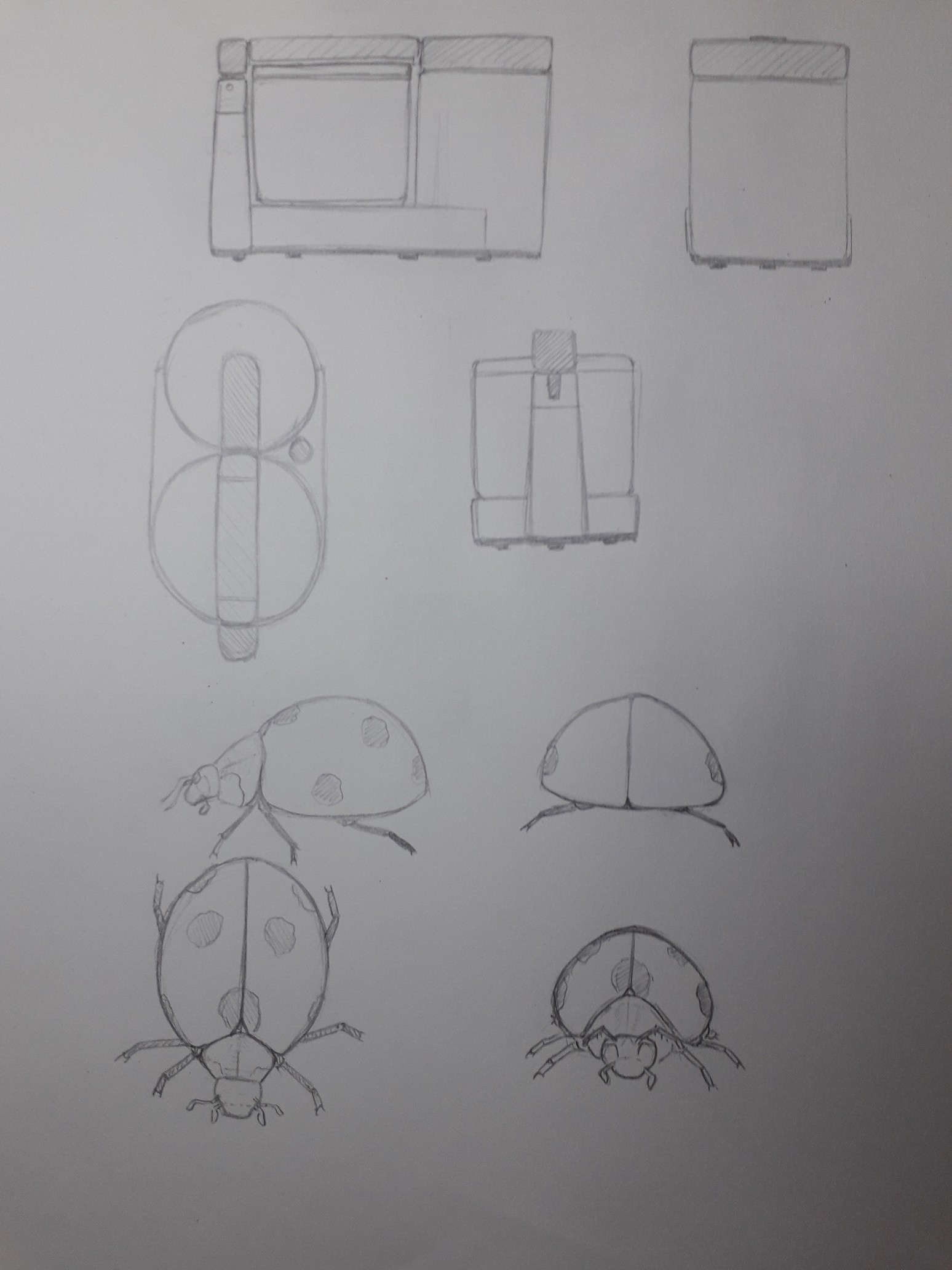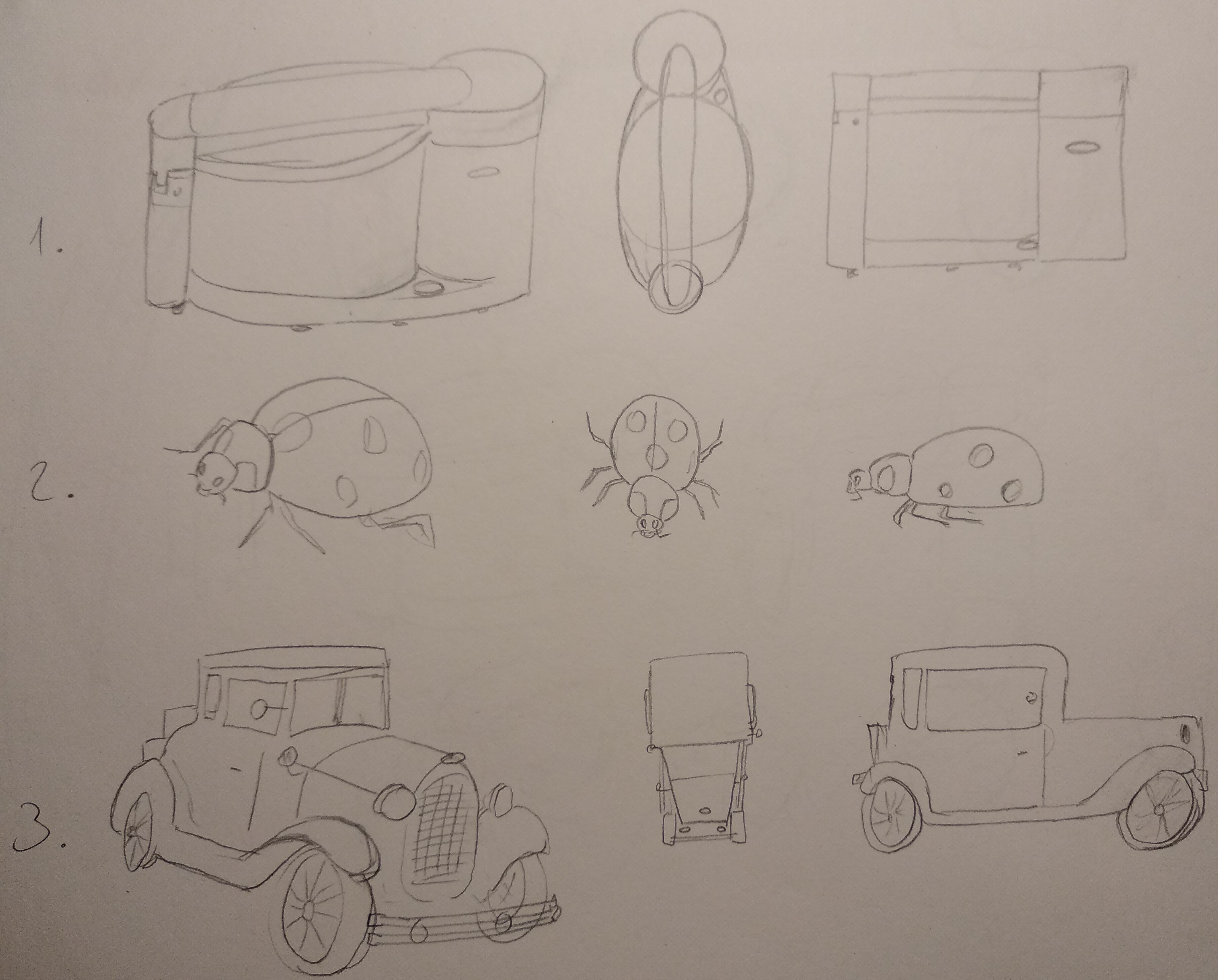La coccinelle est pas mal, sauf sur la vue de face et de profil (le dessous d'une coccinelle est plat, pas bombé), mais on comprend bien que c'est la même sur les différentes vues.