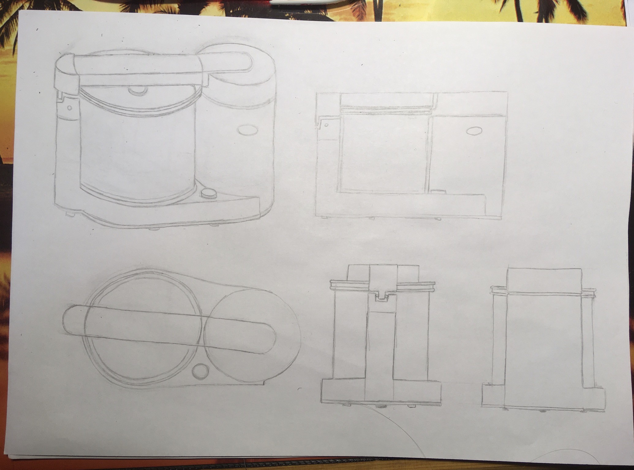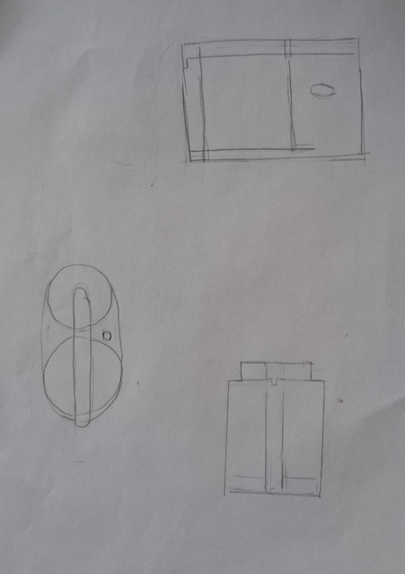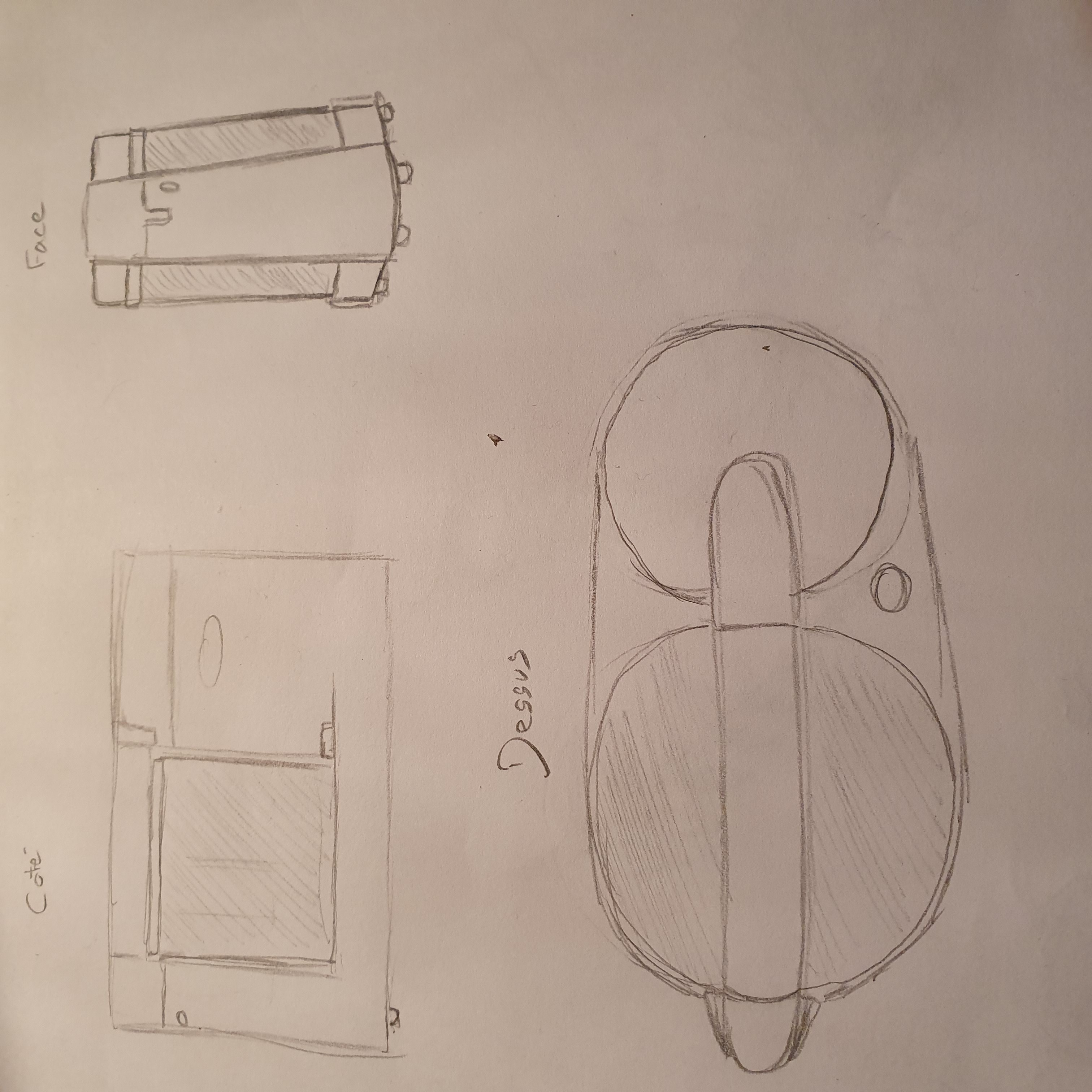 Bonsoir ! Voilà pour le 1er objet, 3 croquis de point de vue différents ( coté, face, dessus ... ) . Je sais pas si j'ai bien saisie le truc mais sa devrai être quelquechose comme sa xD