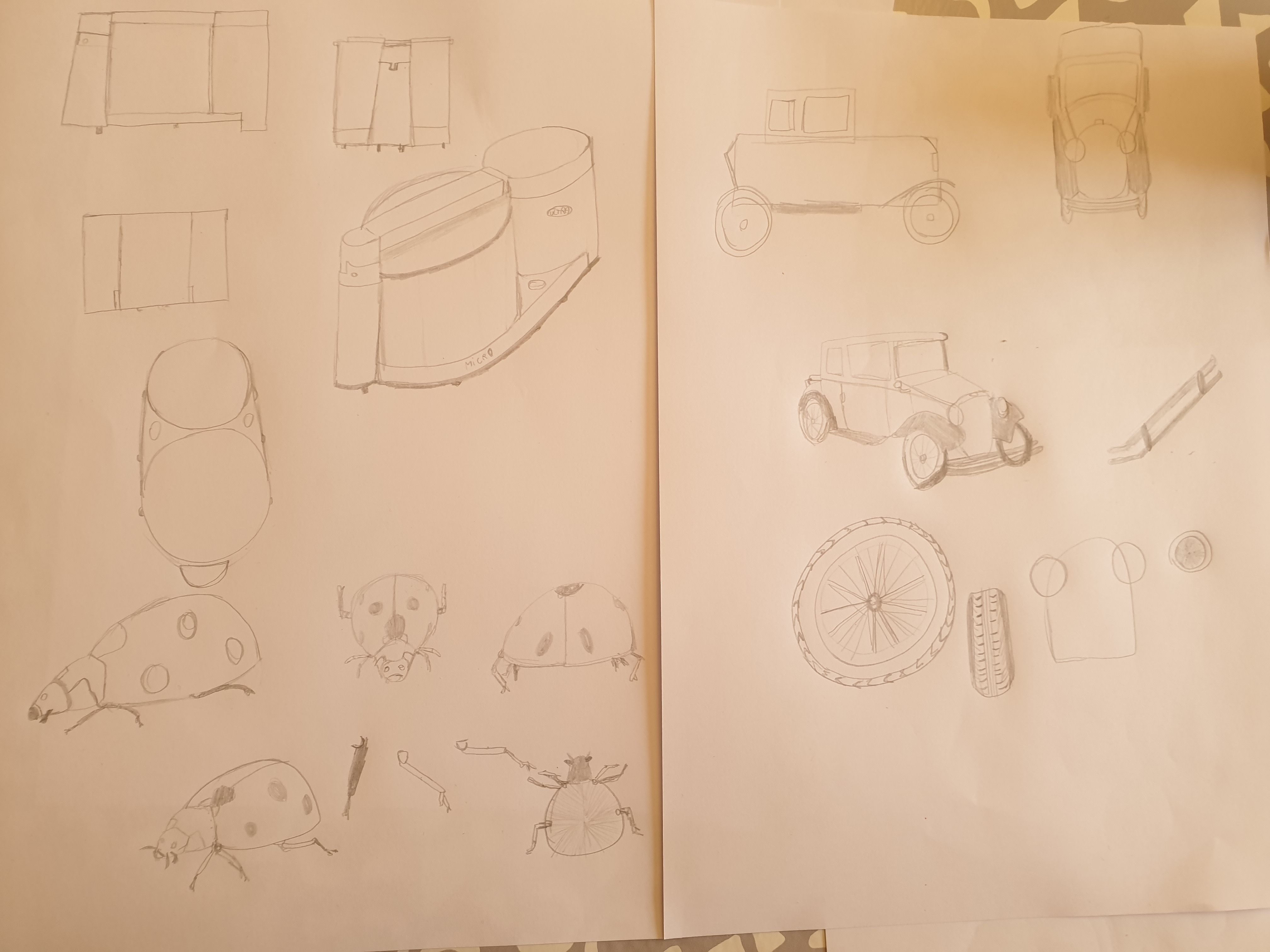 Voilà mes exercices. J’ai toujours commencé par essayer de simplement recopier l’object avant de le dessiner avec différents point de vue. J’ai l’habitude de dessiner presque toujours avec des photos, sans changer l’angle de vue, donc c’était un exercice plutôt compliqué pour moi. J’ai du mal avec les proportions, et la perceptive des objets.