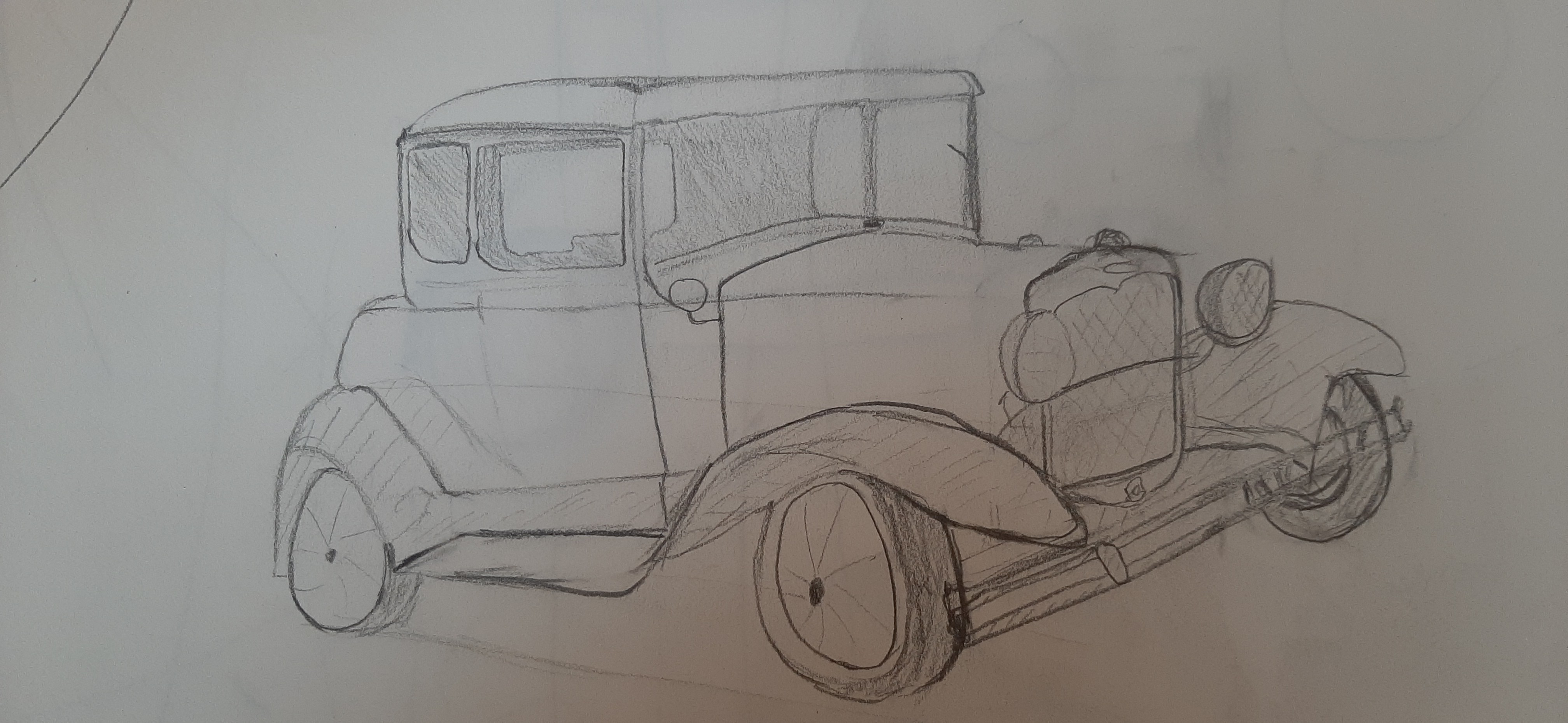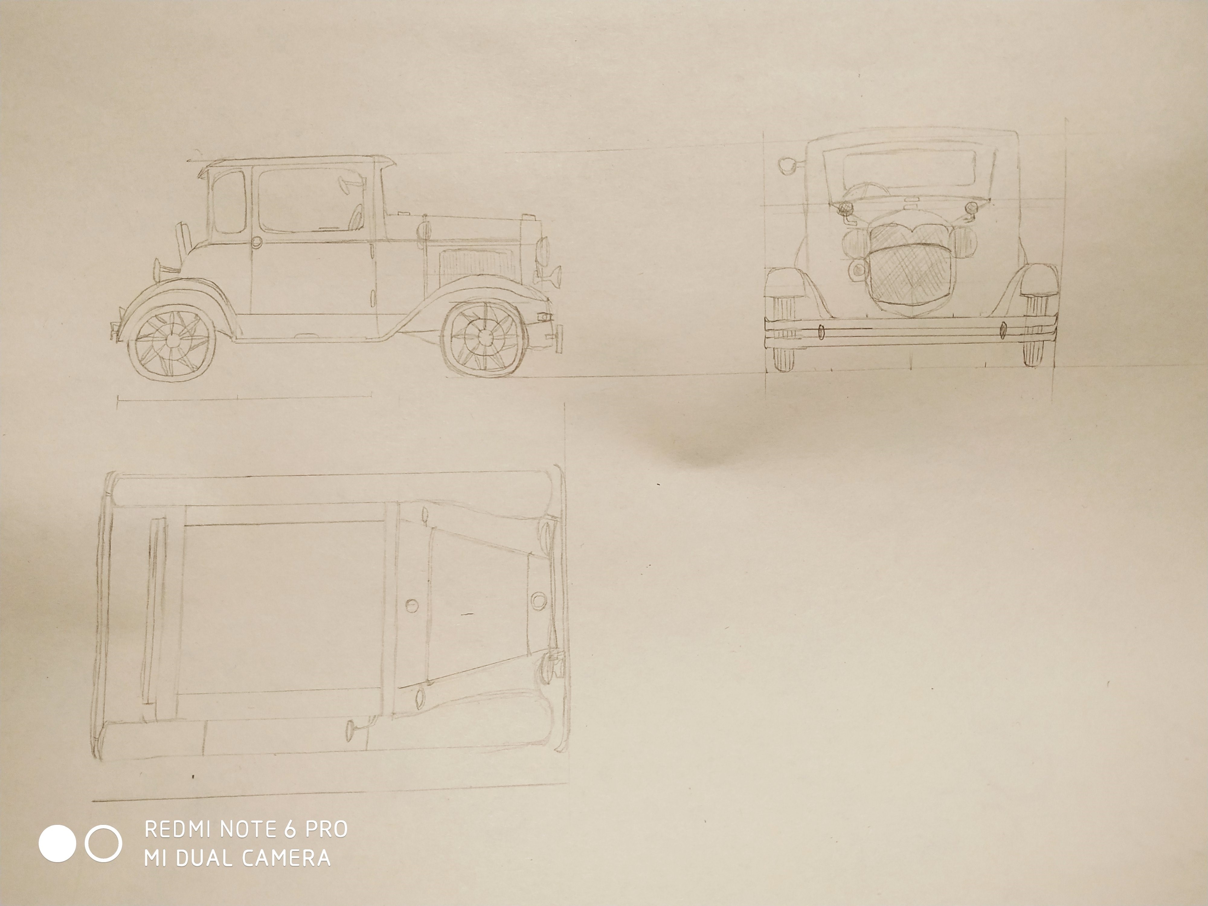 Surprisingly, it's the profile view, the one I thought would be the most difficult, which was the easiest and quickest for me to do. For the top view, I simply transferred the dimensions from my first drawing, but for me, the biggest challenge was the front view; I can't visualize how the front of the car will look (as you can see from the white space left).