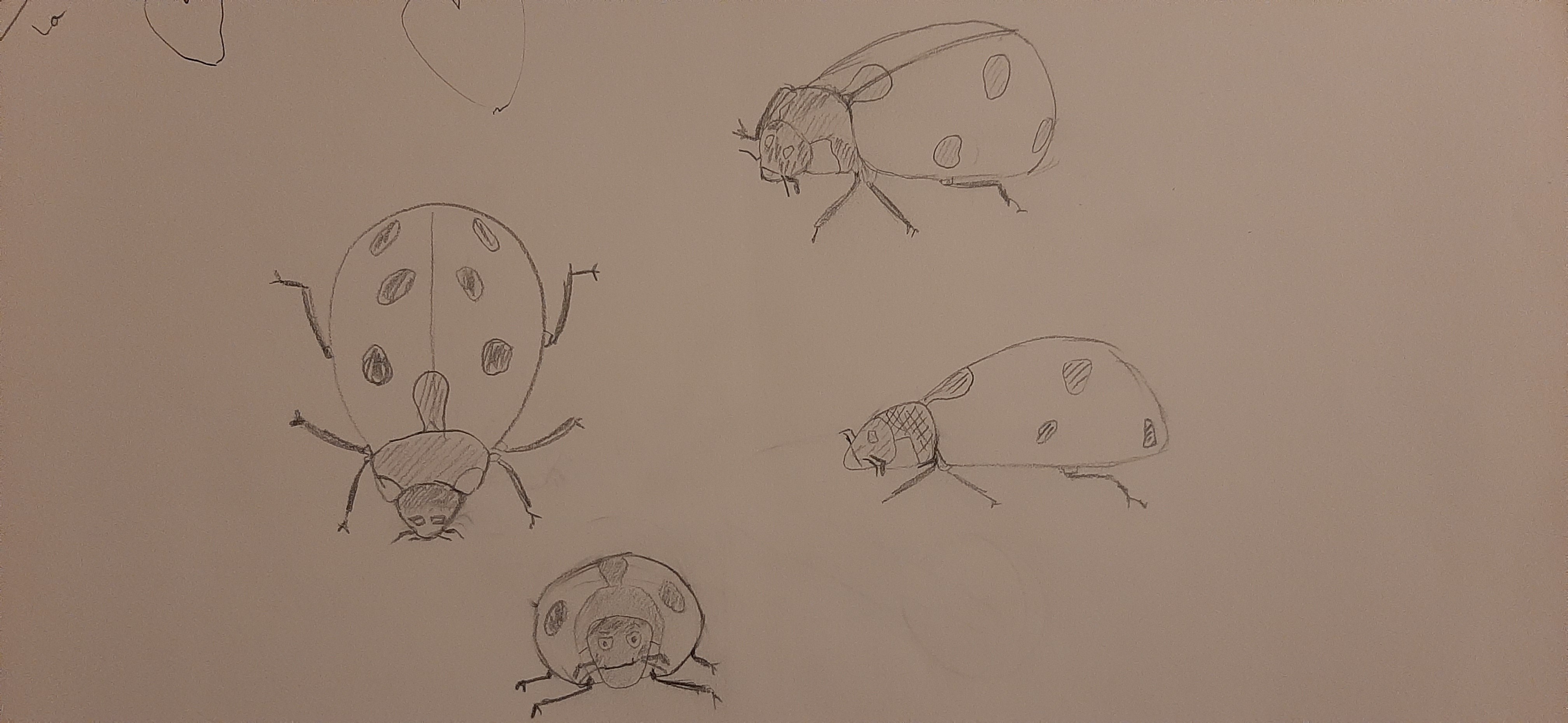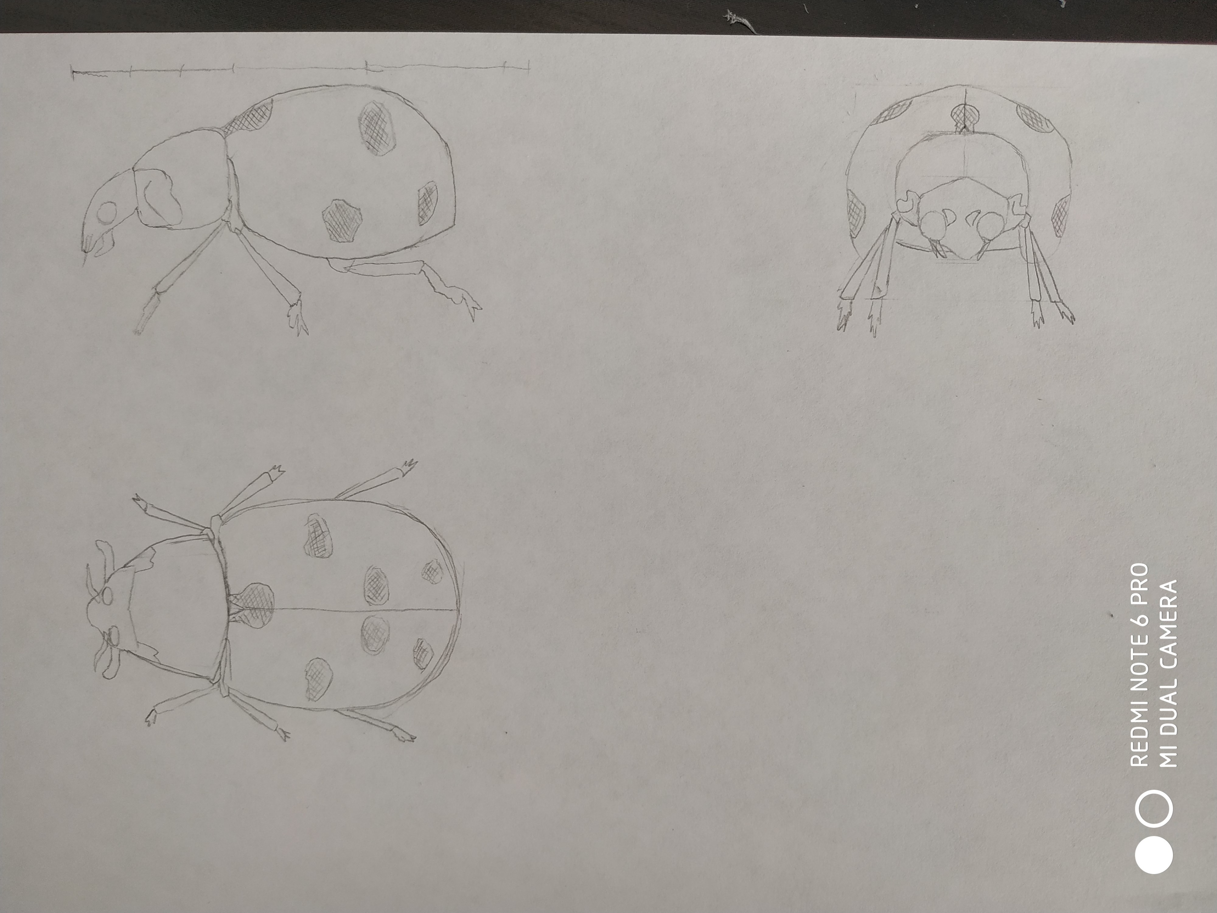 Here's the second exercise, the ladybug, which is really not easy at all! The hardest part for me was the front view, imagining the back of the ladybug and how it connected to the abdomen, in what way, etc. The drawing isn't very 'clean' because for now I only have slightly thick A4 paper and therefore no possibility to trace properly onto another sheet, so sometimes you can see old lines but I tried to make it as unnoticeable as possible.