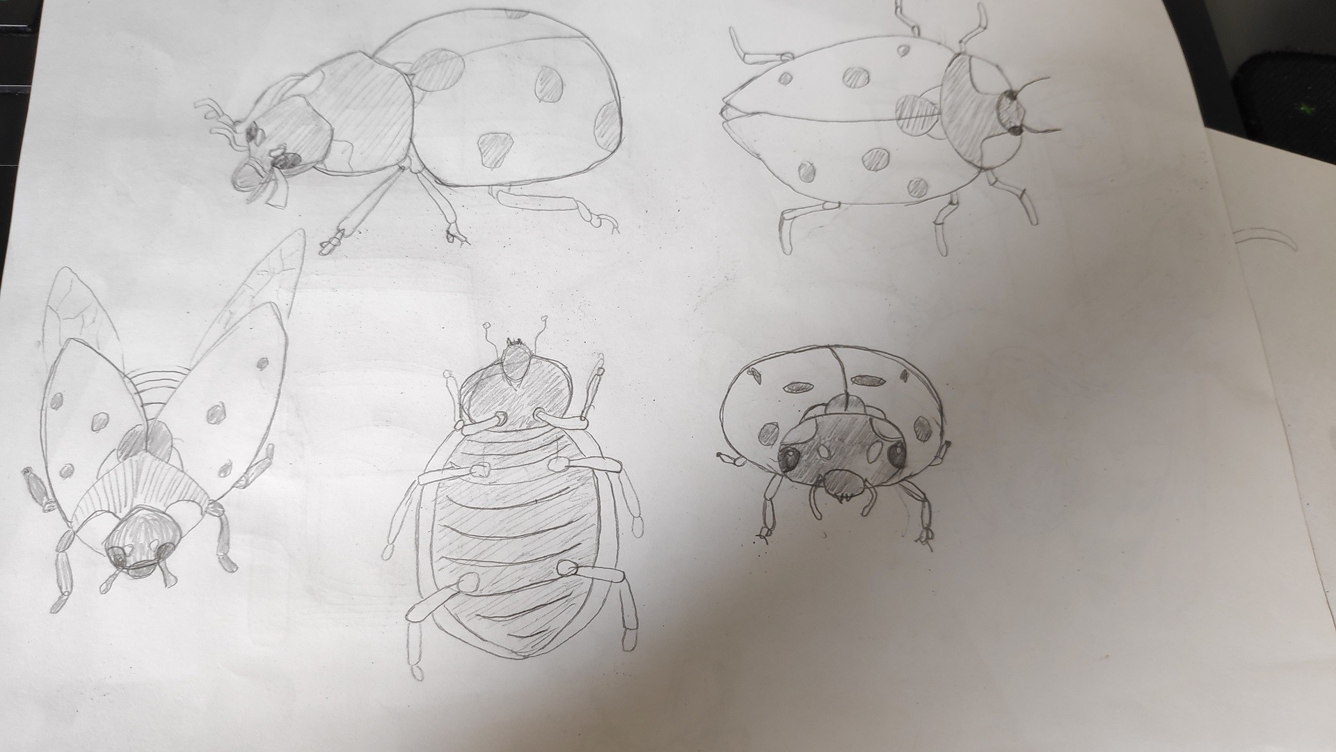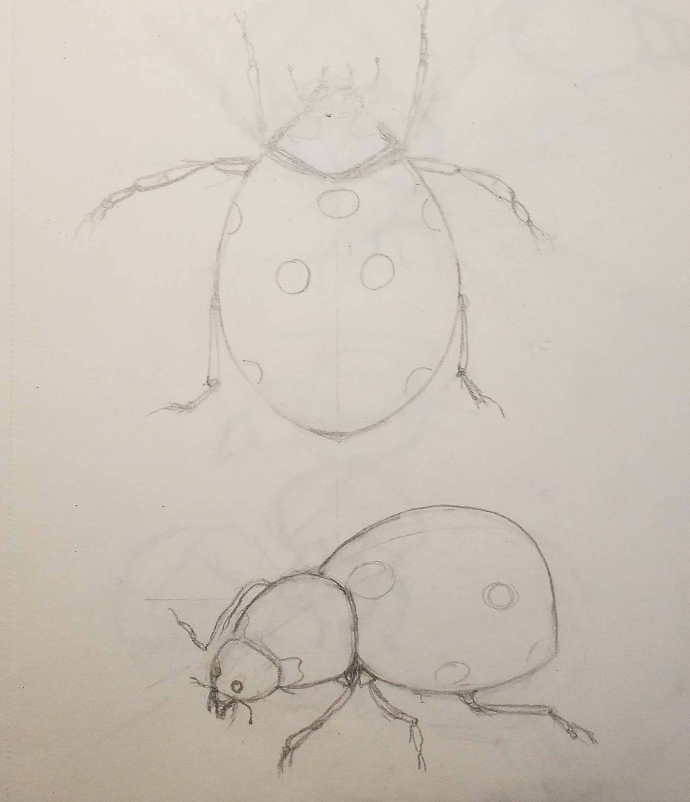 Hello, here is the study of the ladybug. After many failed drawings. I had to research on the internet, especially the front view because it's not easy for me to visualize. See you soon.