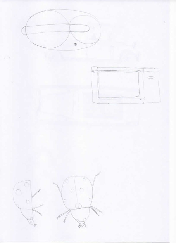 Voici mes planches pour la coccinelle et le robot (voir dessous), encore quelques difficultés avec la perspective et dans les proportions. J'ai l'impression que ma main n'arrive pas à suivre mon oeil/cerveau (c'est assez rageant ) mais je ne décourage pas.