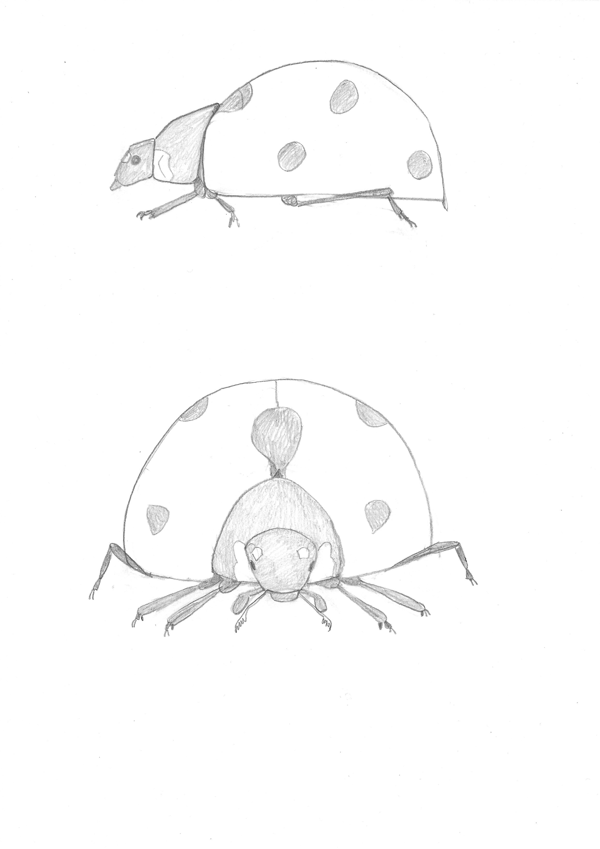 Pour ta coccinelle, le corps est pas mal, mais les pattes sont uuuuuuultra grandes. Je ne sais pas si tu as déjà eu une coccinelle dans la main, ou si tu en as déjà vue une de près, elles sont très très très proches du sol. Leurs pattes sont toutes petites et dissimulées sous leur corps.