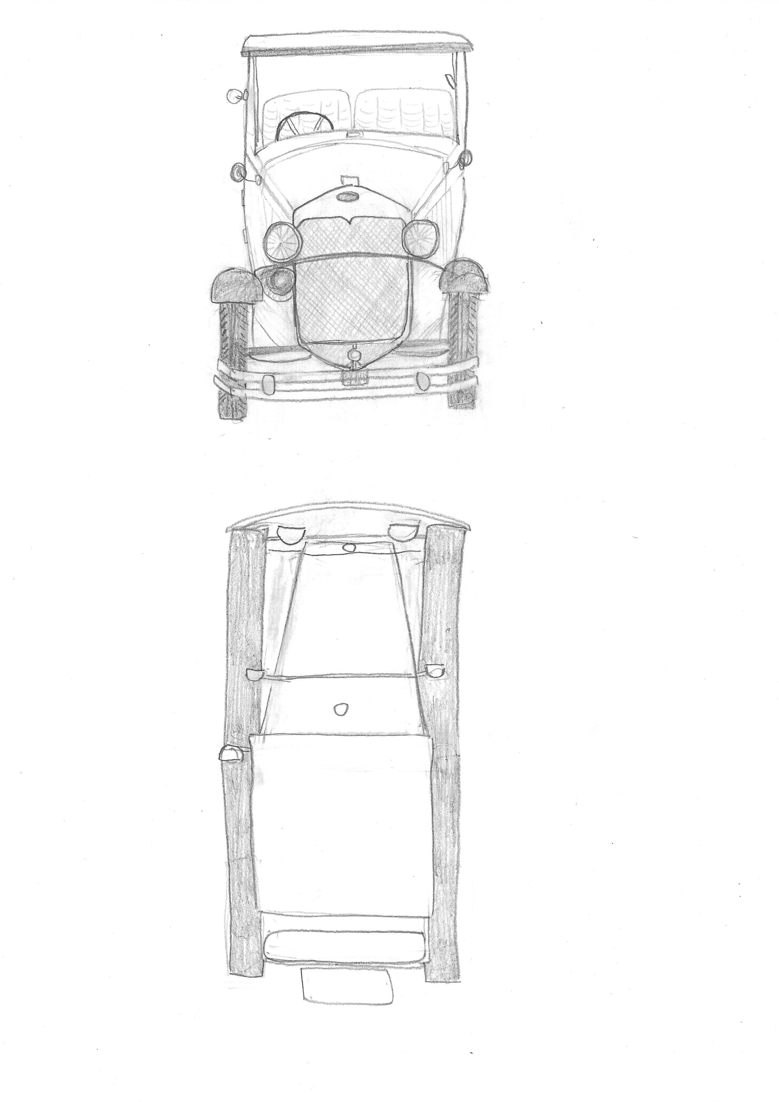 Here are my first drawings which I tried to do quite quickly to focus on the proportions. The perspectives for the car are a bit weird.
