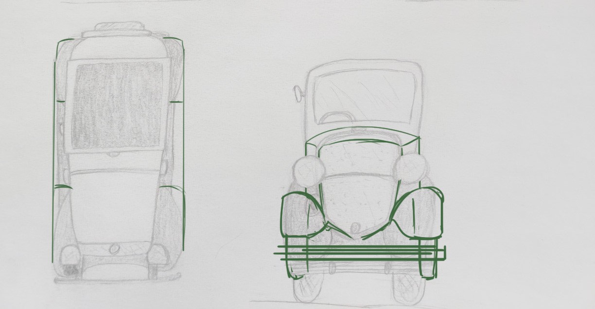 Sur la vue de face on n'est pas plus du tout raccord au modèle sur la forme du capot. Les garde-boue ne descendent plus autant à l'avant, l'habitacle est plus haut. Pense à construire avec des formes simples ça t'aidera ^^ Le capot c'est un demi-cylindre qui se rétrécit à l'avant :)