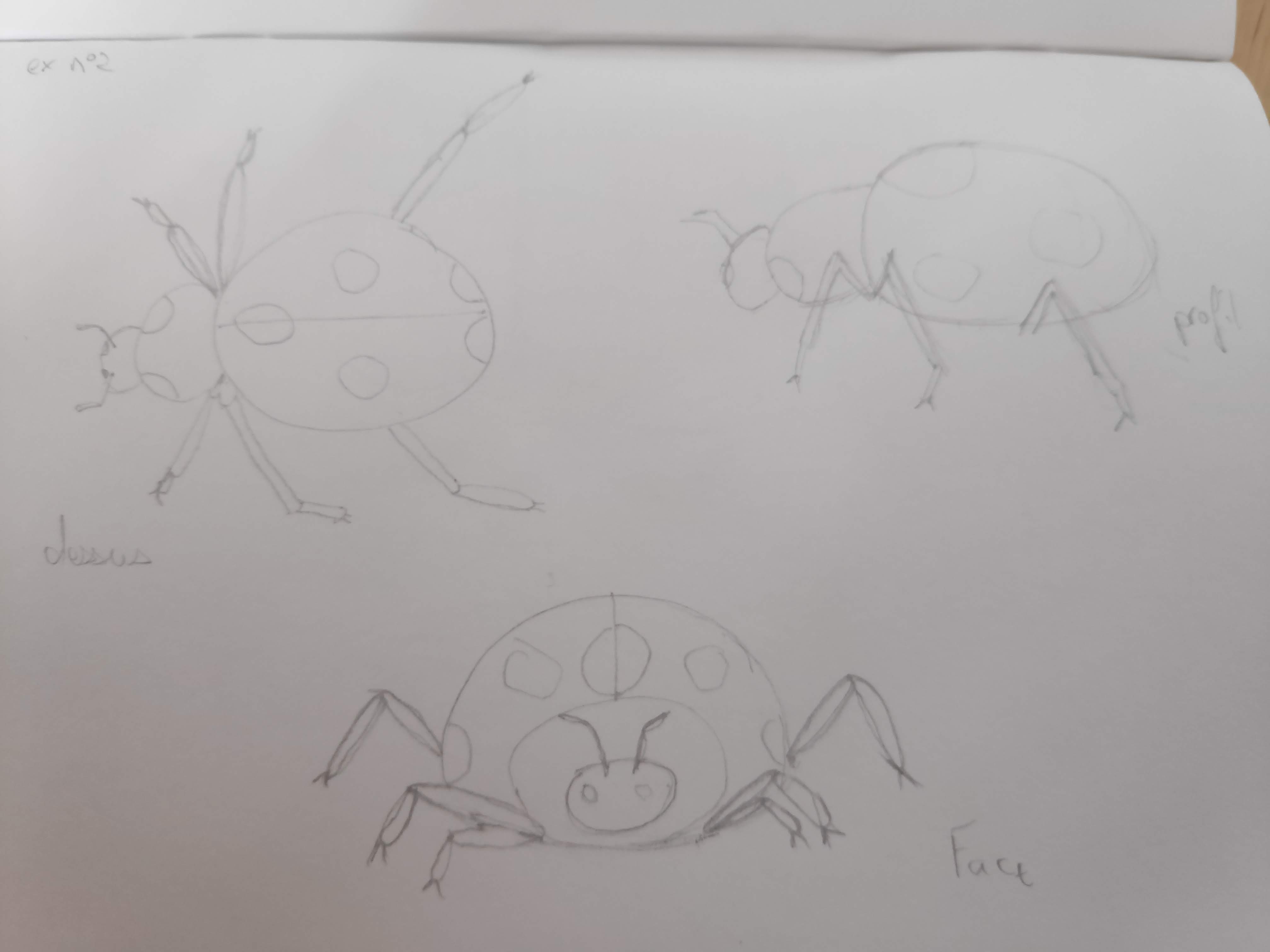 Merci. Oui pour la coccinelle j’ai en effet regardé des images sur internet car j’avais du mal à comprendre sa tête surtout. En regardant ensuite la correction j’ai compris que je m’étais embêté « pour rien » et qu’il fallait juste simplifier les formes comme on les pensait.😇