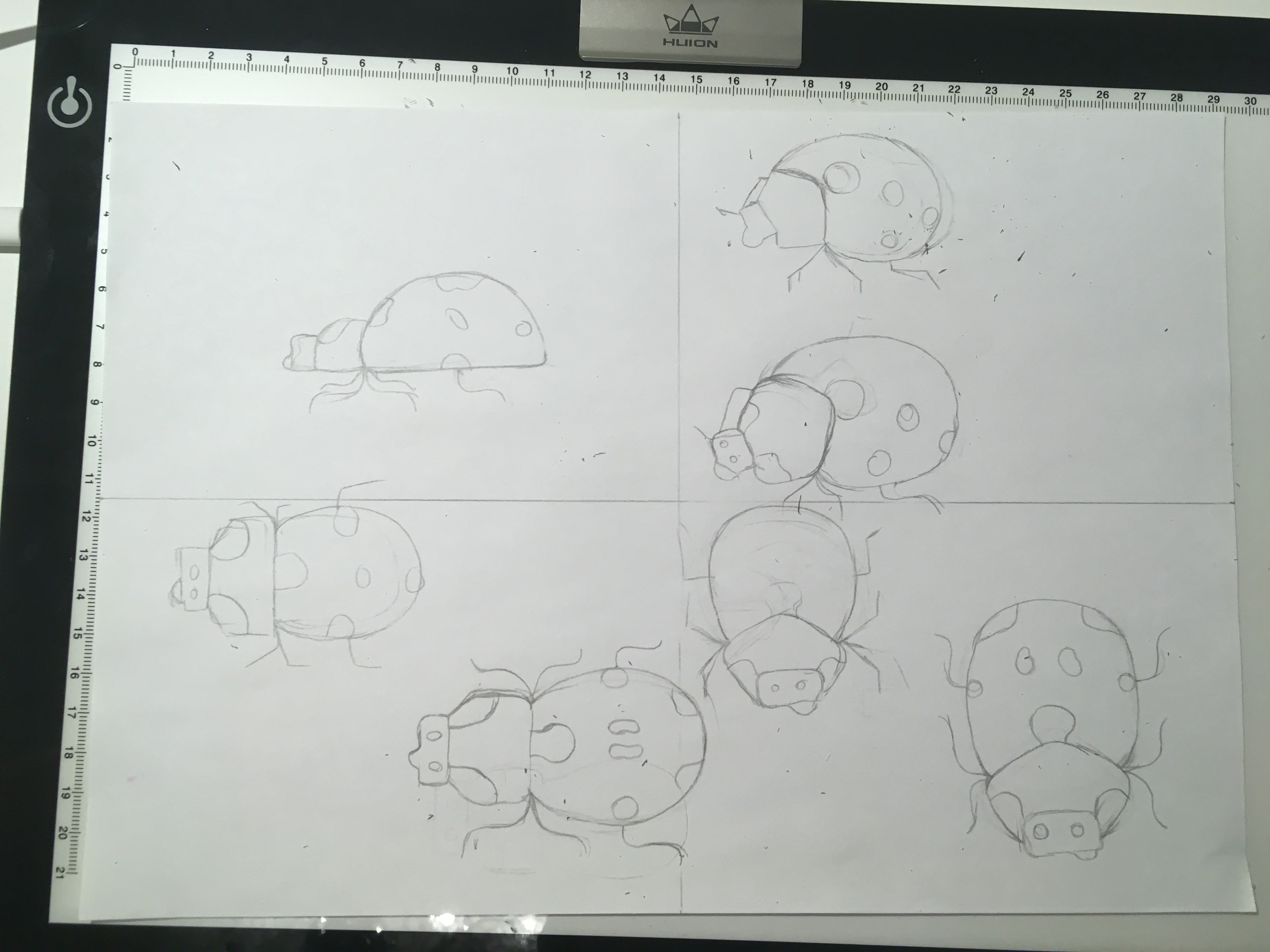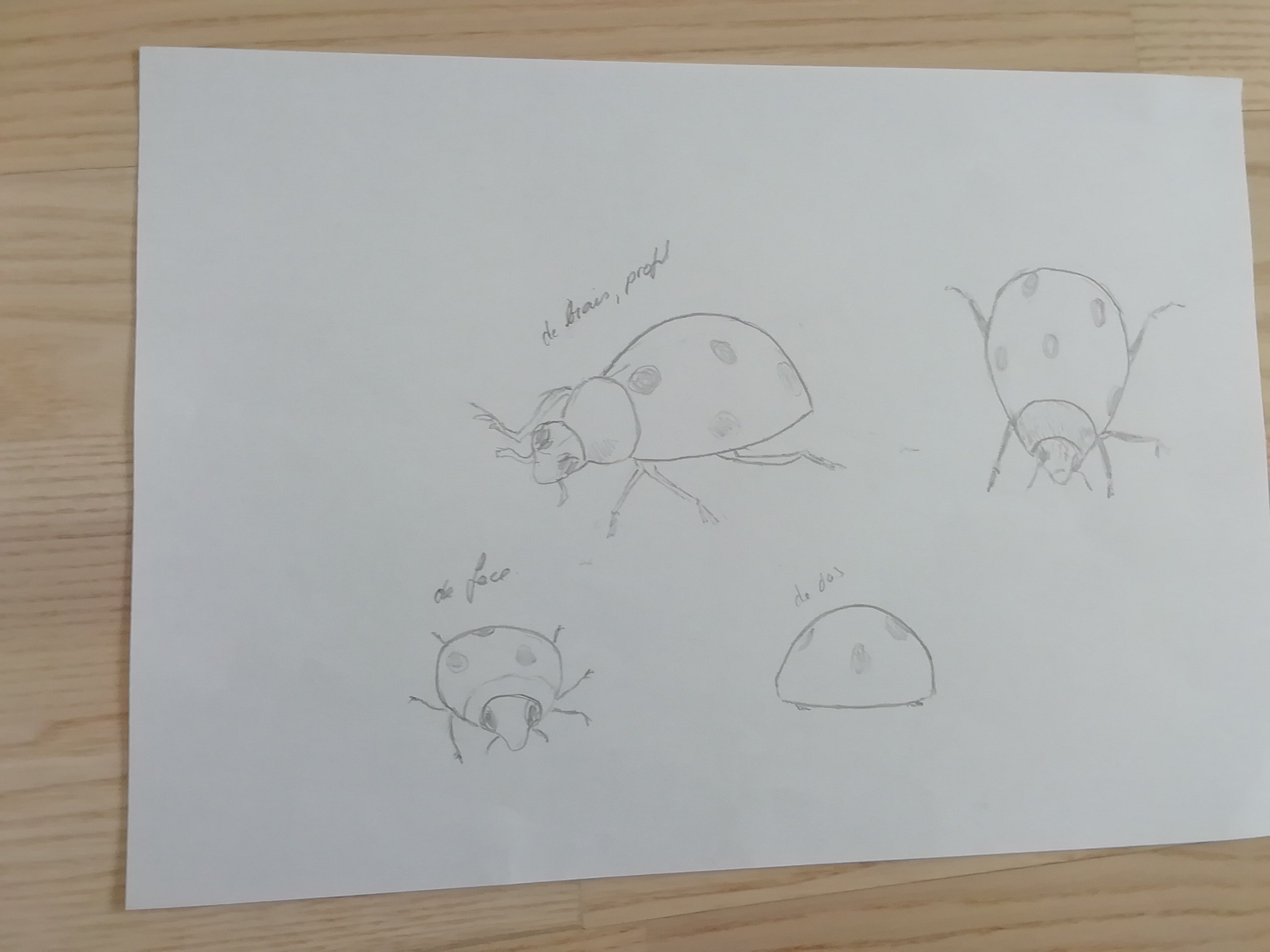 Pour la coccinelle on est pas mal, n'oublie pas la ligne qui délimite les parties droite et gauche de son dos. Et la vue de face n'est pas de face mais plutôt vue de dessus. Il manque une patte sur la vue de dessus aussi ^^ Et il n'y a pas de pattes sur la vue de dos.
