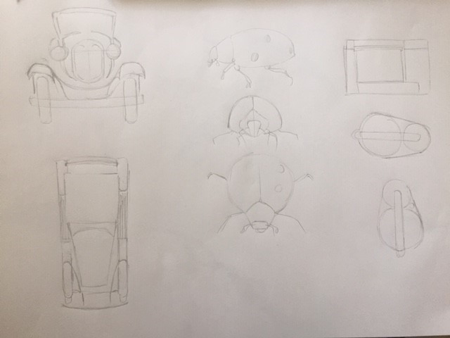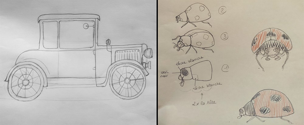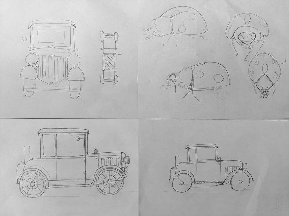 Be careful with the ladybug in terms of the proportion of the head relative to the body, and also pay attention to the length of the legs. For the car, we're pretty good, you just changed the proportions in the front view. You've reduced the width of the car's body and widened the fenders and wheels (when compared to the top view right next to it, it's blatant ^^). We should not see the rear wheel fenders, they are as high as the front ones ^^