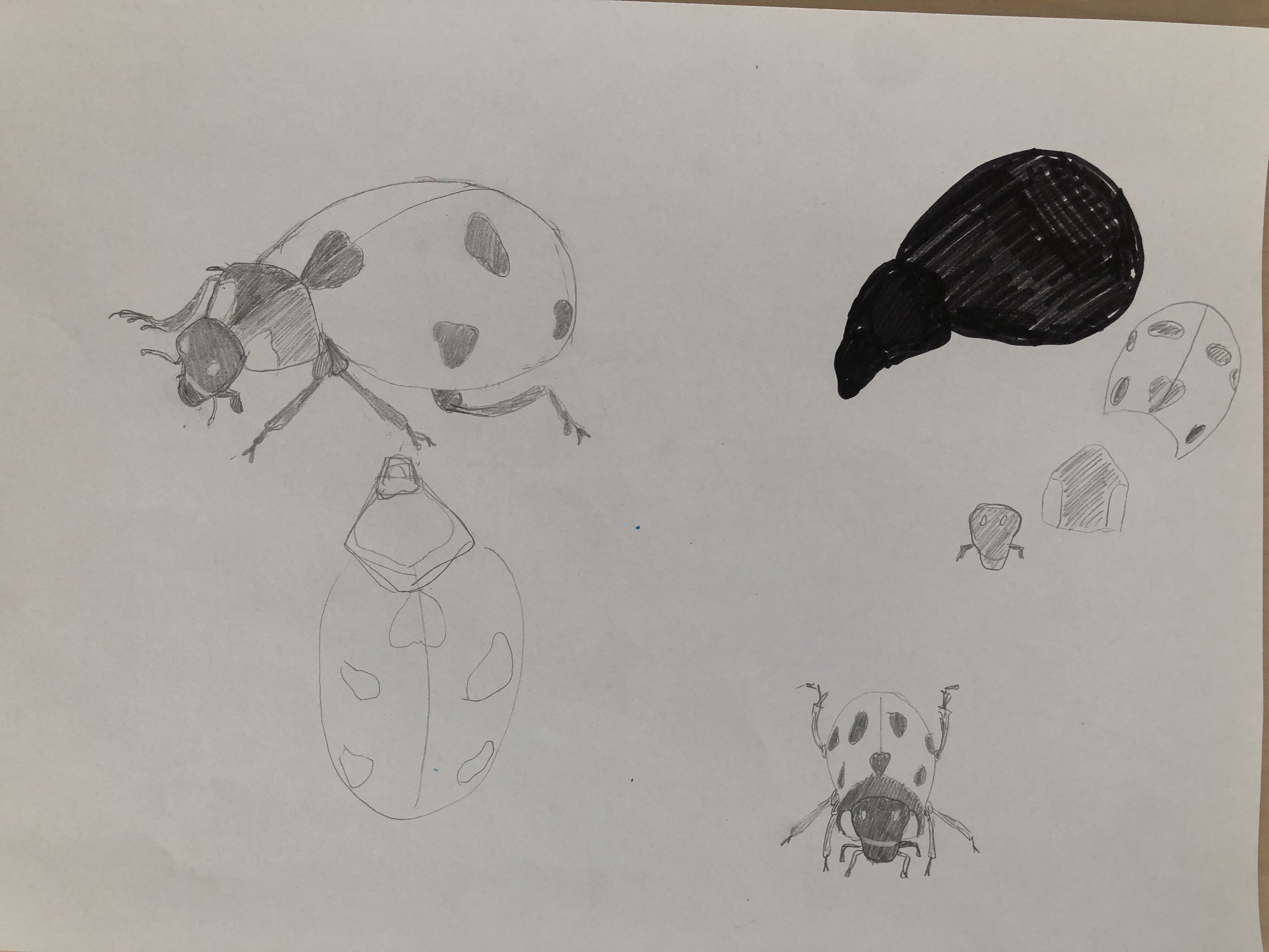The ladybug is nice, but be careful with the proportion of the head + neck which is too big compared to the body in your drawings.