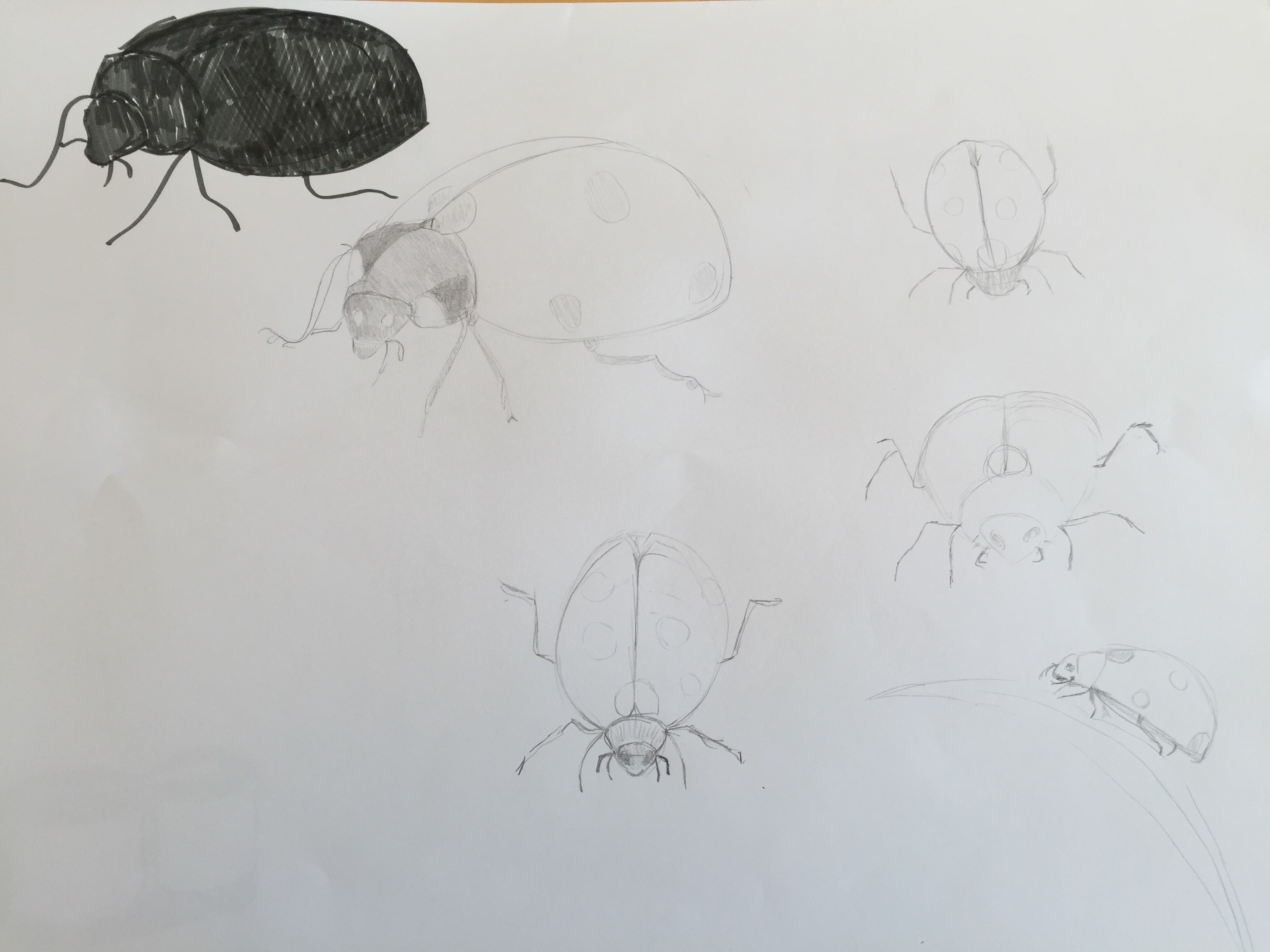 La coccinelle est plutôt cool de profil, normalement le dessus est plus plat et attention à la proportion de la tête de manière générale. Chez toi le cou + la tête occupent une trop grande surface. Pour la vue de face par contre, comme dit juste avant, le dessous est plat normalement. Et sur la vue de dessus, elle a de trèèèèèèès longues pattes. A part ça c'est pas mal 👍