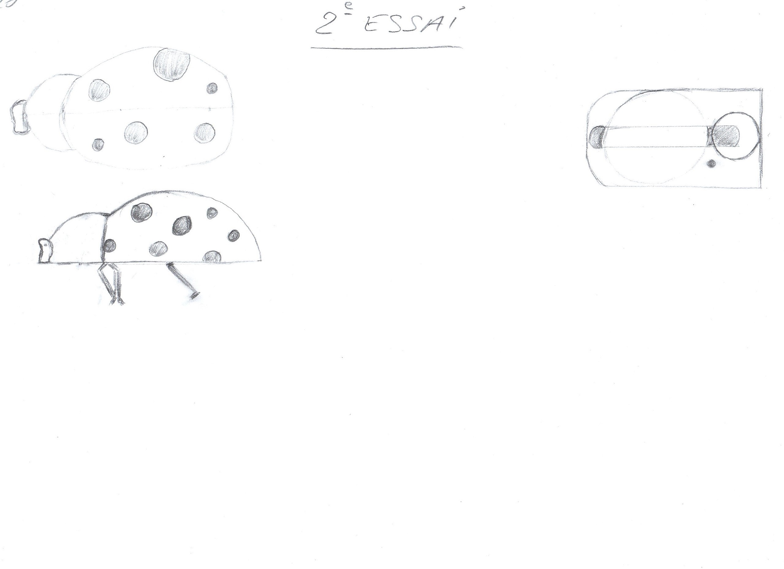 Pour la coccinelle, attention à la taille qu'occupe la tête + le cou par rapport à la taille du corps. Chez toi ça occupe plus d'un tiers de la taille totale de la coccinelle : c'est beaucoup trop. Du coup le corps est trop petit, pas assez large et bombé.